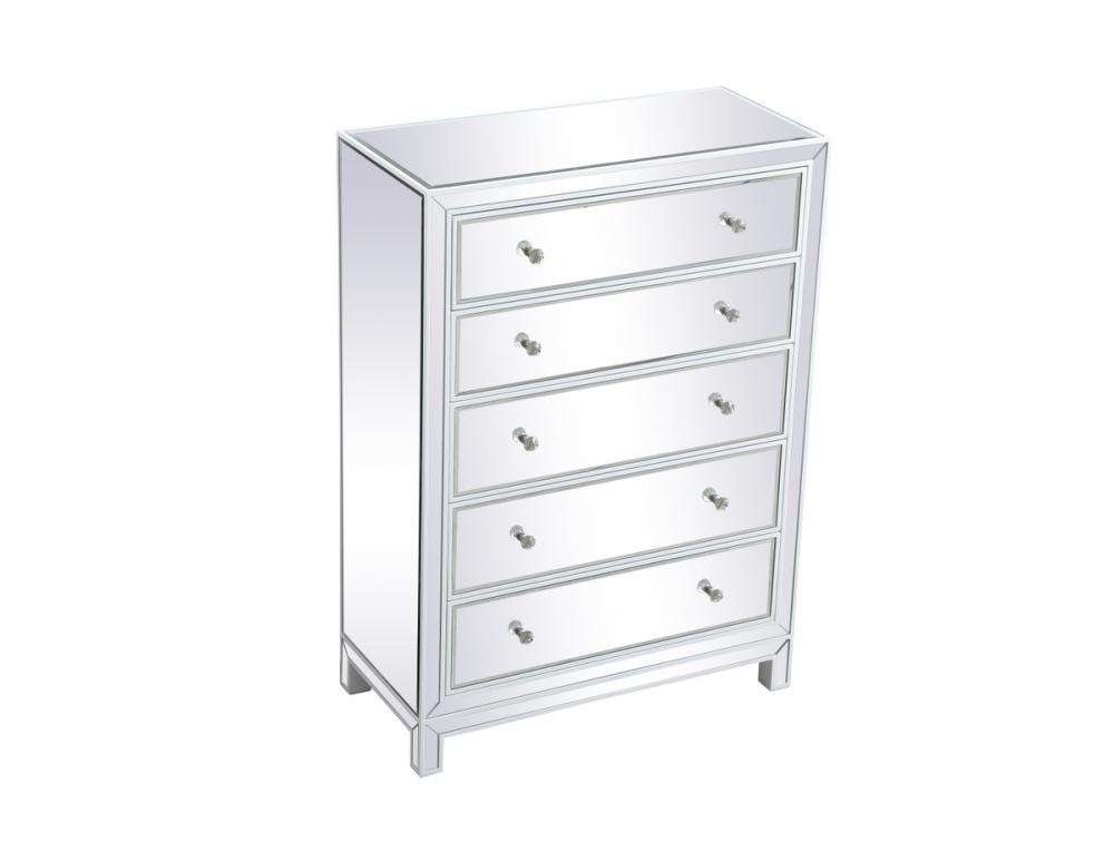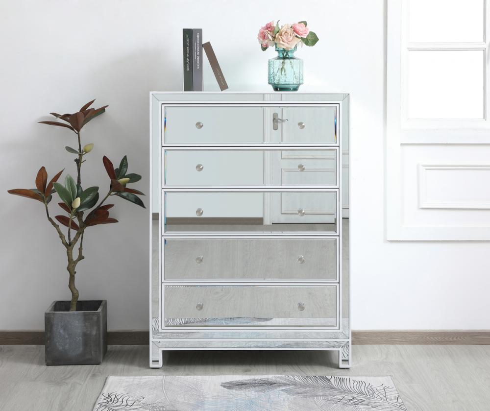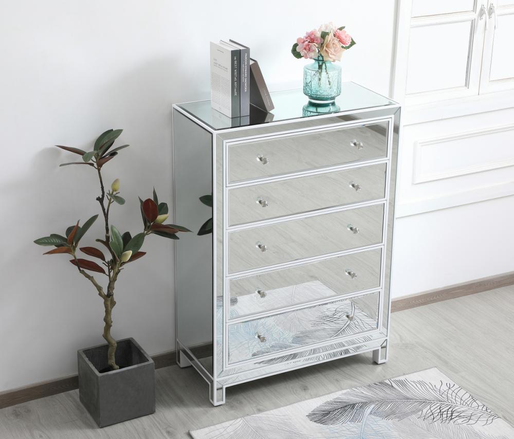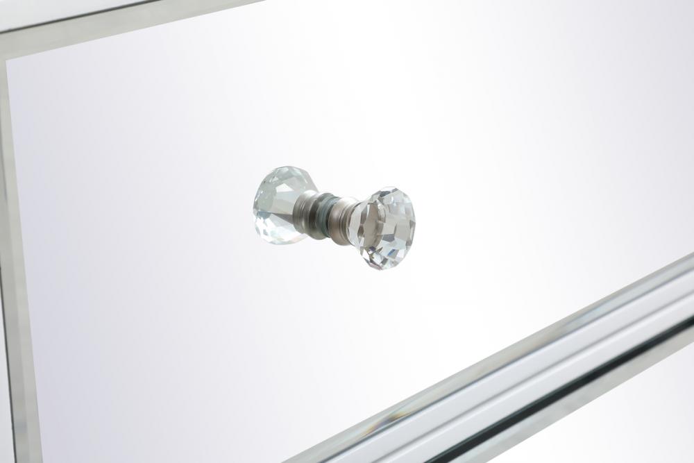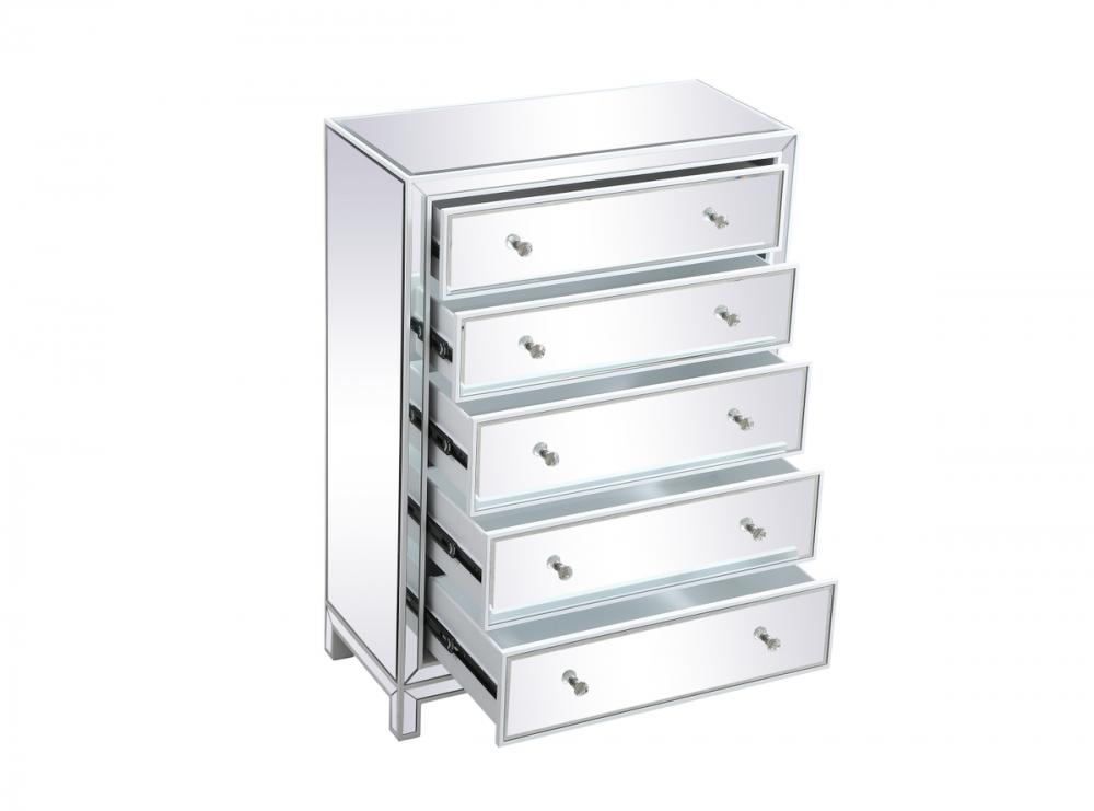 A perfect combination of style and functionality, this five drawer dresser provides plenty of storage space. The high quality beveled mirror panels are enhanced with hand painted trims. The crystal knobs, in addition to the distinctive mitered corners, evoke richness and glam.