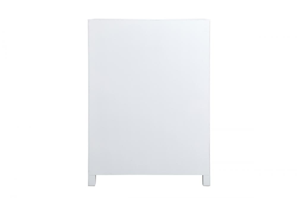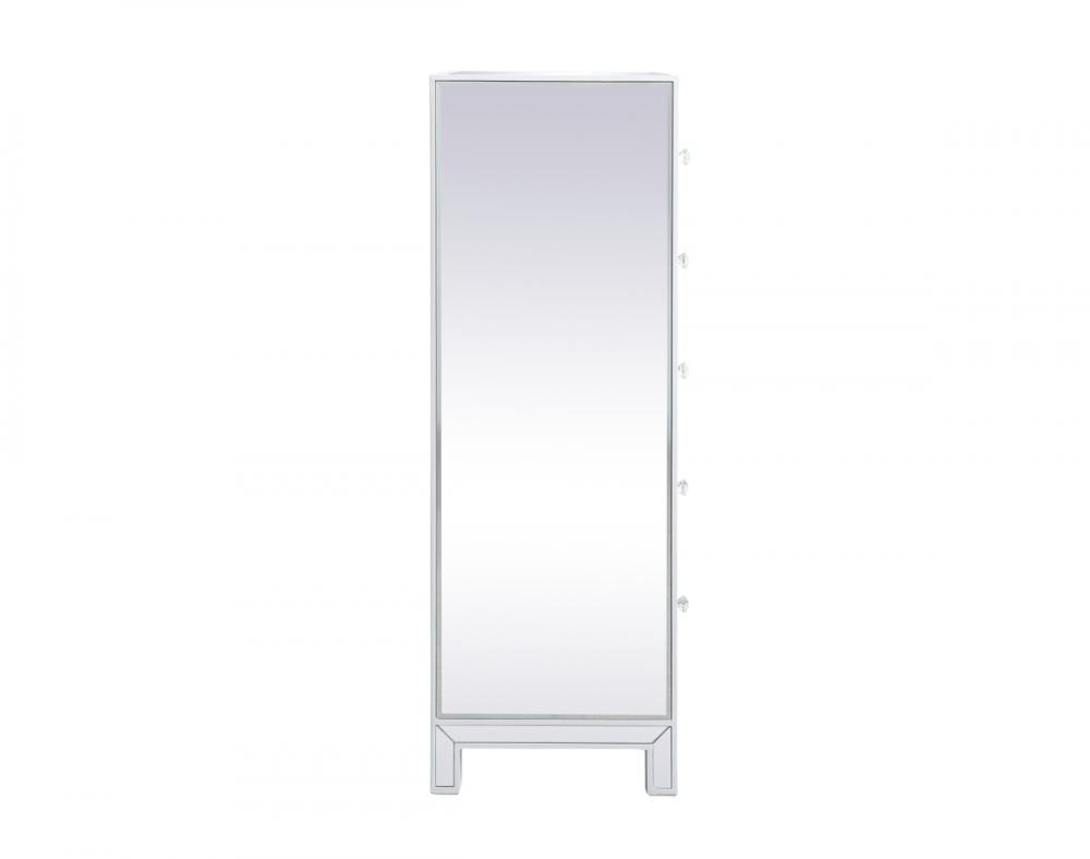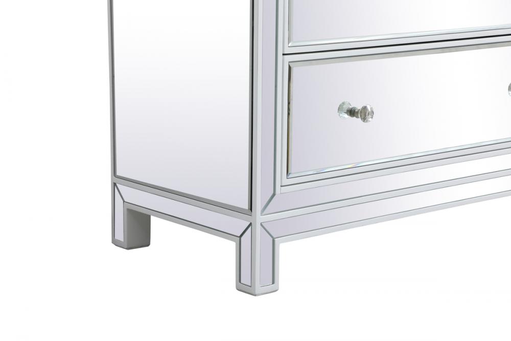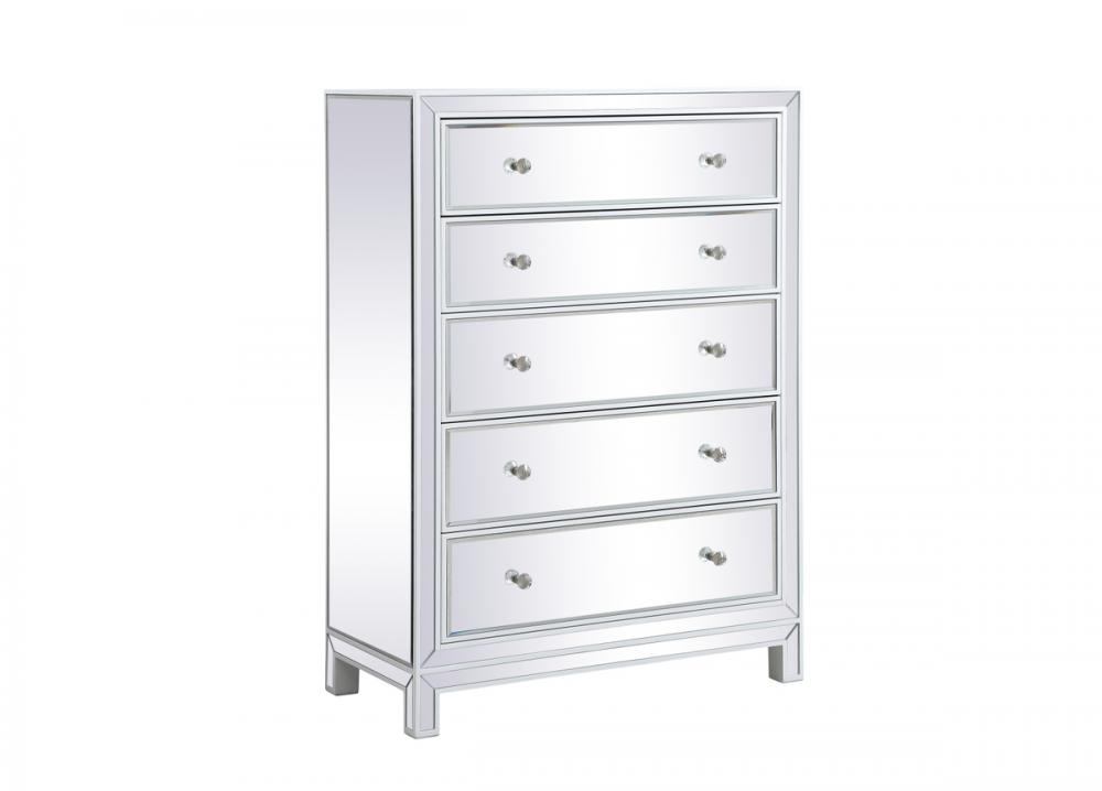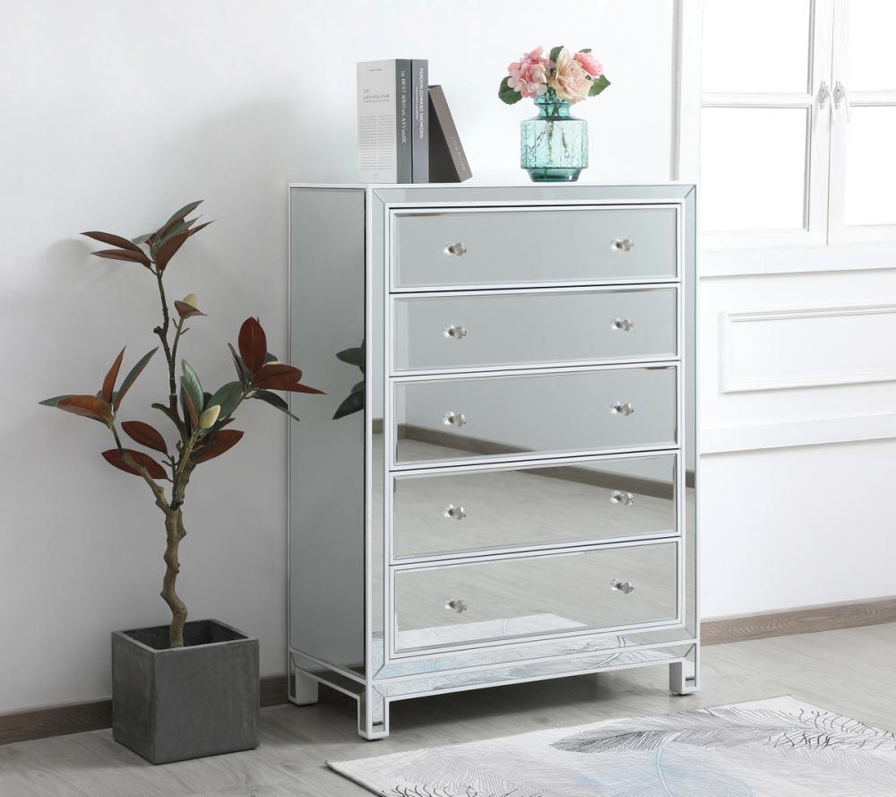 A perfect combination of style and functionality, this five drawer dresser provides plenty of storage space. The high quality beveled mirror panels are enhanced with hand painted trims. The crystal knobs, in addition to the distinctive mitered corners, evoke richness and glam.