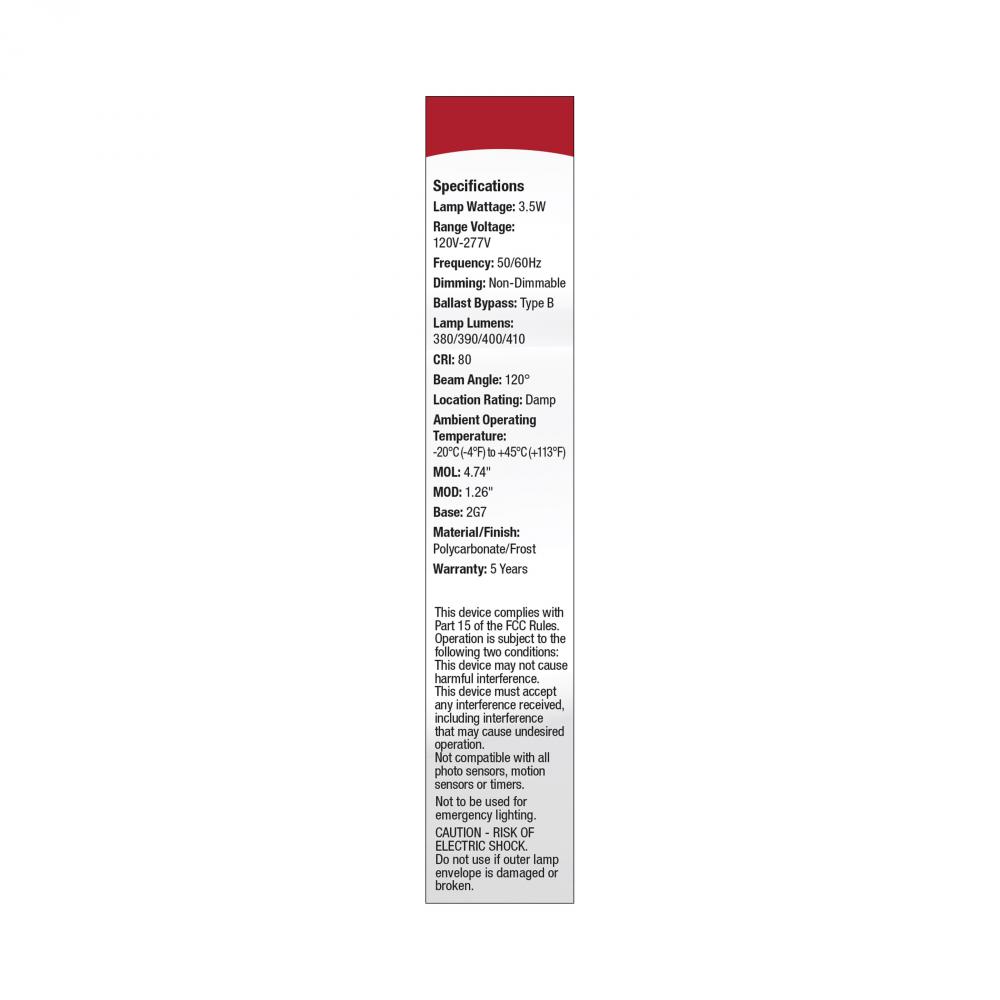 3.5 Watt; 2G7 Base; 27K/30K/35K/40K CCT Selectable; Frost Finish; Ballast Bypass; 120-277 Volt