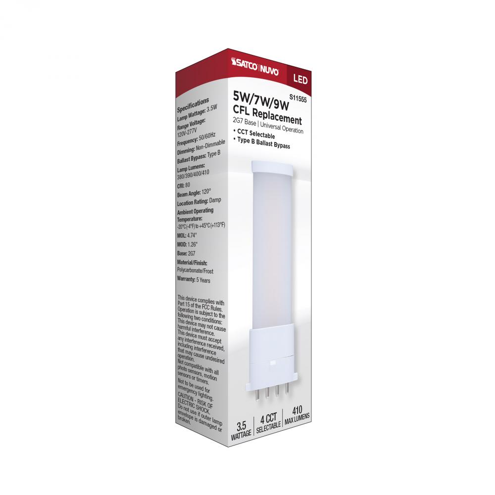 Upgrade your compact fluorescent lighting with SATCO NUVO's S11555 3.5W Type B LED lamp. Designed to bypass the ballast for direct wiring to the electrical system, this lamp replaces 5W, 7W, and 9W CFL lamps with a 2G7 base. It offers 4 CCT selectable
