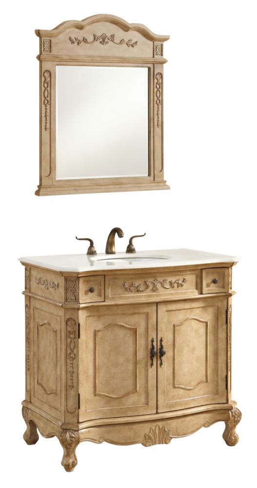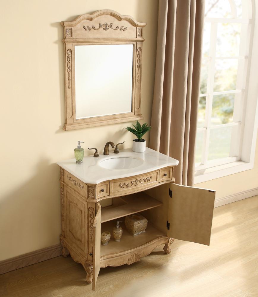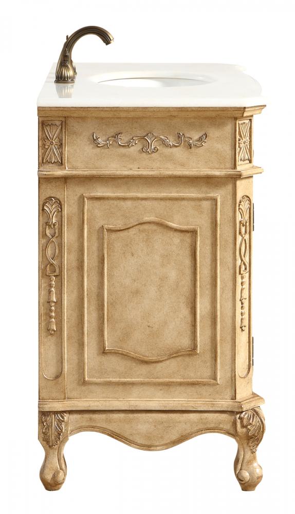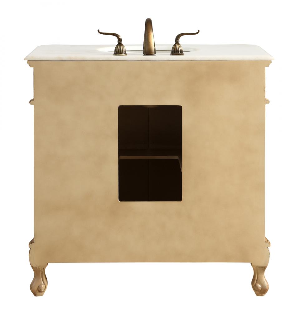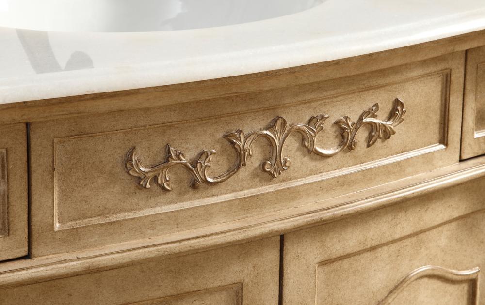 This superb balance of timeless tradition and opulent beauty in a marble-topped vanity will certainly enhance the aesthetics of any home or office bathroom! Featuring an authentic natural white marble countertop—occasionally with light brown veining, complimenting the hand painted antique beige cabinet—oval white porcelain under mount sink, 2 doors with a shelf inside, 2 side drawers, accented by antique bronze finish door knobs, a superbly carved floral design, stands on stylishly carved solid wood French scroll feet. A truly rich statement of luxury! Measurements: W36” x D21” x H35”, fully assembled.