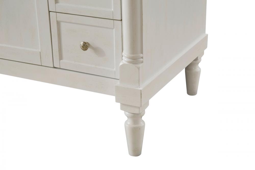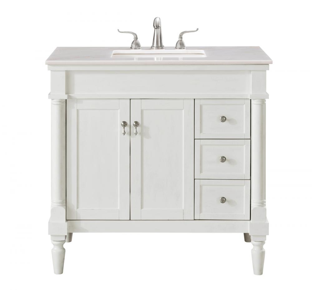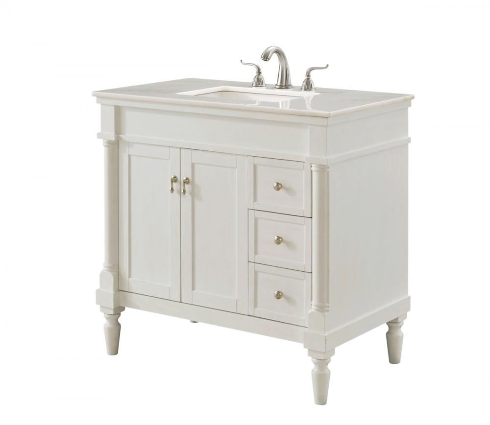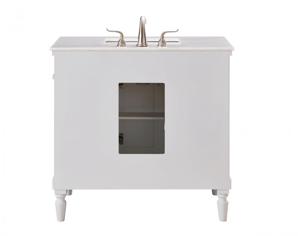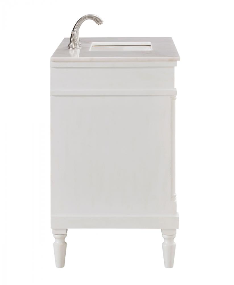 This traditionally styled, yet fashionably designed vanity can add distinction and grace to your home or office bathroom. Beautifully combining a lustrous natural white marble countertop with a large rectangular white porcelain under mount sink, and a hand painted antique white 2-door cabinet with a shelf inside, 3 full extension drawers, brushed steel door pulls, standing on turned, tapering legs. You’ll enjoy its charming allure for many years to come. Measurements: W36” x D21” x H35”