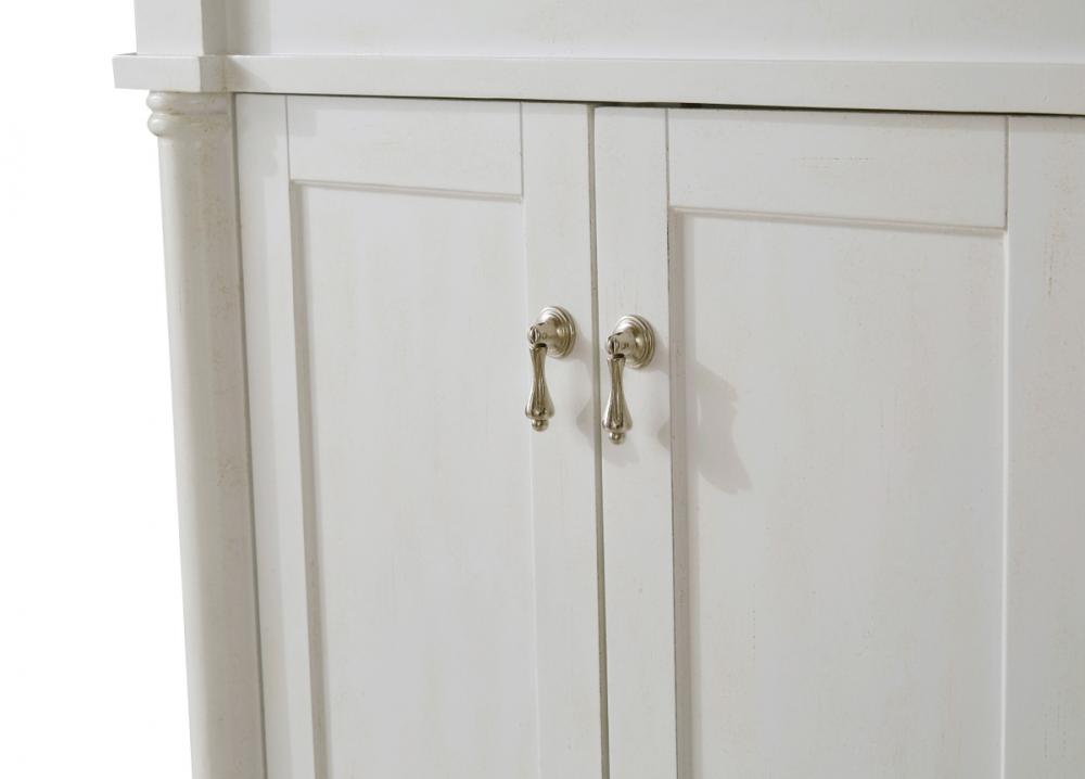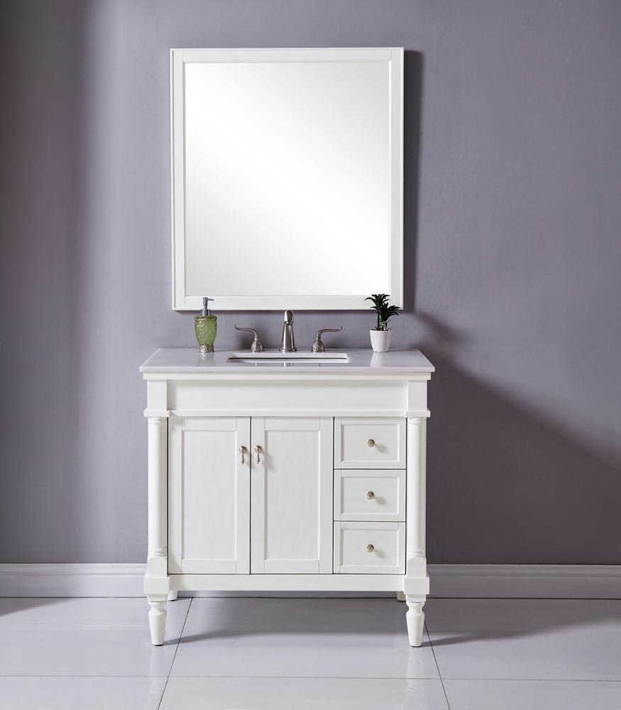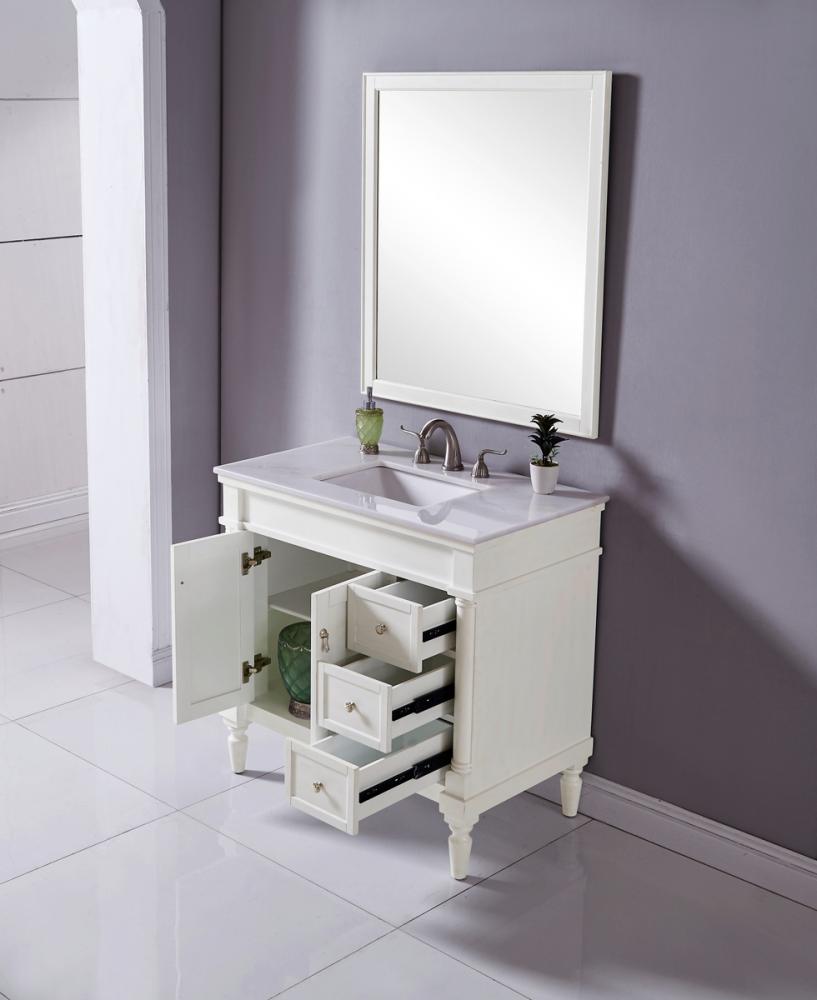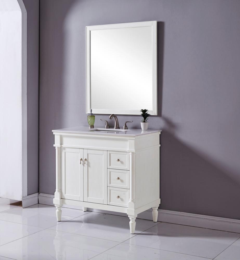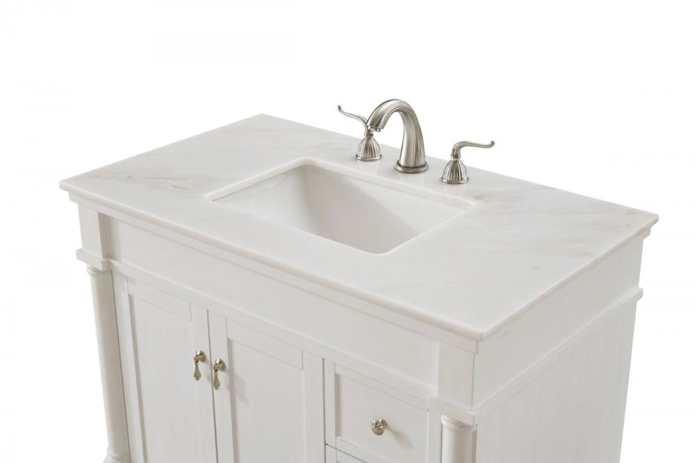 This traditionally styled, yet fashionably designed vanity can add distinction and grace to your home or office bathroom. Beautifully combining a lustrous natural white marble countertop with a large rectangular white porcelain under mount sink, and a hand painted antique white 2-door cabinet with a shelf inside, 3 full extension drawers, brushed steel door pulls, standing on turned, tapering legs. You’ll enjoy its charming allure for many years to come. Measurements: W36” x D21” x H35”