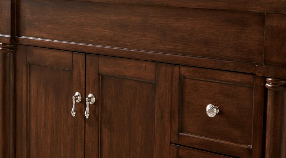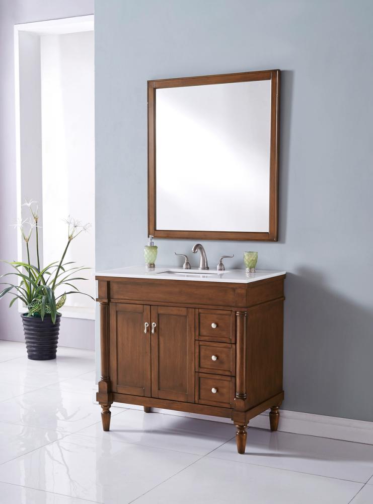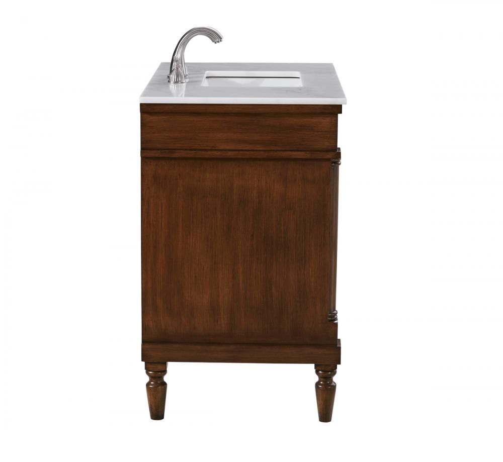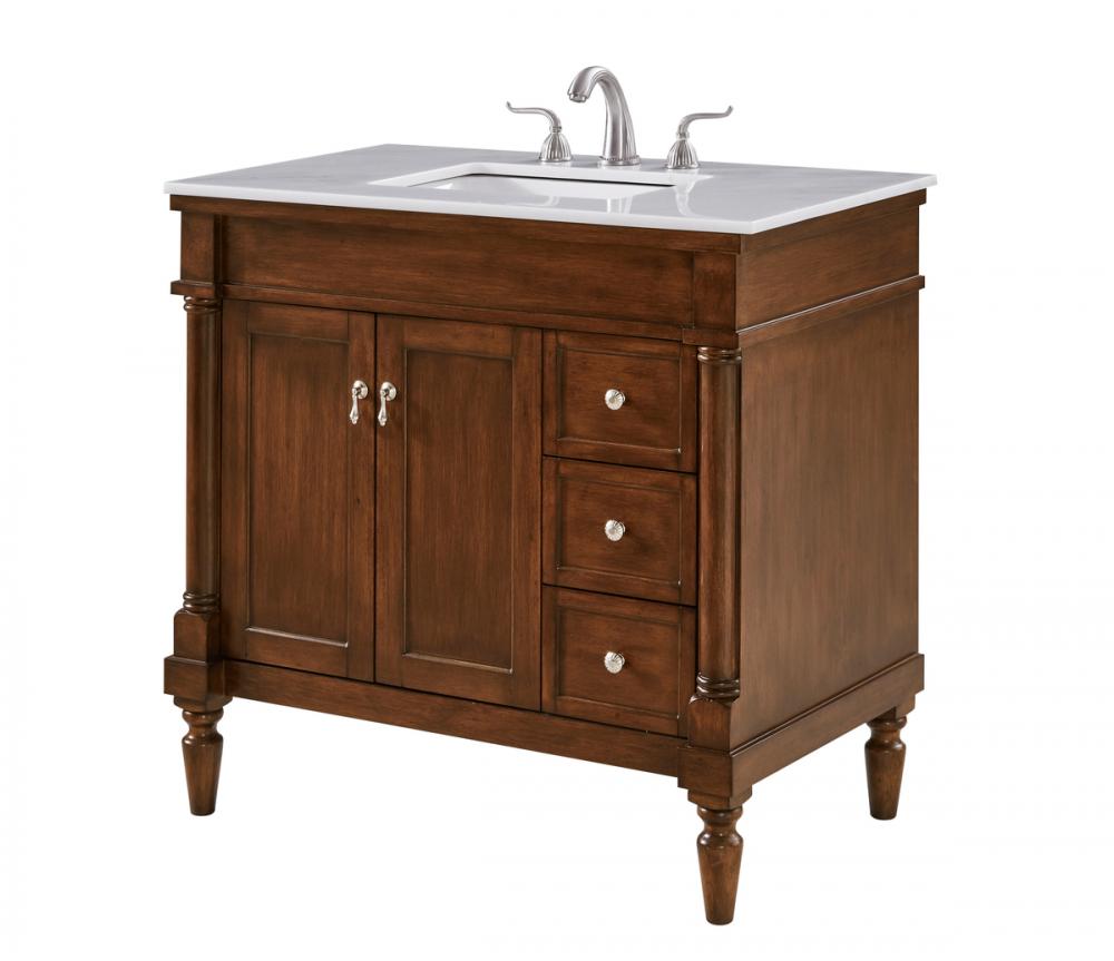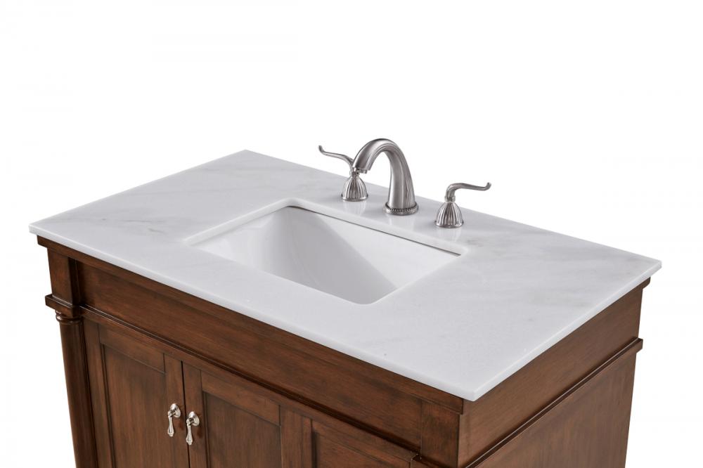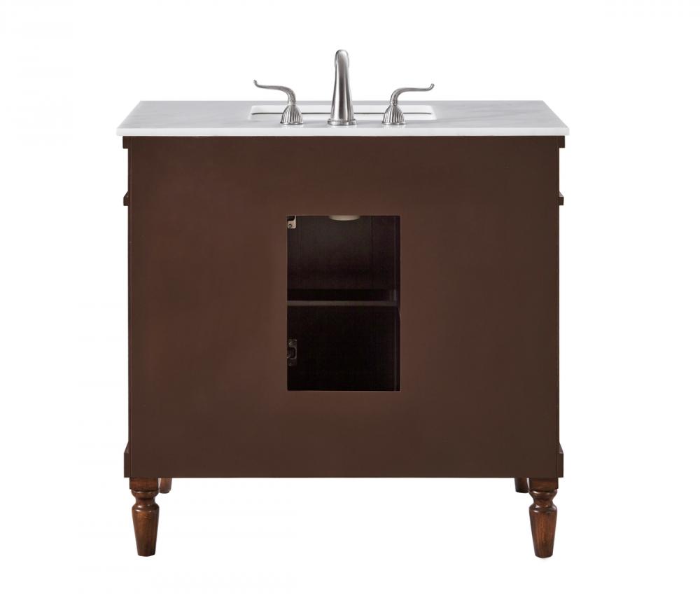 This traditionally styled, yet fashionably designed vanity can add distinction and grace to your home or office bathroom. Beautifully combining a lustrous natural white marble countertop with a large rectangular white porcelain under mount sink, and a hand painted walnut 2-door cabinet with a shelf inside, 3 full extension drawers, brushed steel door pulls, standing on turned, tapering legs. You’ll enjoy its charming allure for many years to come. Measurements: W36” x D21” x H35”