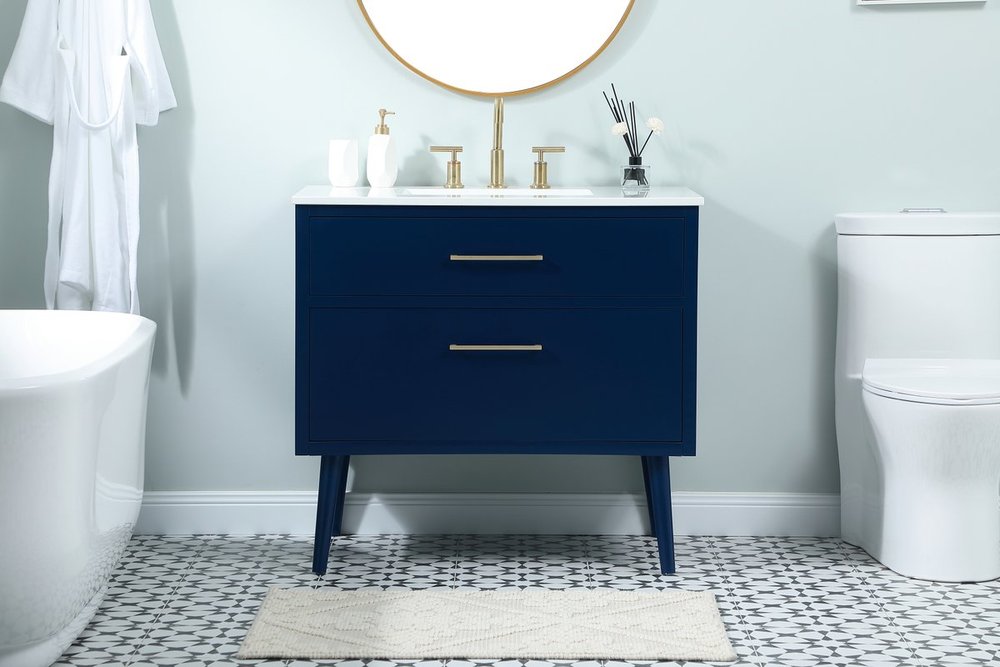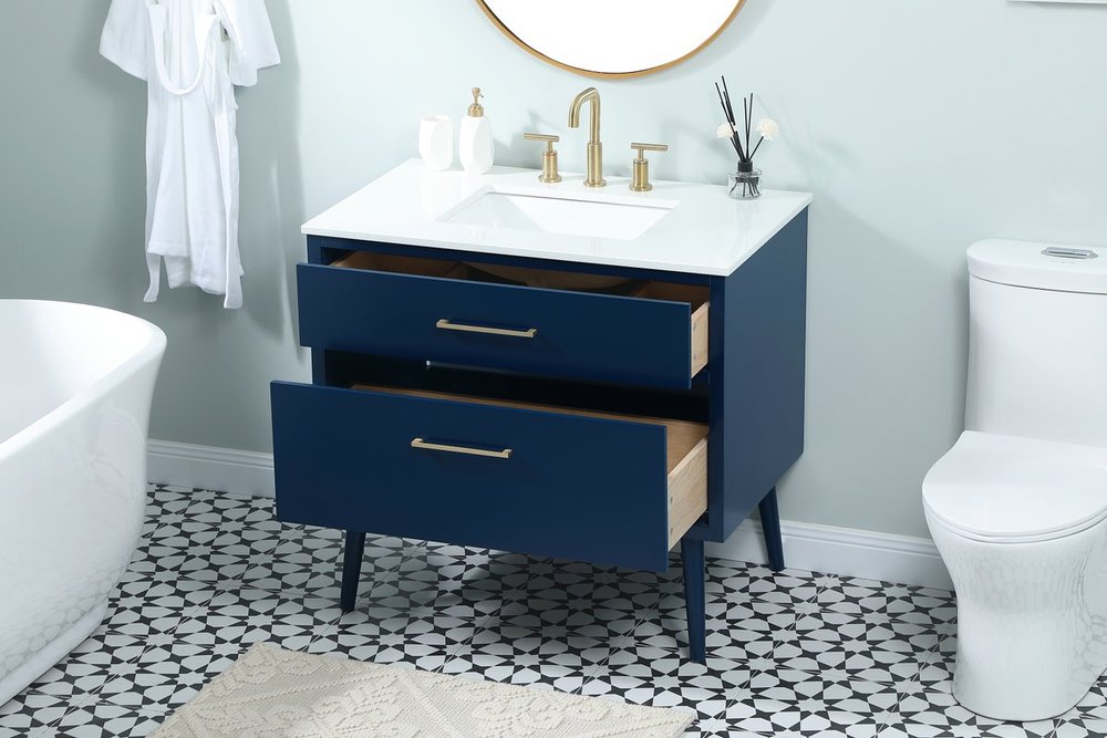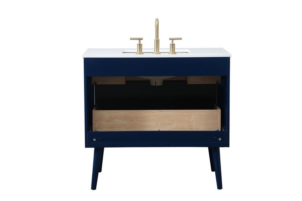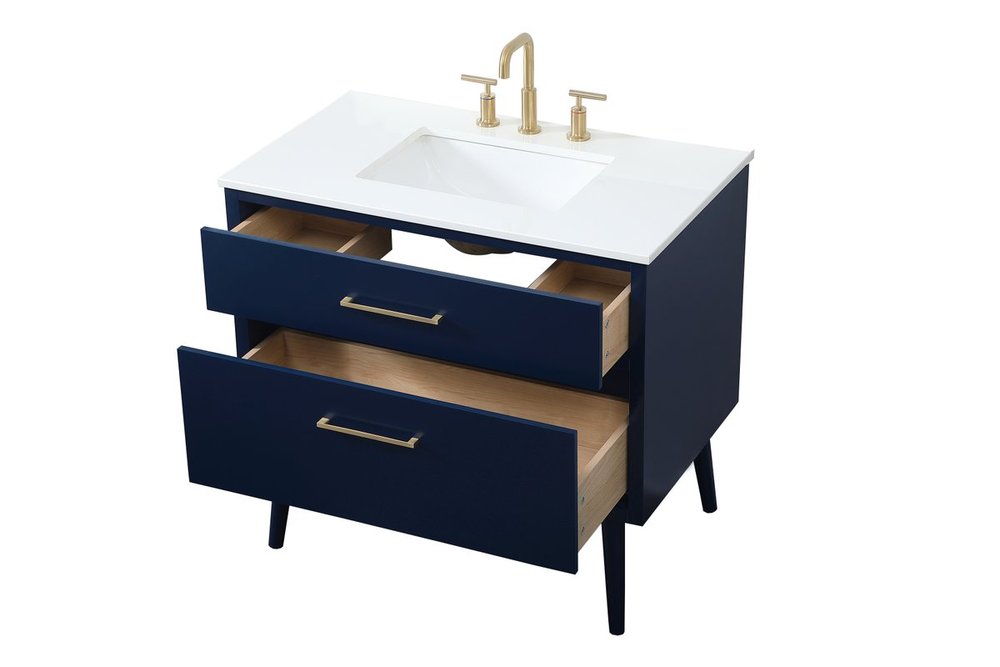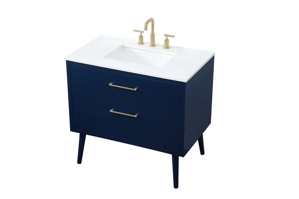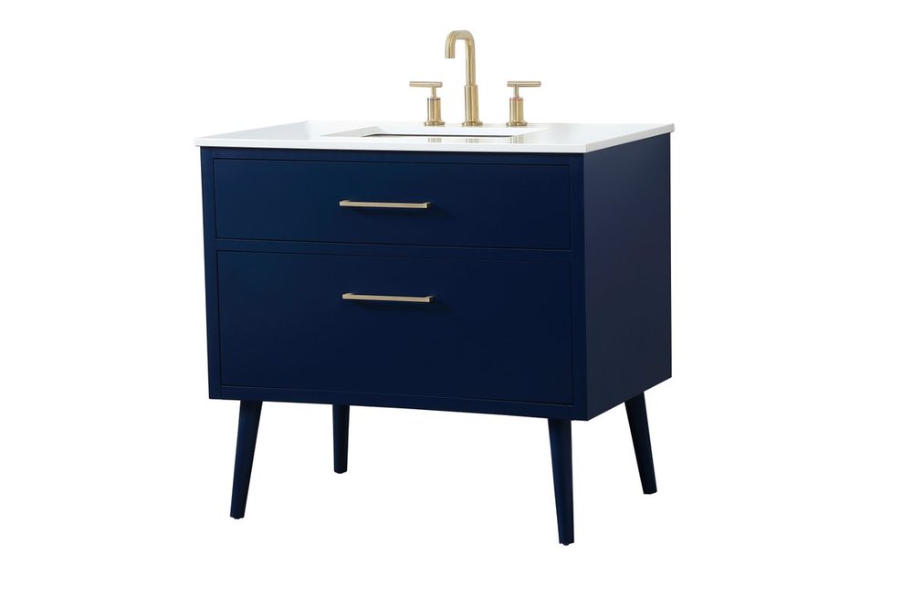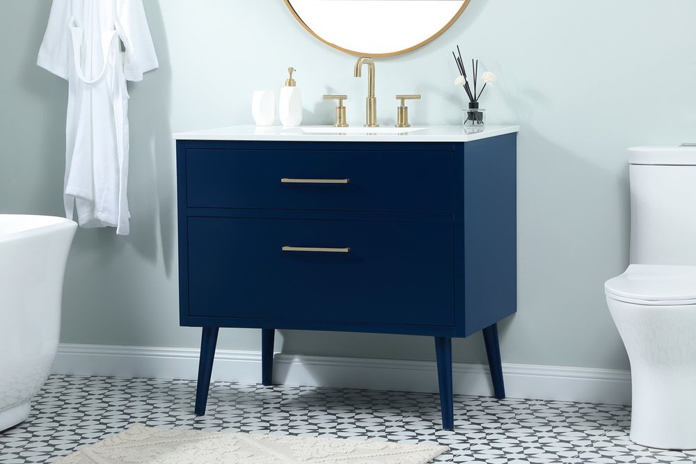 Delve into a world of minimalistic fashion and contemporary styling with this midcentury modern 36" vanity. The clean lines anchors the design, while the oblique tapered cylinder legs add subtle interest. However, the artful juxtaposition between the blue and white top creates a blend of bright modernity and classical traditions. A gold handle adorns the top fake drawer hiding the base of the undermount porcelain sink while another one allows you to pull the bottom drawer out, letting you store your bathroom necessities and toiletries. The compact size makes it the perfect vanity for any bathroom or powder room, regardless of size.