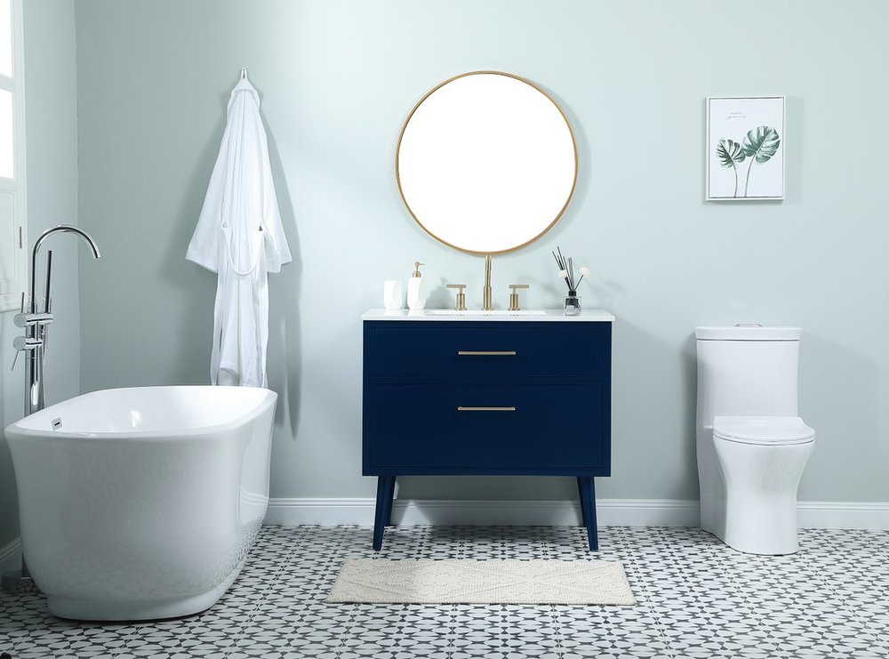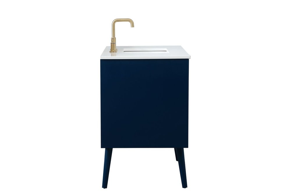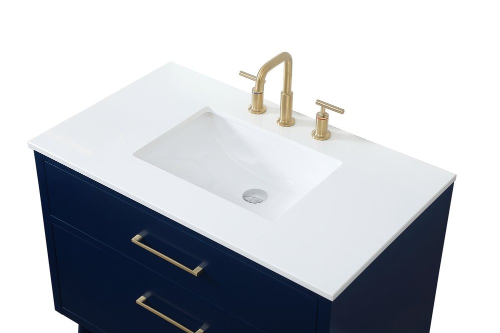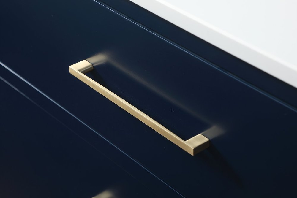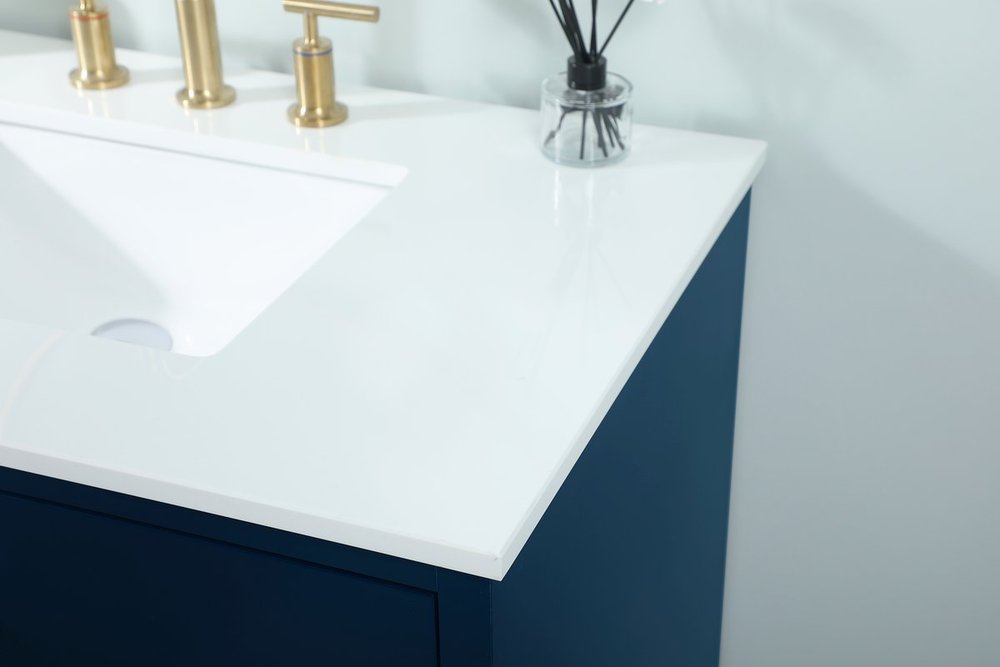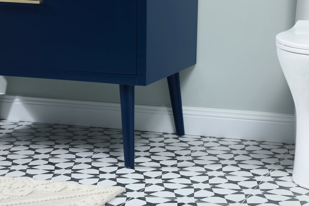 Delve into a world of minimalistic fashion and contemporary styling with this midcentury modern 36" vanity. The clean lines anchors the design, while the oblique tapered cylinder legs add subtle interest. However, the artful juxtaposition between the blue and white top creates a blend of bright modernity and classical traditions. A gold handle adorns the top fake drawer hiding the base of the undermount porcelain sink while another one allows you to pull the bottom drawer out, letting you store your bathroom necessities and toiletries. The compact size makes it the perfect vanity for any bathroom or powder room, regardless of size.