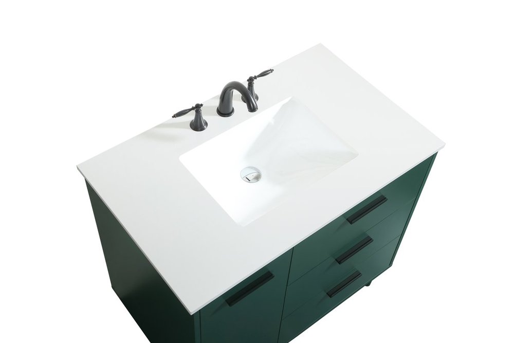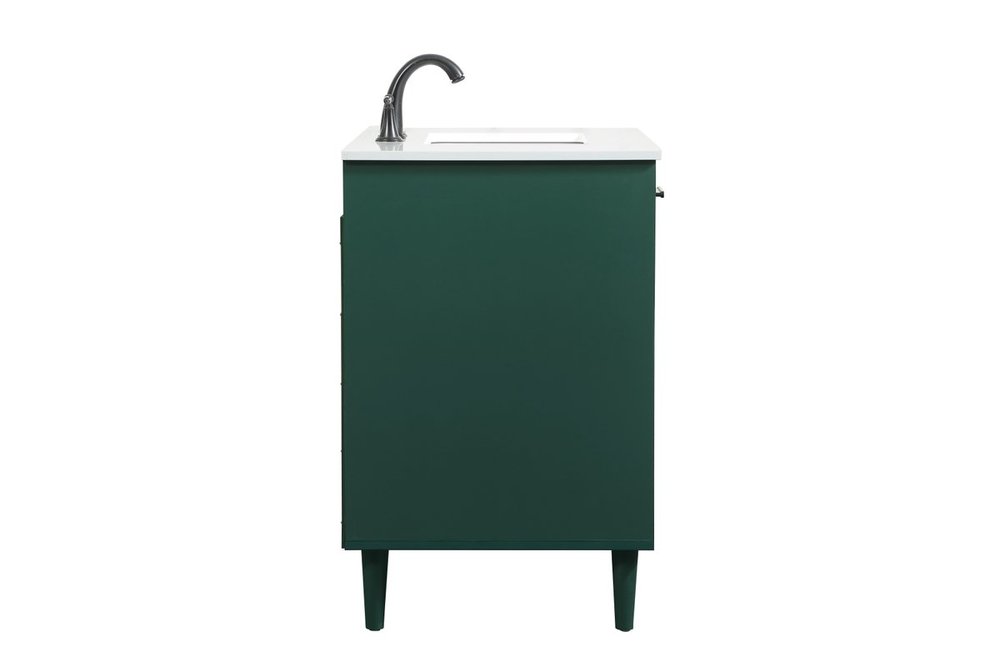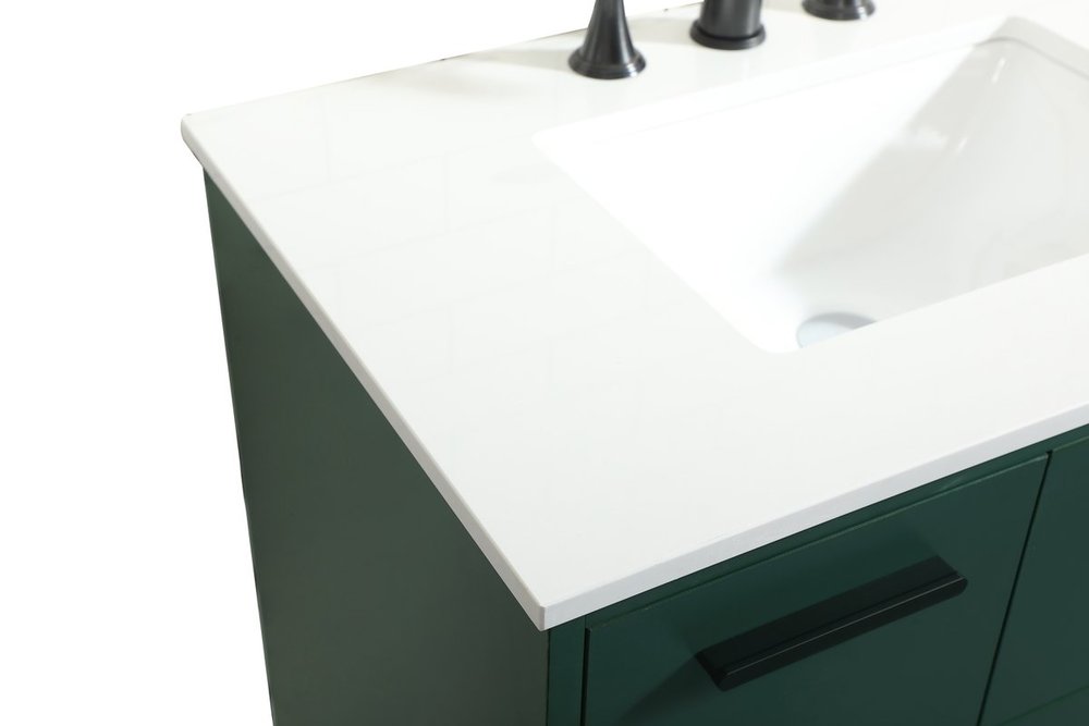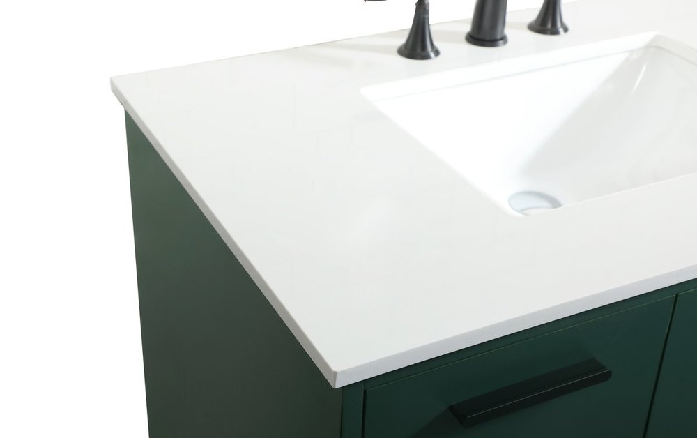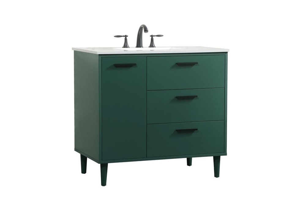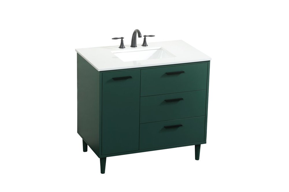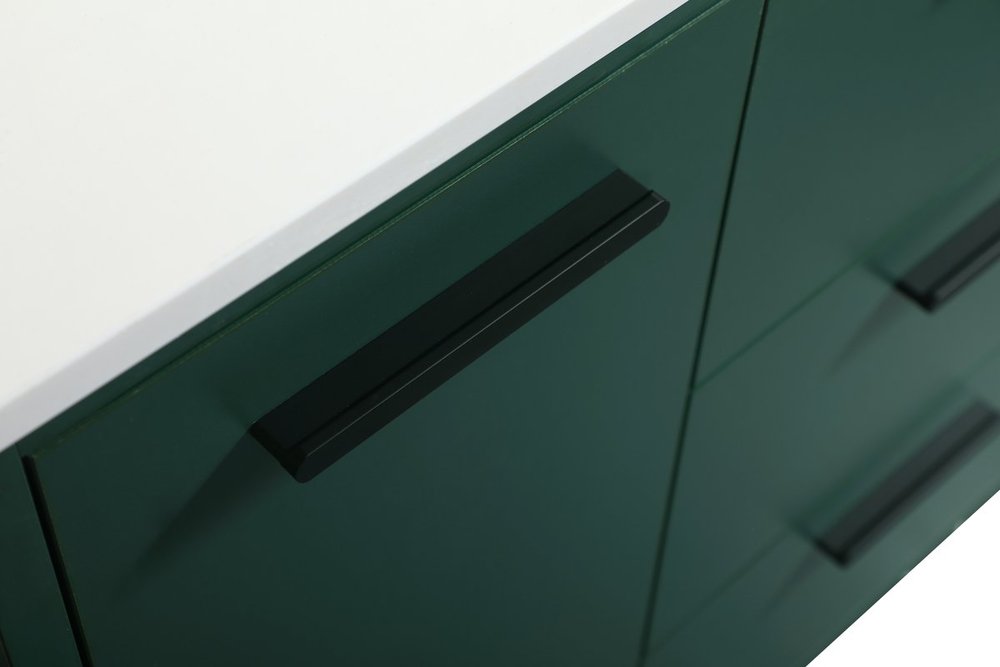Modern sophistication is defined with the green finish and black barpulls of this vanity and slender tapered legs. Its length makes it the perfect addition to any sized home, and saves space with its storage area hidden behind the Single cabinet door and two bottom drawers. Topped with a highly durable engineered stone countertop and a porcelain undermount sink, this modern design will become your focal point of your bathroom or powder room. Equipped with soft-closing drawer and doors adds a quiet functional touch.