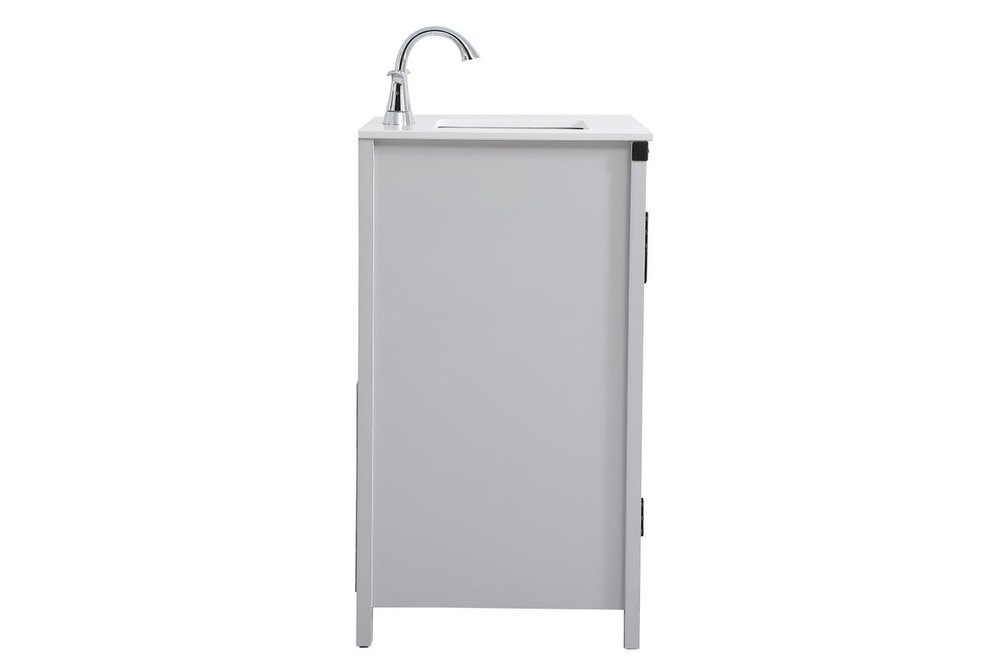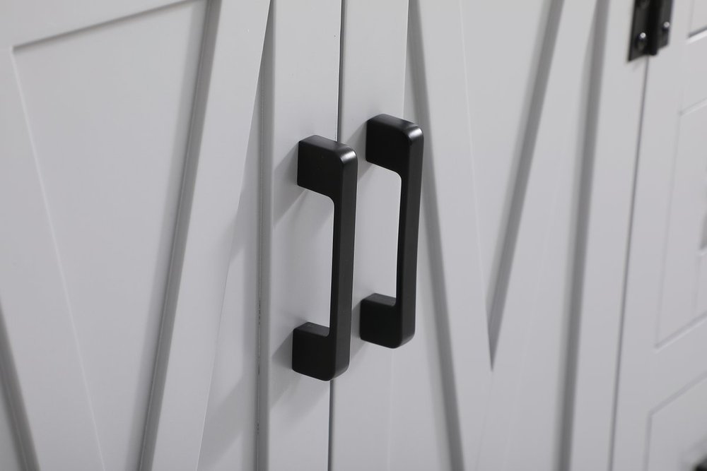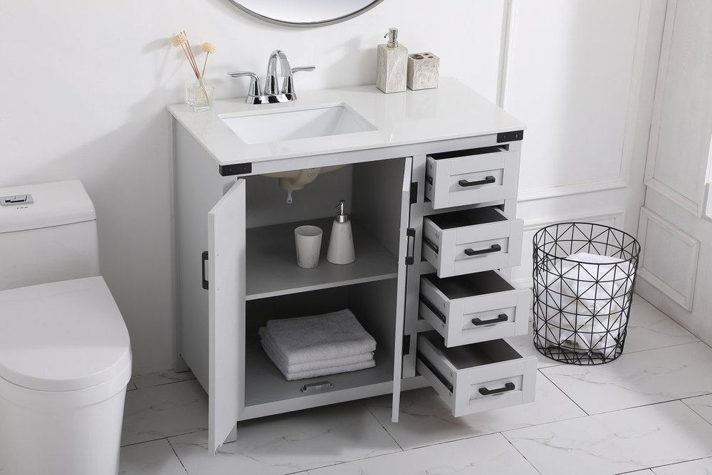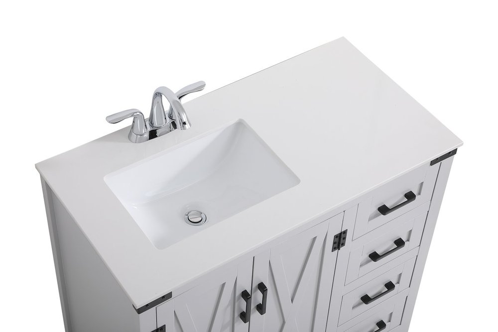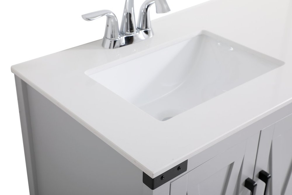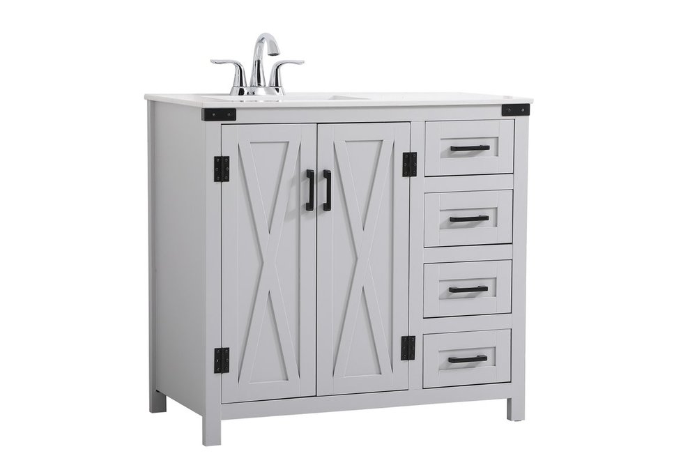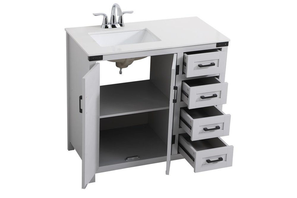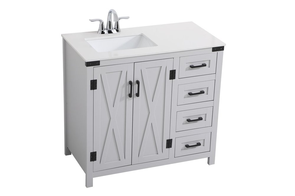 The Grant Collection 36 in. vanity is a practical and stylish upgrade for your bathroom. Its grey finish is highlighted by the engineered white stone top featuring an under-counter rectangular sink. The cross patterned cabinet doors are decorated with bold black hinges and bar pulls. The cabinet has four pullout drawers, ideal for towels, washcloths and bath accessories