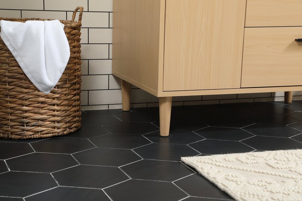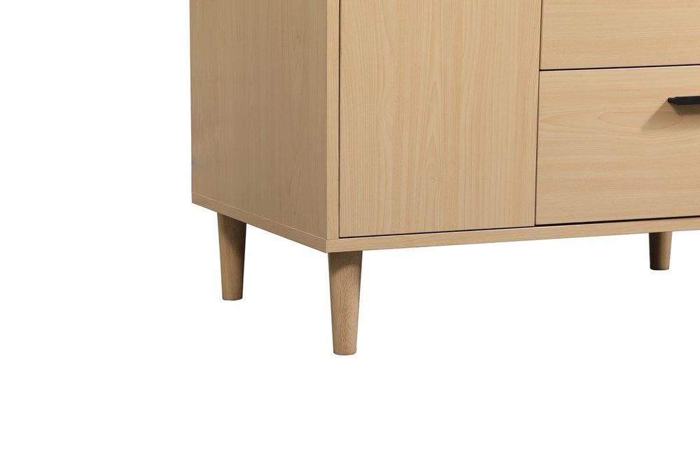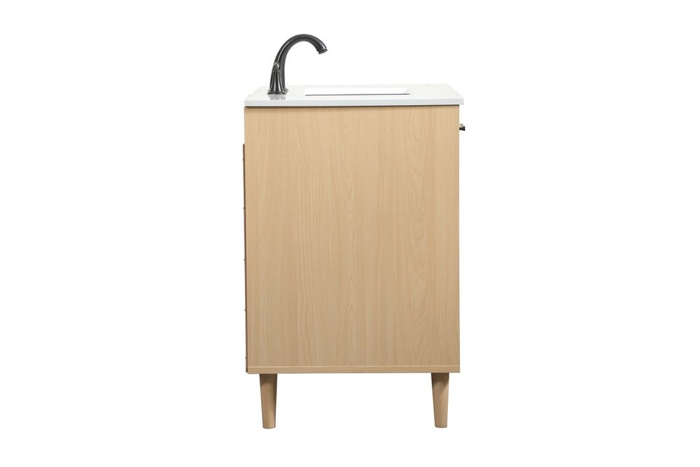 Modern sophistication is defined with the mape finish and black barpulls of this vanity and slender tapered legs. Its length makes it the perfect addition to any sized home, and saves space with its storage area hidden behind the Single cabinet door and two bottom drawers. Topped with a highly durable engineered stone countertop and a porcelain undermount sink, this modern design will become your focal point of your bathroom or powder room. Equipped with soft-closing drawer and doors adds a quiet functional touch.