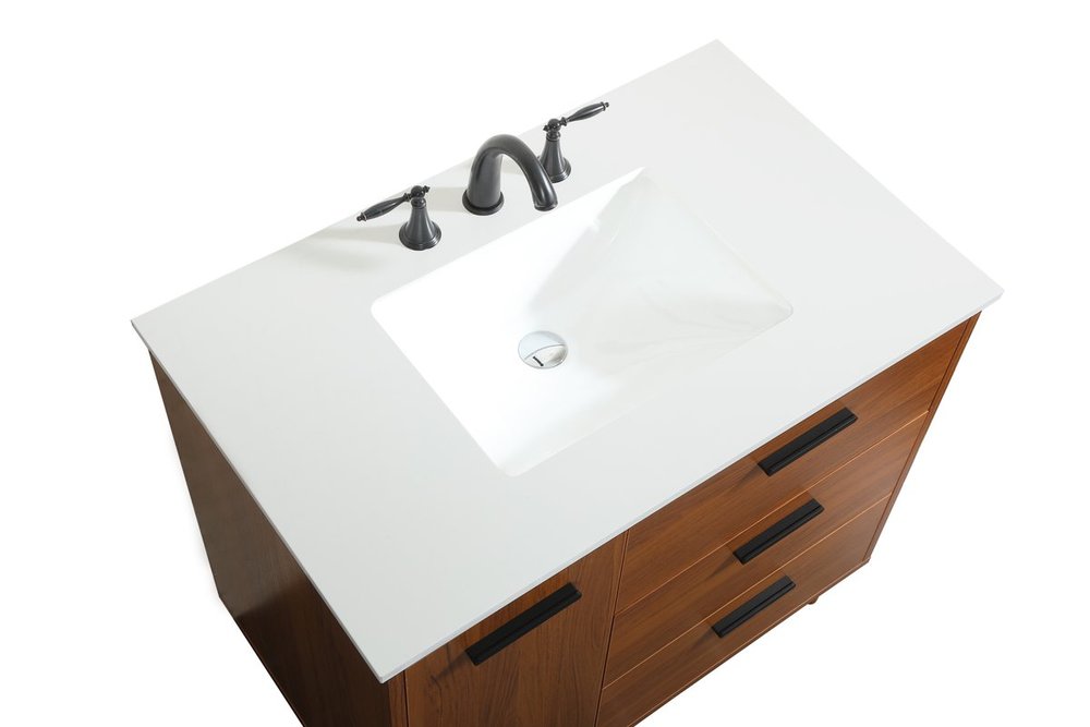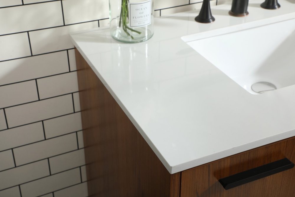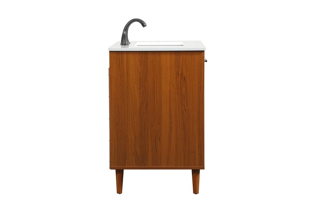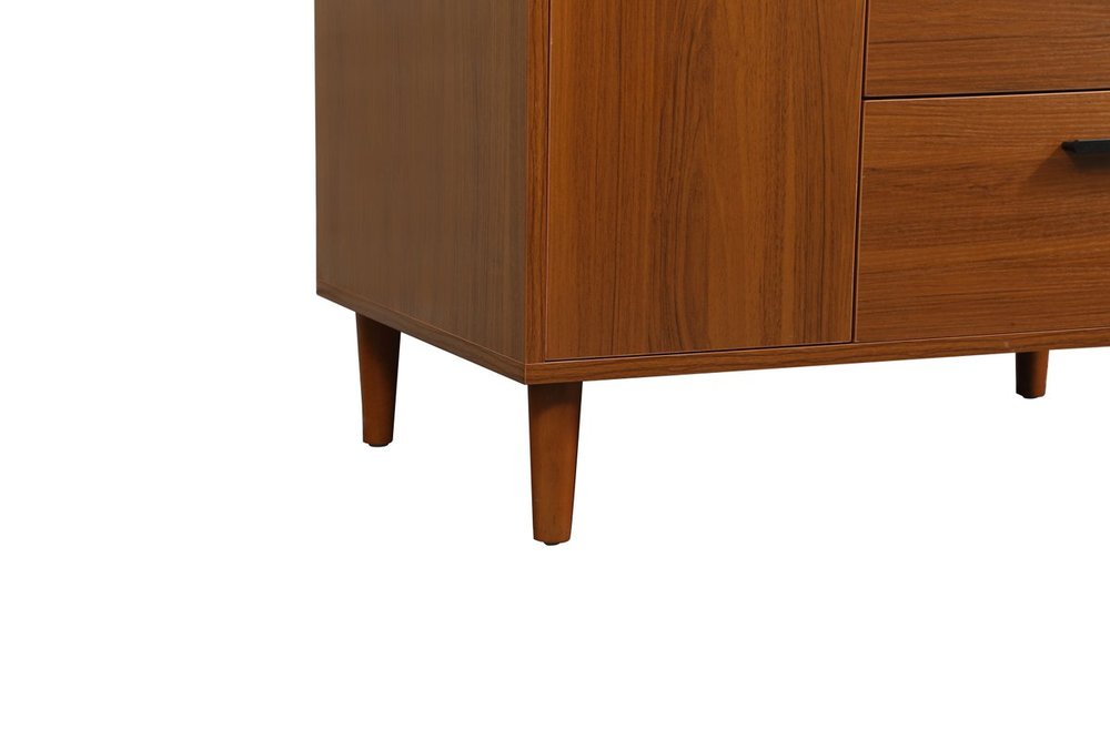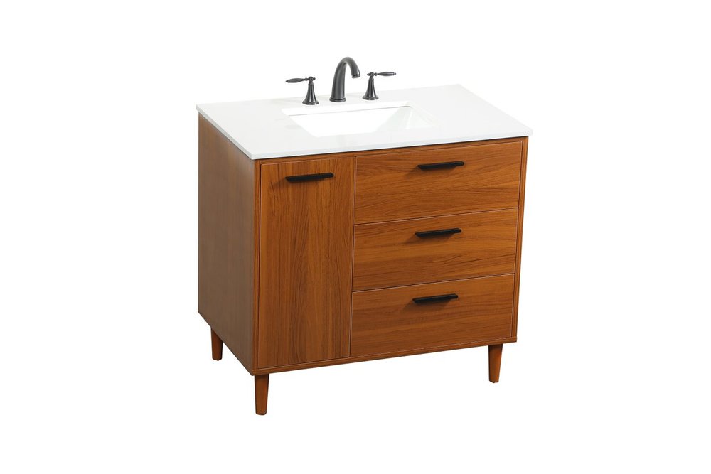 Modern sophistication is defined with the teak finish and black barpulls of this vanity and slender tapered legs. Its length makes it the perfect addition to any sized home, and saves space with its storage area hidden behind the Single cabinet door and two bottom drawers. Topped with a highly durable engineered stone countertop and a porcelain undermount sink, this modern design will become your focal point of your bathroom or powder room. Equipped with soft-closing drawer and doors adds a quiet functional touch.