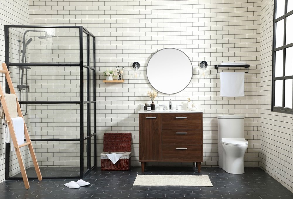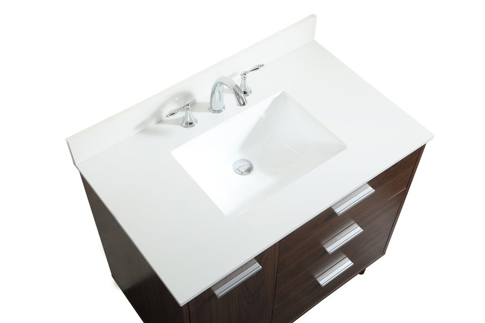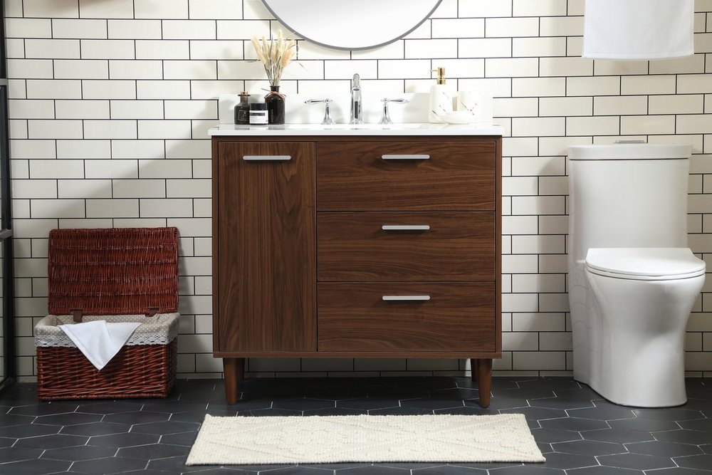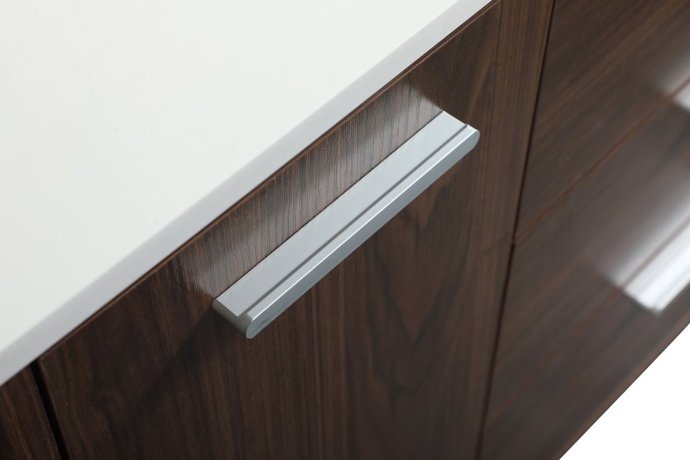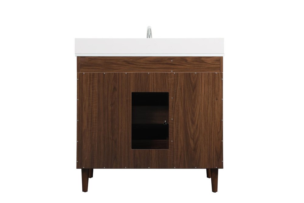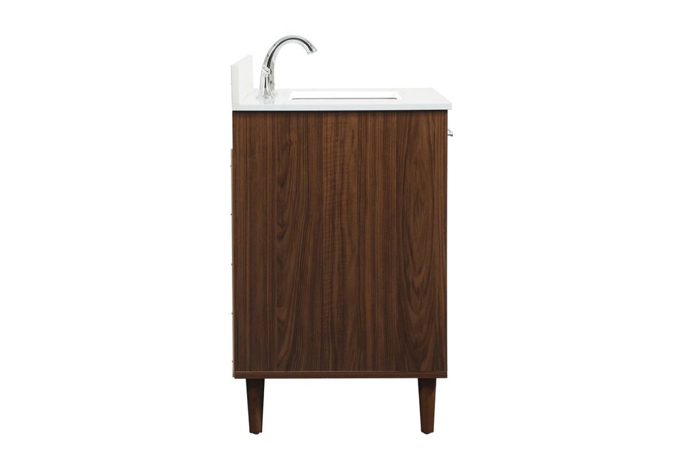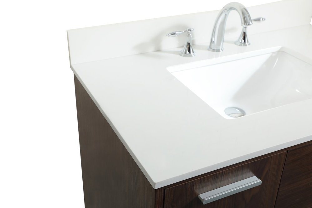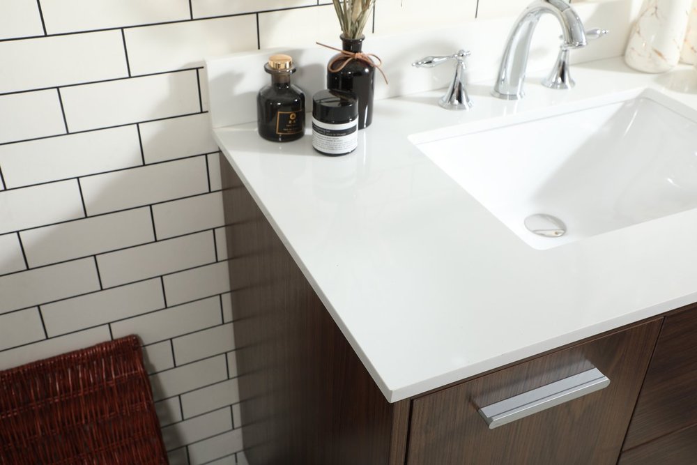 Modern sophistication is defined with the walnut finish and silver barpulls of this vanity and slender tapered legs. Its length makes it the perfect addition to any sized home, and saves space with its storage area hidden behind the Single cabinet door and two bottom drawers. Topped with a highly durable engineered stone countertop and a porcelain undermount sink, this modern design will become your focal point of your bathroom or powder room. Comes with a matching backsplash to complete the look and protects your wall. Equipped with soft-closing drawer and doors adds a quiet functional touch.