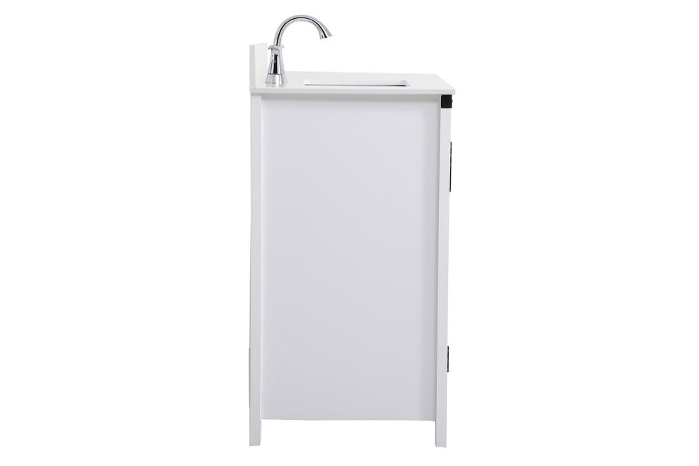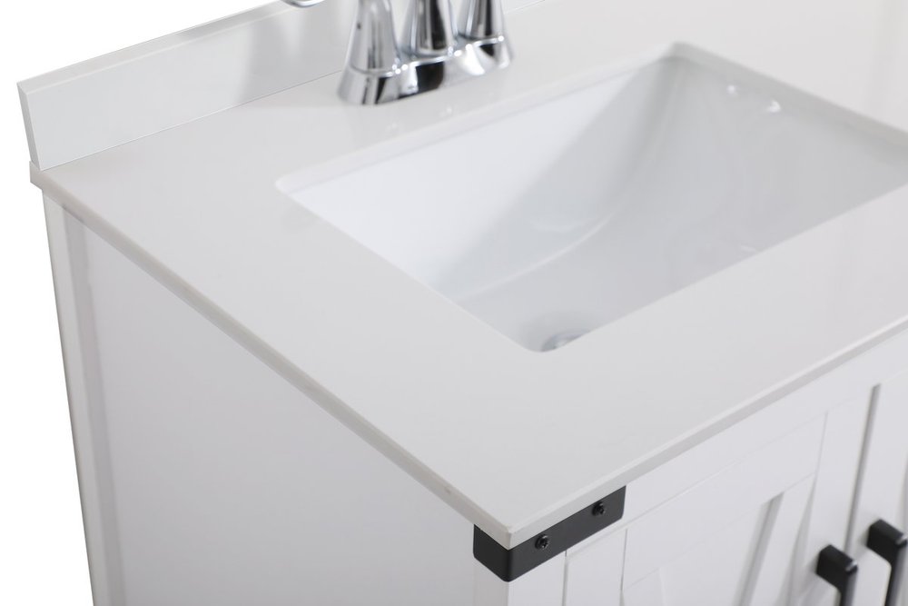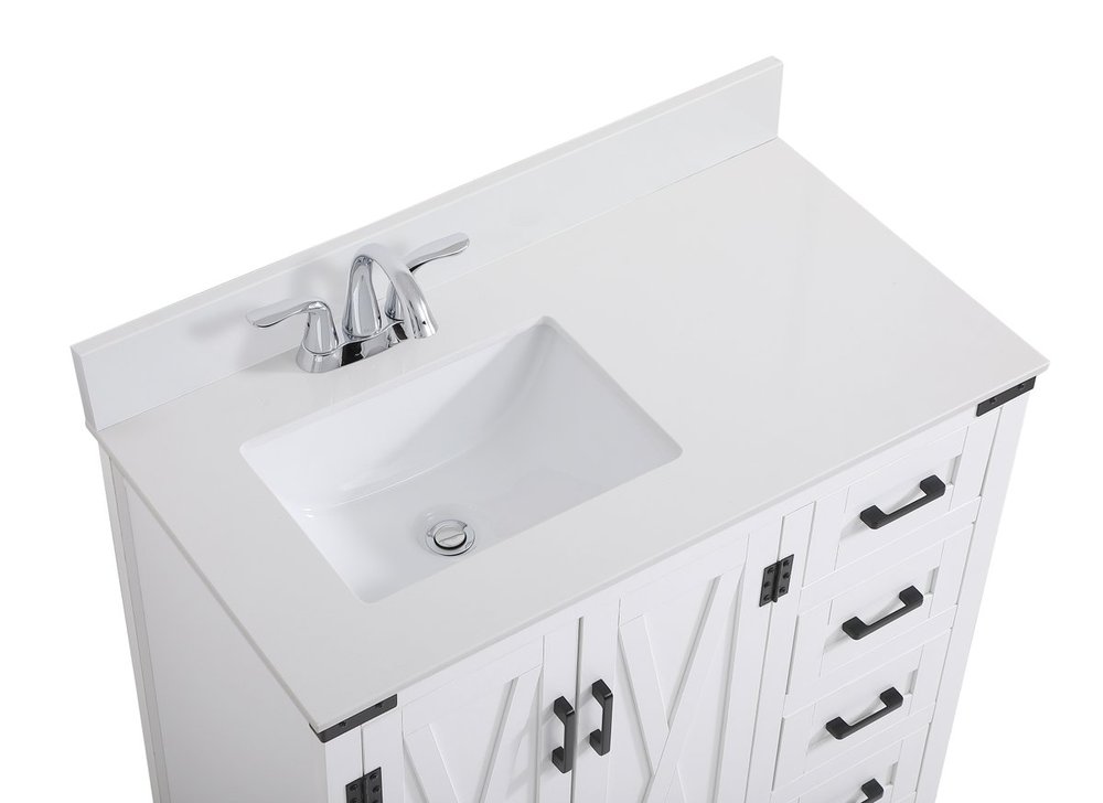 The Grant Collection 36 in. vanity is a practical and stylish upgrade for your bathroom. Its white finish is highlighted by the engineered white stone top featuring an under-counter rectangular sink. The cross patterned cabinet doors are decorated with bold black hinges and bar pulls. The cabinet has four pullout drawers, ideal for towels, washcloths and bath accessories Comes with a matching backsplash to complete the look and protects your wall.