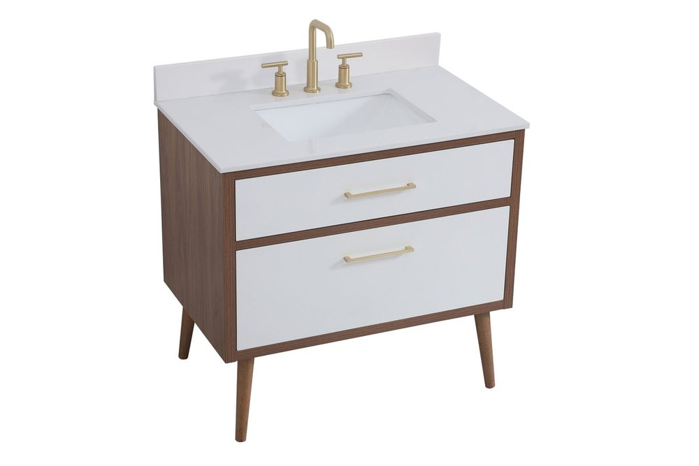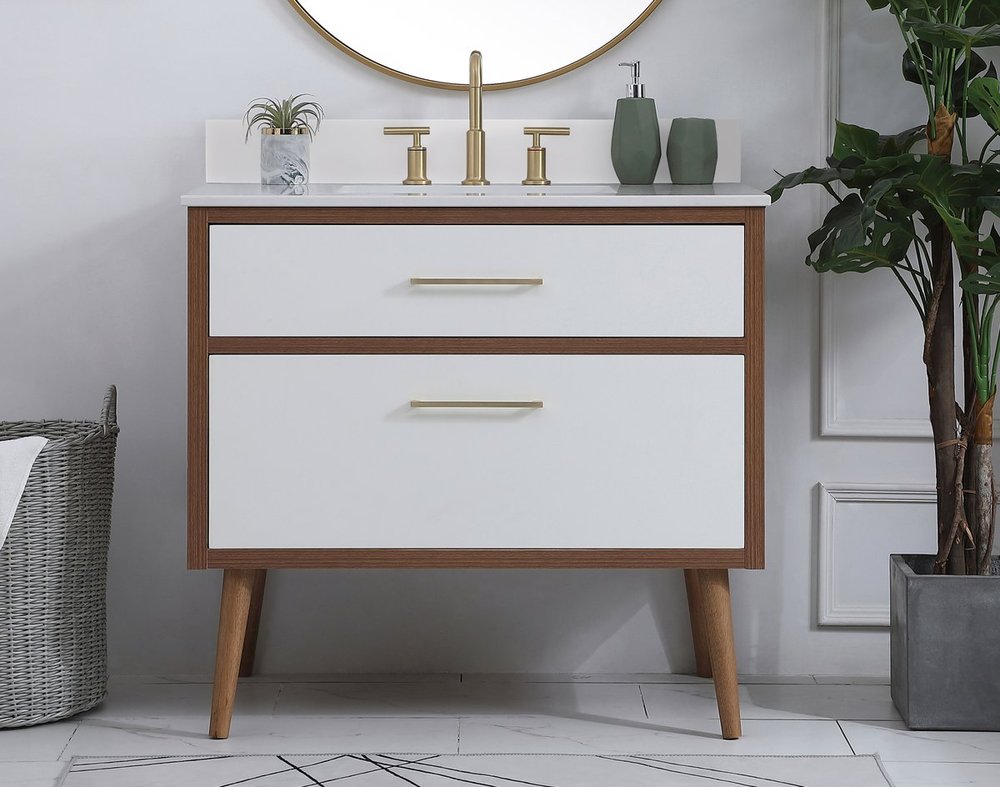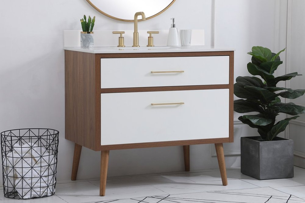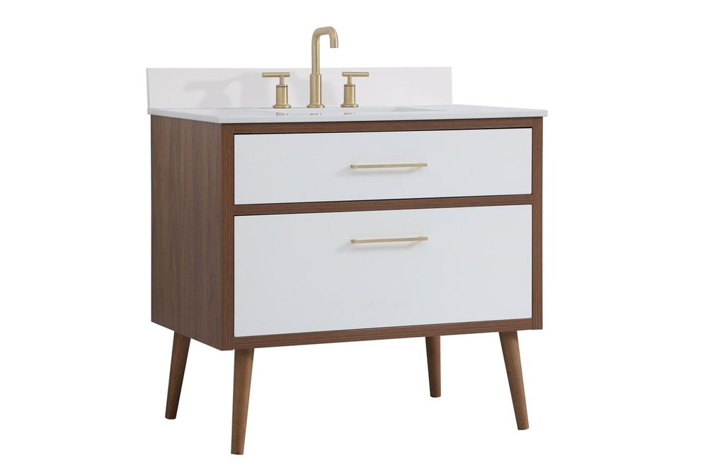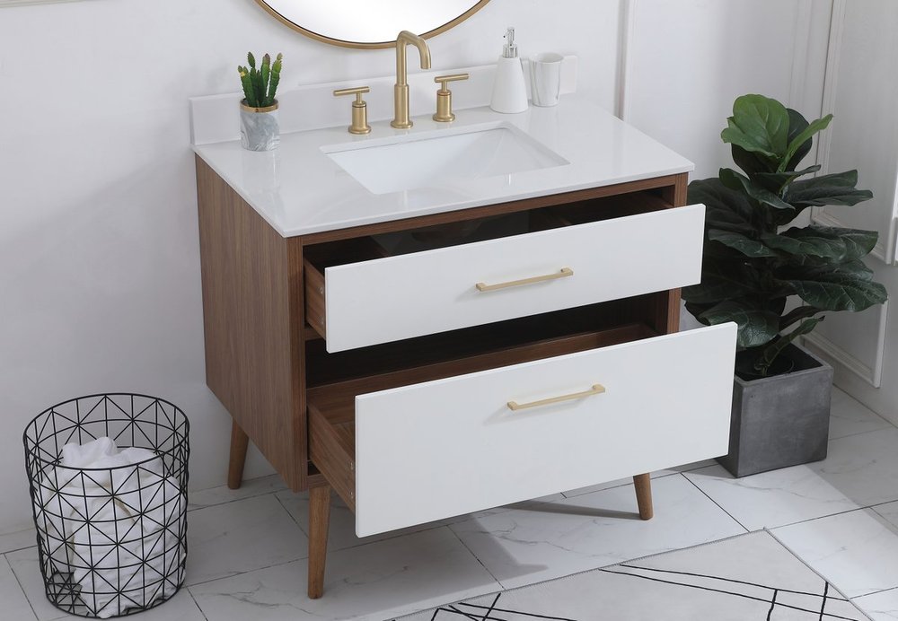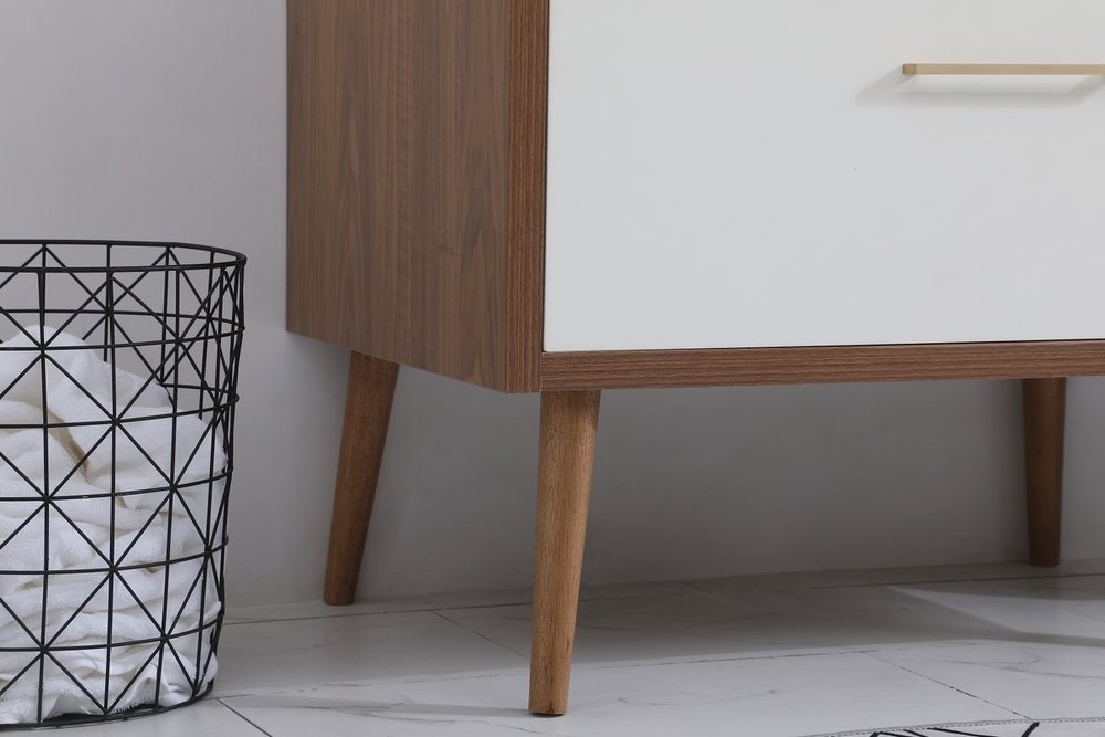 Delve into a world of minimalistic fashion and contemporary styling with this midcentury modern 36" vanity. The clean lines anchors the design, while the oblique tapered cylinder legs add subtle interest. However, the artful juxtaposition between the walnut brown and matte white creates a blend of bright modernity and classical traditions. A gold handle adorns the top fake drawer hiding the base of the undermount porcelain sink while another one allows you to pull the bottom drawer out, letting you store your bathroom necessities and toiletries. The compact size makes it the perfect vanity for any bathroom or powder room, regardless of size. Comes with a matching backsplash to complete the look and protects your wall.