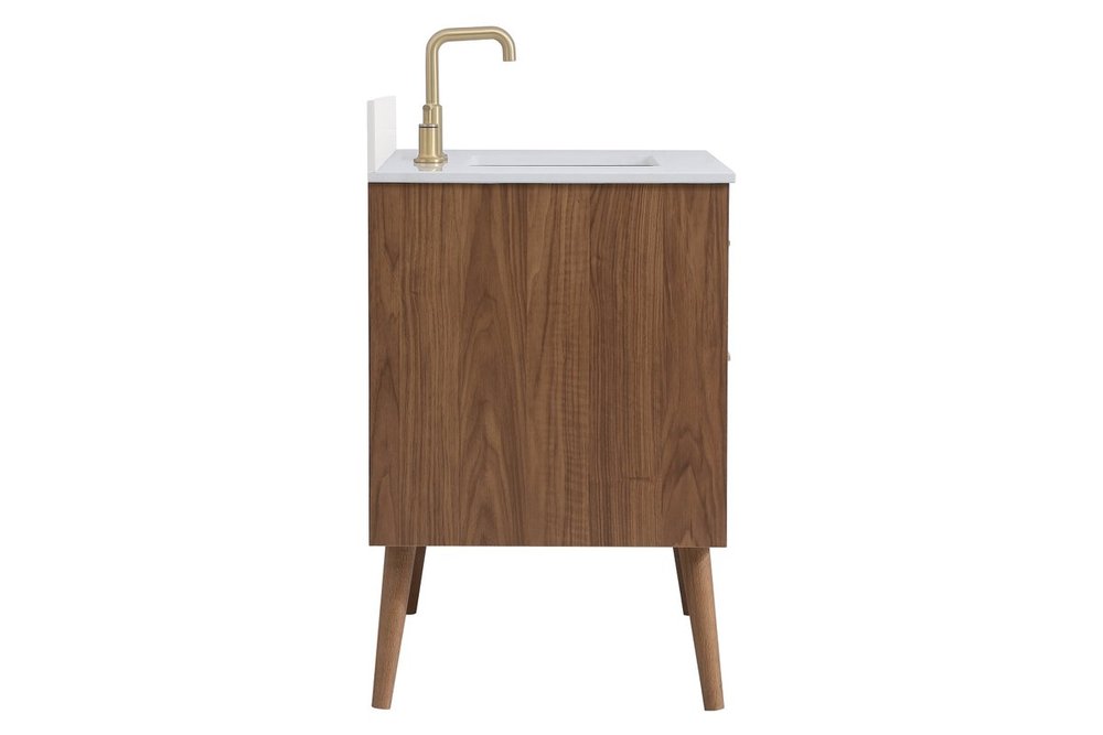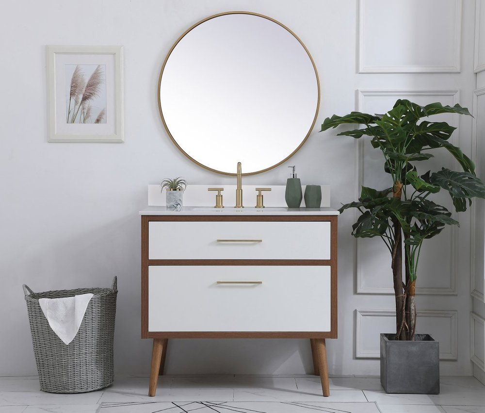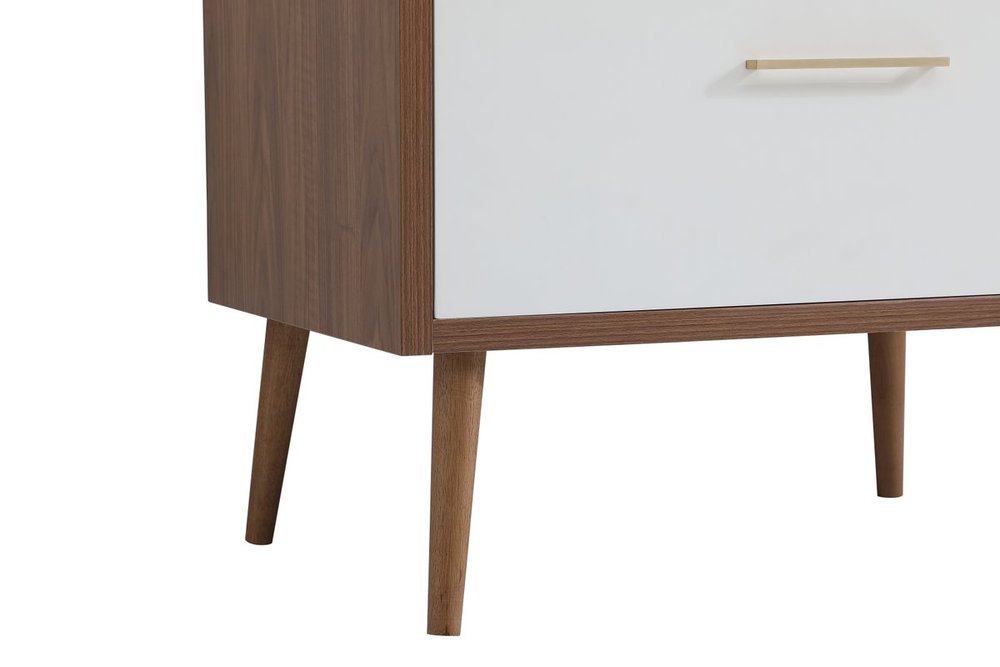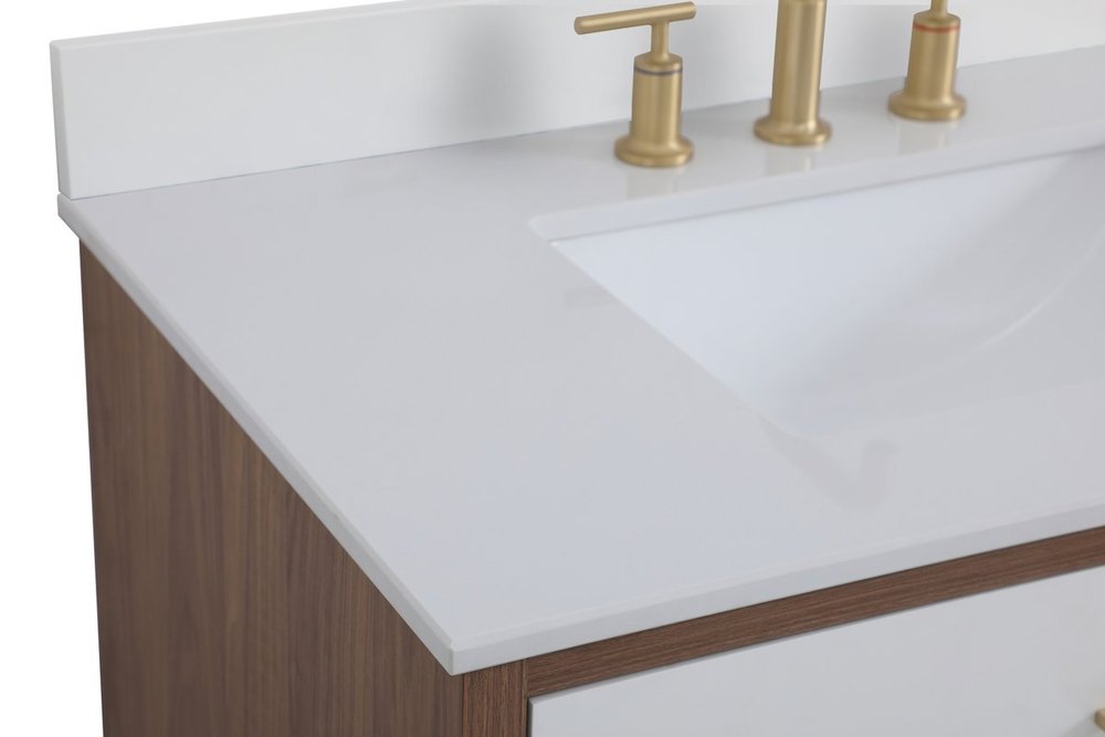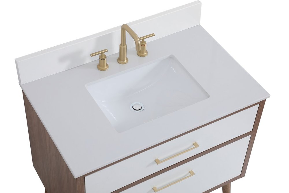 Delve into a world of minimalistic fashion and contemporary styling with this midcentury modern 36" vanity. The clean lines anchors the design, while the oblique tapered cylinder legs add subtle interest. However, the artful juxtaposition between the walnut brown and matte white creates a blend of bright modernity and classical traditions. A gold handle adorns the top fake drawer hiding the base of the undermount porcelain sink while another one allows you to pull the bottom drawer out, letting you store your bathroom necessities and toiletries. The compact size makes it the perfect vanity for any bathroom or powder room, regardless of size. Comes with a matching backsplash to complete the look and protects your wall.