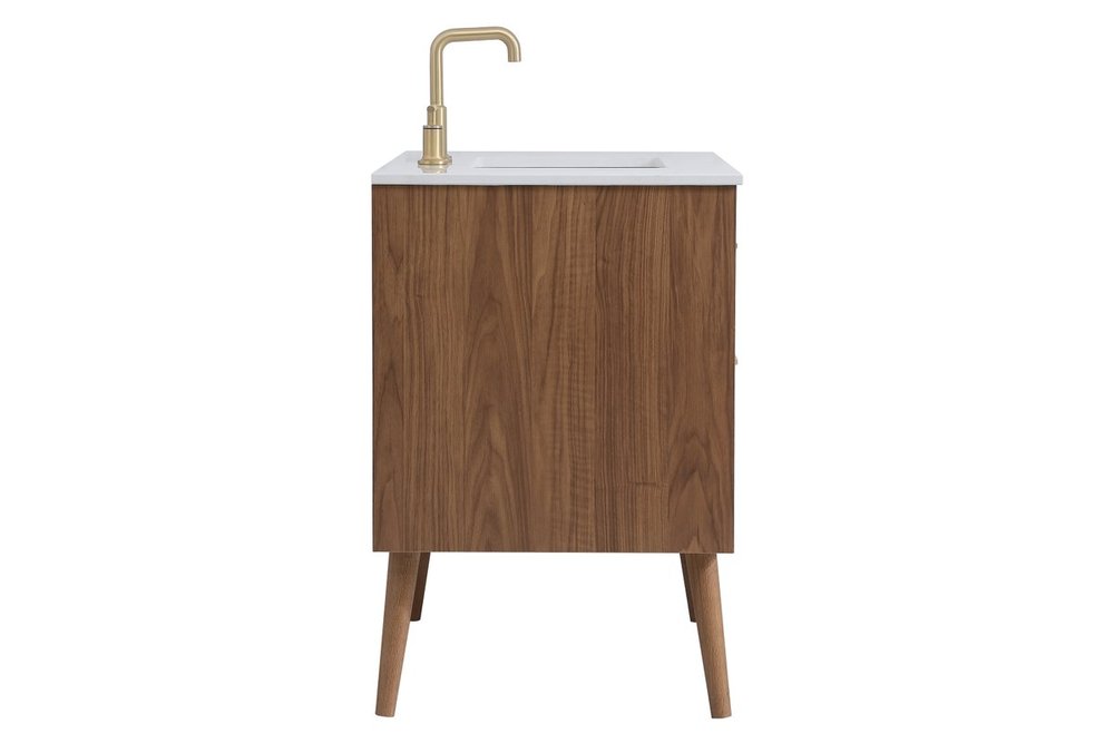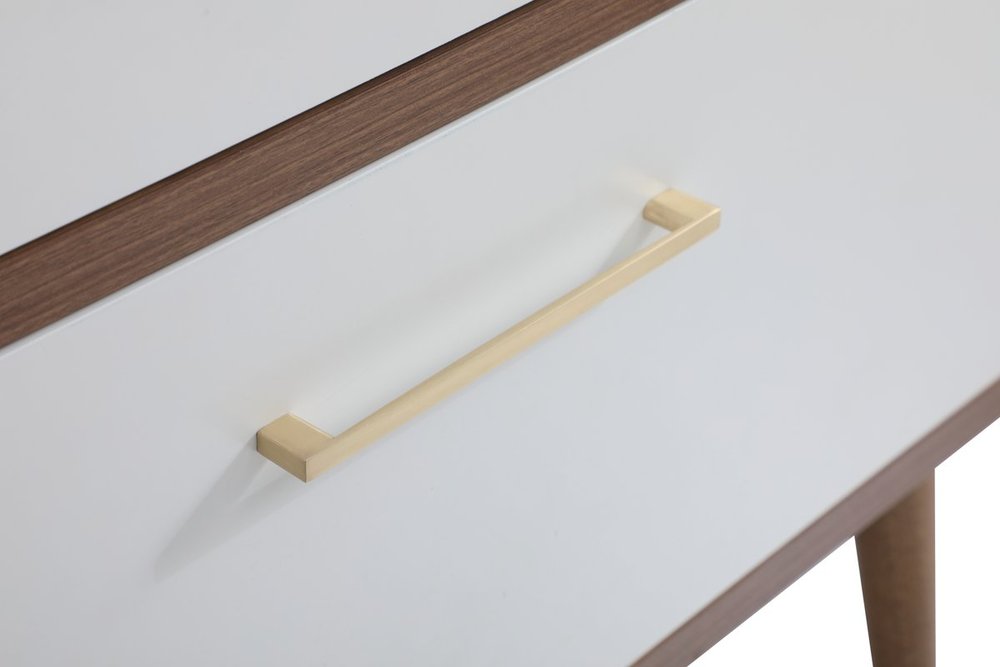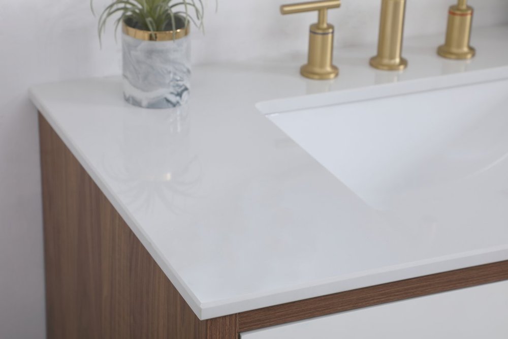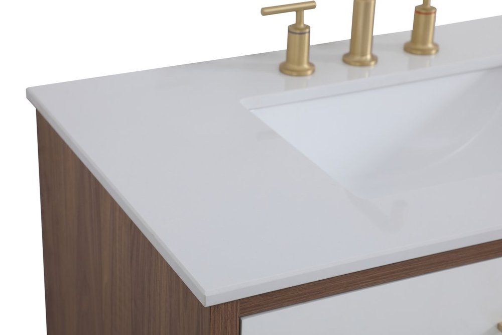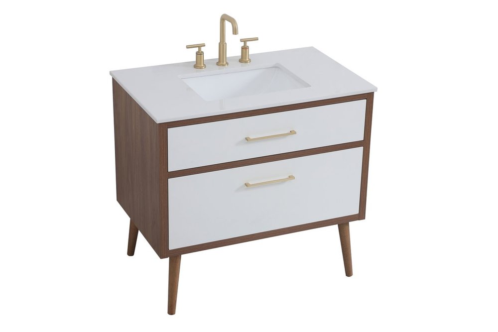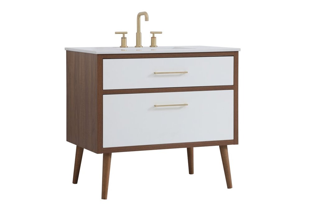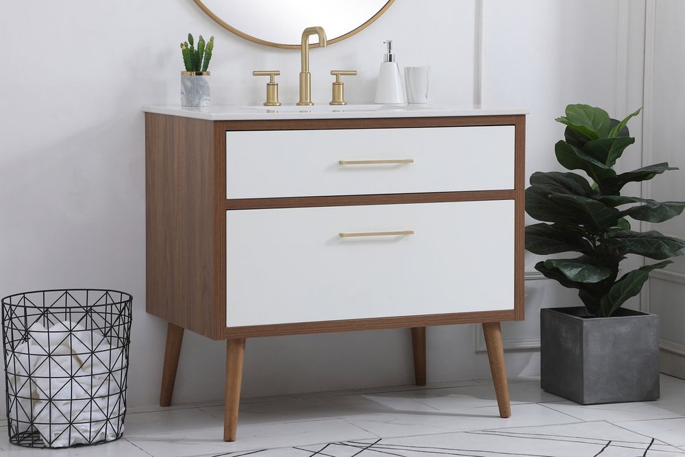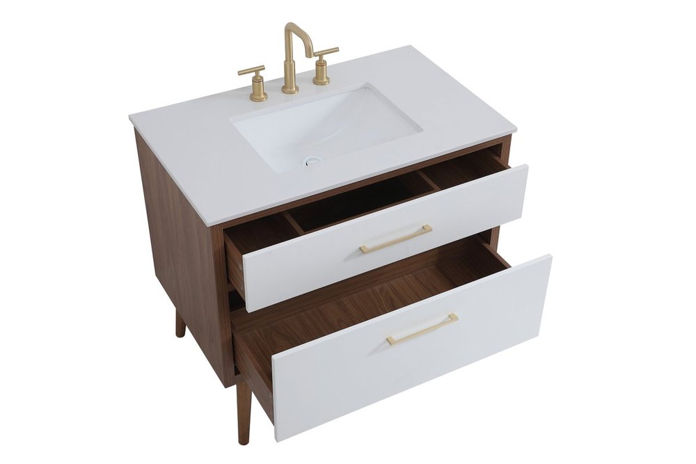 Delve into a world of minimalistic fashion and contemporary styling with this midcentury modern 36" vanity. The clean lines anchors the design, while the oblique tapered cylinder legs add subtle interest. However, the artful juxtaposition between the walnut brown and matte white creates a blend of bright modernity and classical traditions. A gold handle adorns the top fake drawer hiding the base of the undermount porcelain sink while another one allows you to pull the bottom drawer out, letting you store your bathroom necessities and toiletries. The compact size makes it the perfect vanity for any bathroom or powder room, regardless of size.