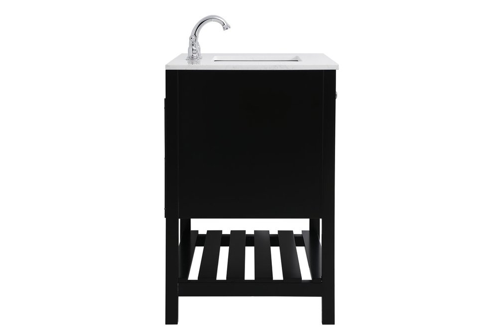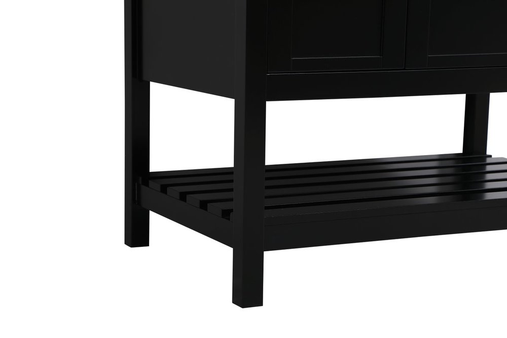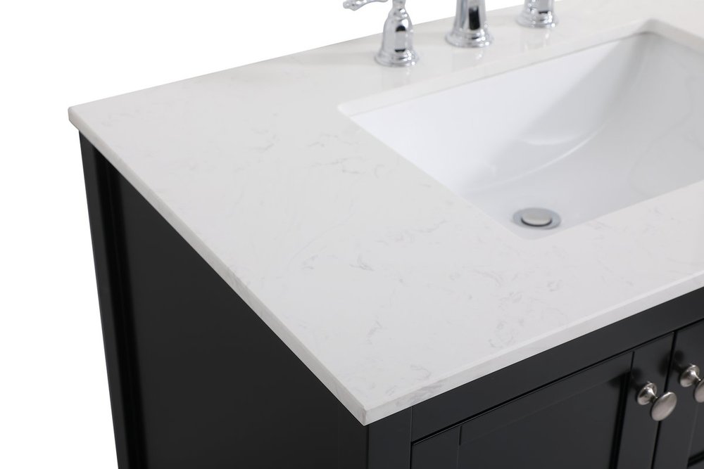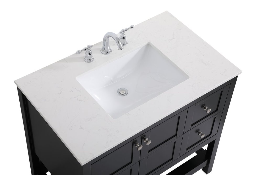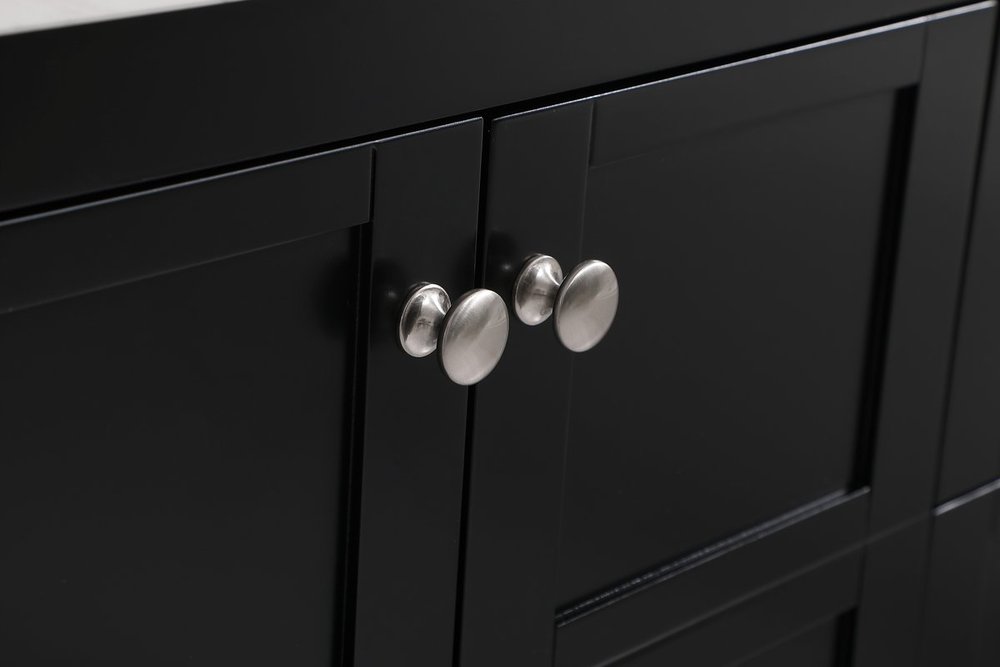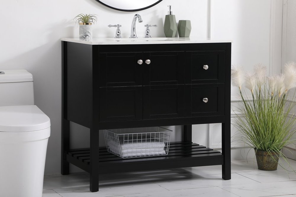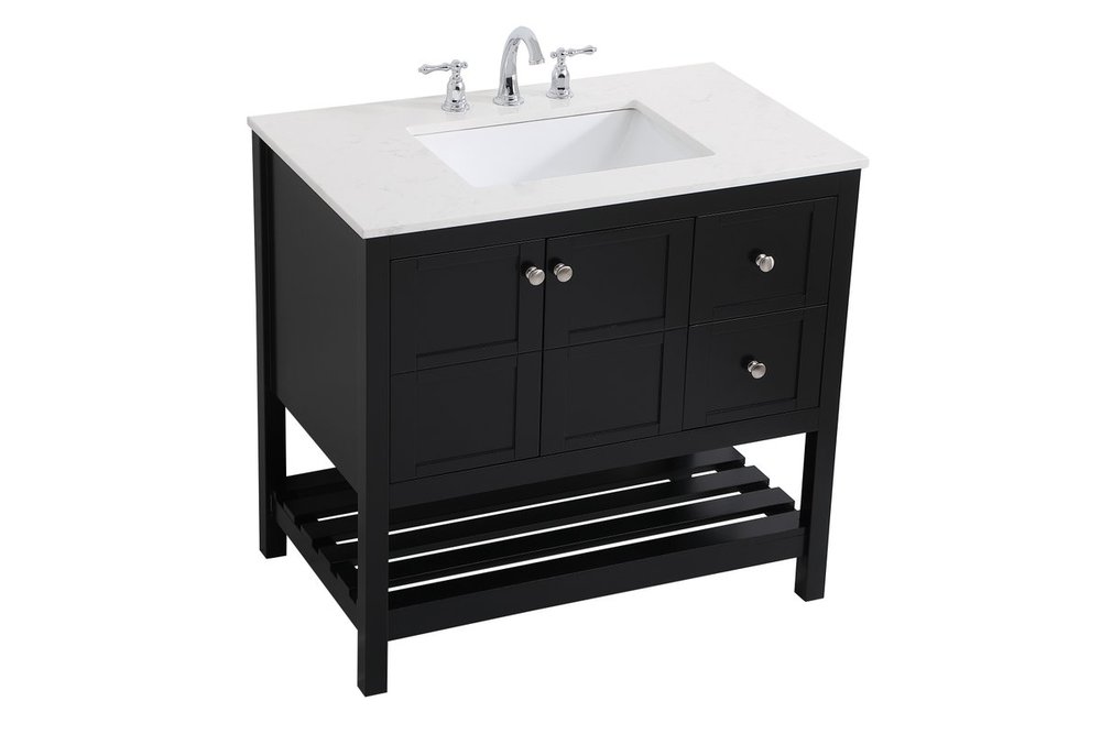 The subtle beauty of the Theo collection 36" vanity in a black finish exudes comfortable luxury. Its modern, yet traditional beauty will surely dress up your bathroom or powder room without any fuss. The white stone countertop and porcelain undermount sink shows quiet opulence, and the legs support upright without fail. Brushed Nickel hardware complements the trendy black finish, with pulls adorning the two cabinet doors and two drawers, showcasing ample storage space within. Slated shelf allows for additional space to organize your towels. Whether this vanity is in your bathroom or for guests, its presence will surely elevate the aesthetics of your room.