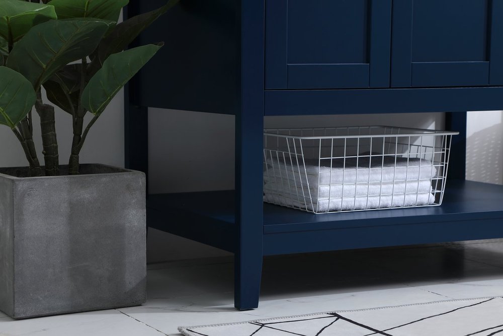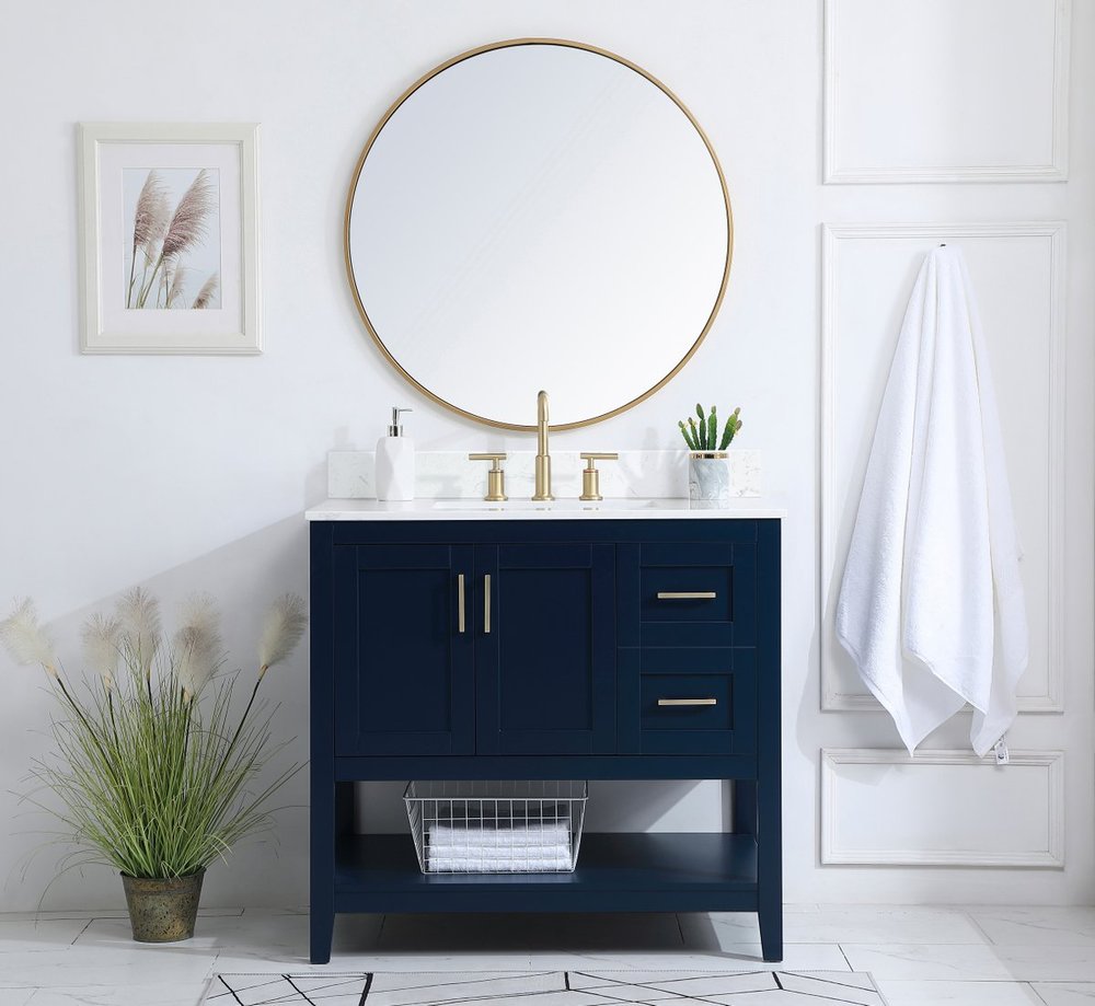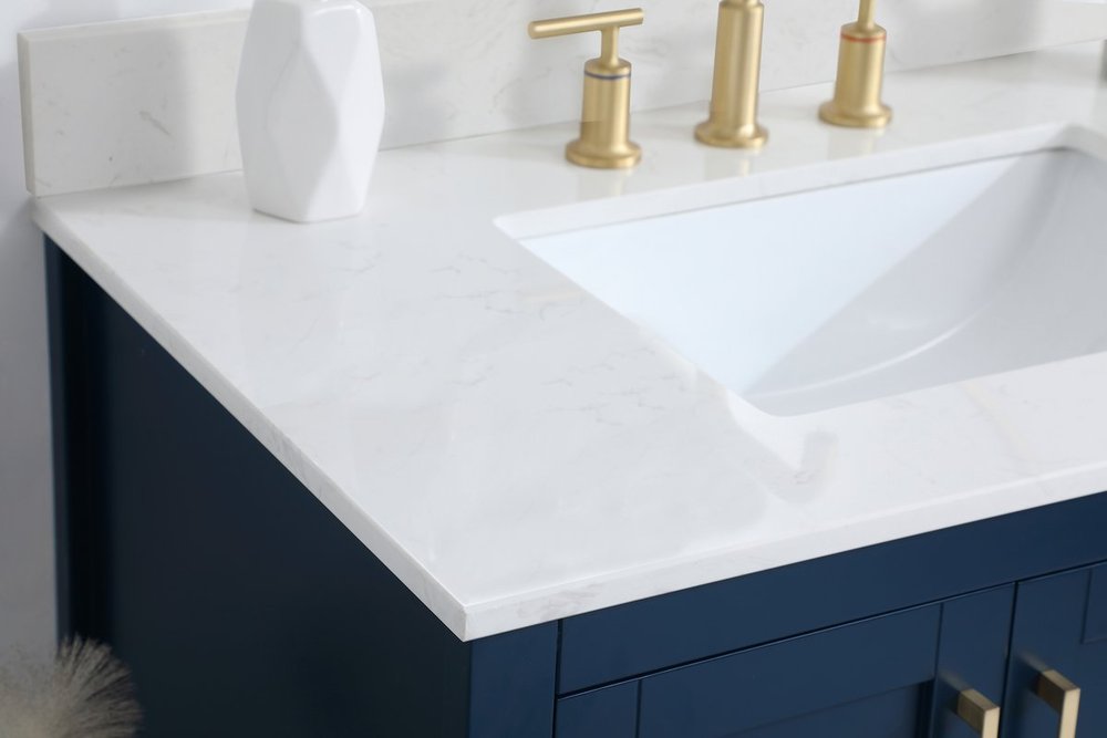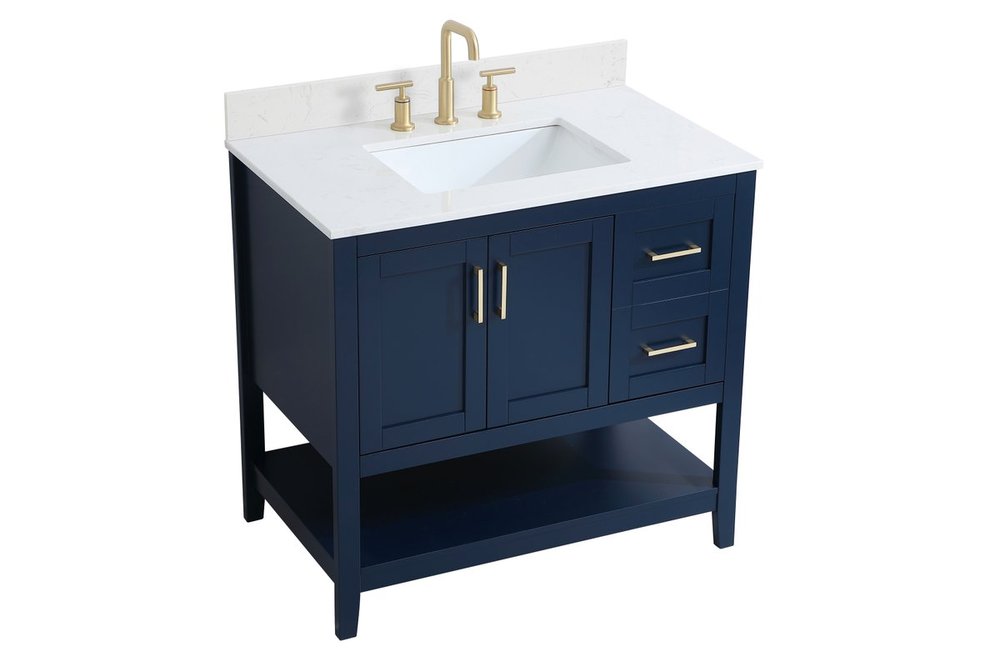 The nonchalant attitude of this 36" traditional Blue finish vanity will have you wanting more. The slender gold handle bars open the 3 cabinet doors to reveal ample storage space to put away and store bathroom essentials, and the open space below allows for you to place clean towels on the rack. Topped with a Calacatta engineered marble countertop, you and your guests will enjoy this easy going vanity. Comes with a matching backsplash to complete the look and protects your wall.