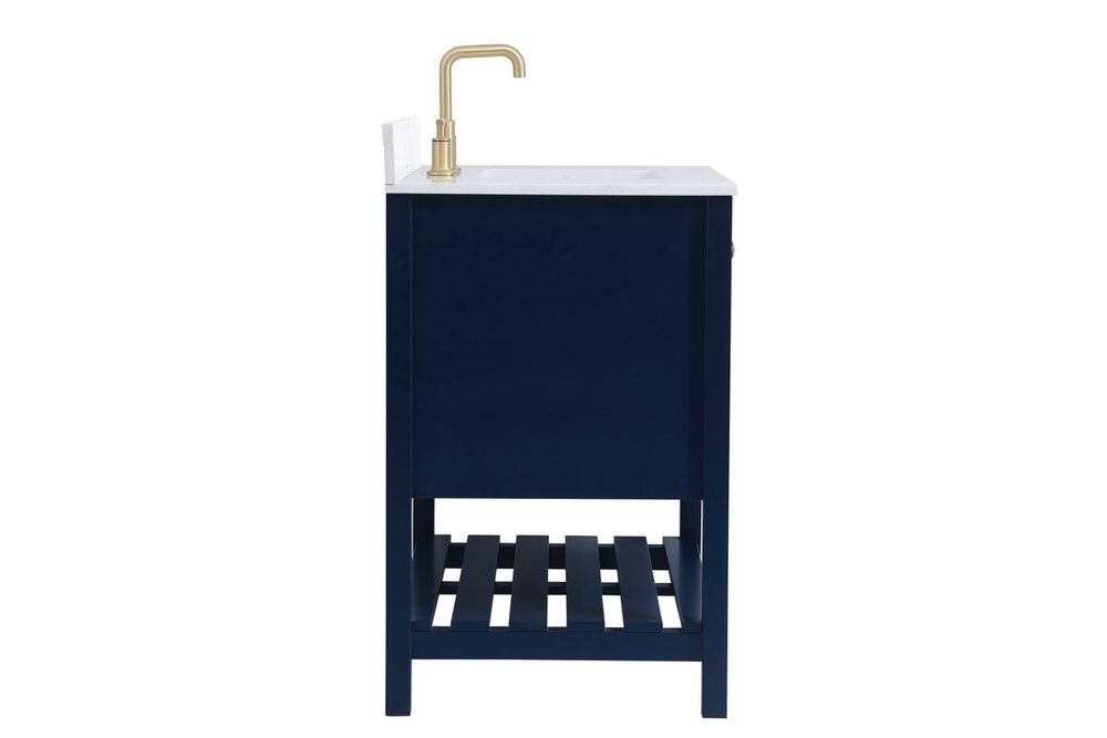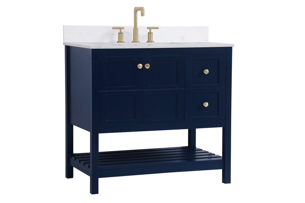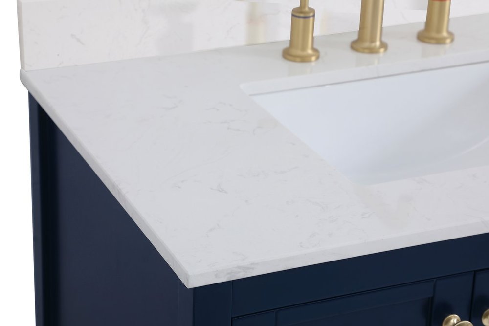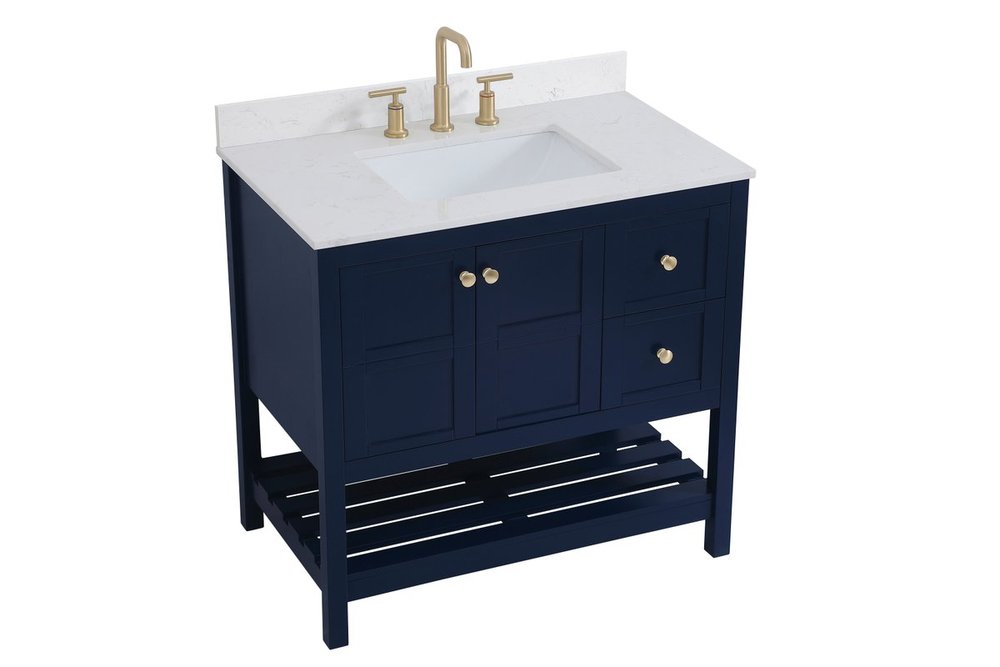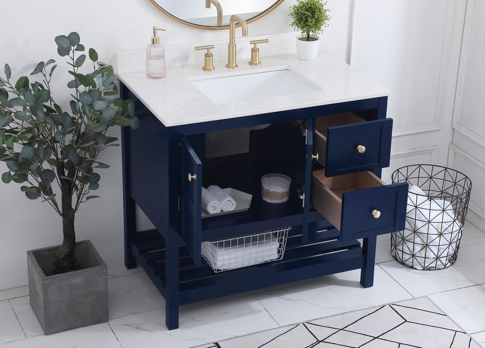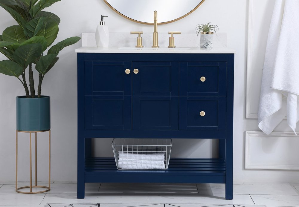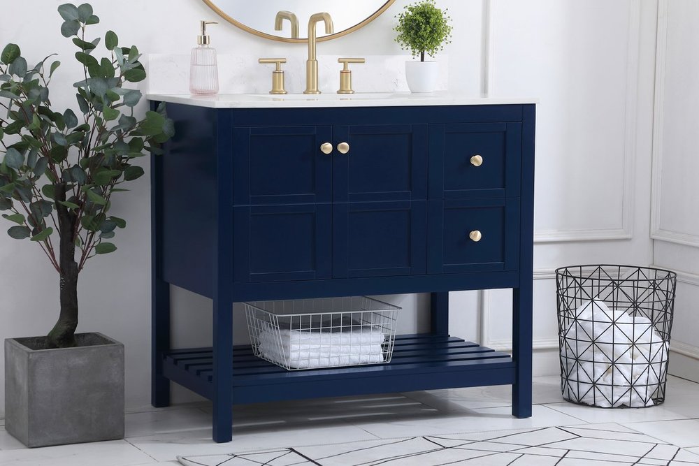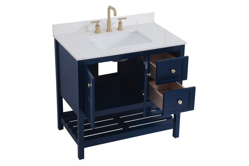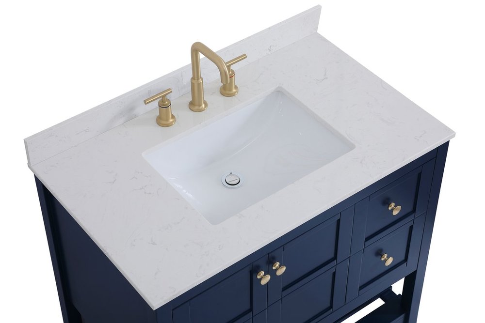 The subtle beauty of the Theo collection 36" vanity in a blue finish exudes comfortable luxury. Its modern, yet traditional beauty will surely dress up your bathroom or powder room without any fuss. The white stone countertop and porcelain undermount sink shows quiet opulence, and the legs support upright without fail. Gold hardware complements the trendy blue finish, with pulls adorning the two cabinet doors and two drawers, showcasing ample storage space within. Slated shelf allows for additional space to organize your towels. Whether this vanity is in your bathroom or for guests, its presence will surely elevate the aesthetics of your room. Comes with a matching backsplash to complete the look and protects your wall.