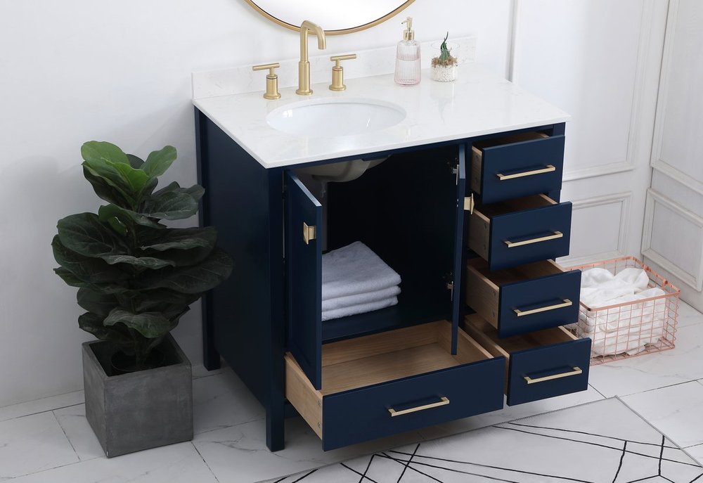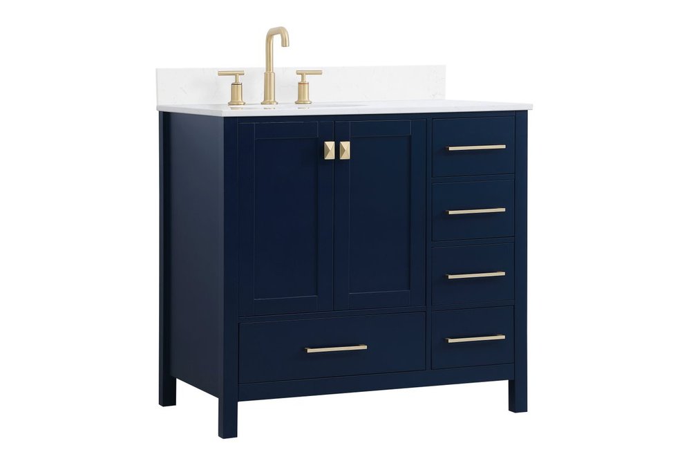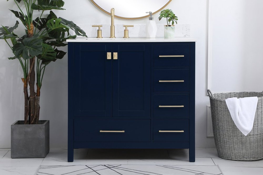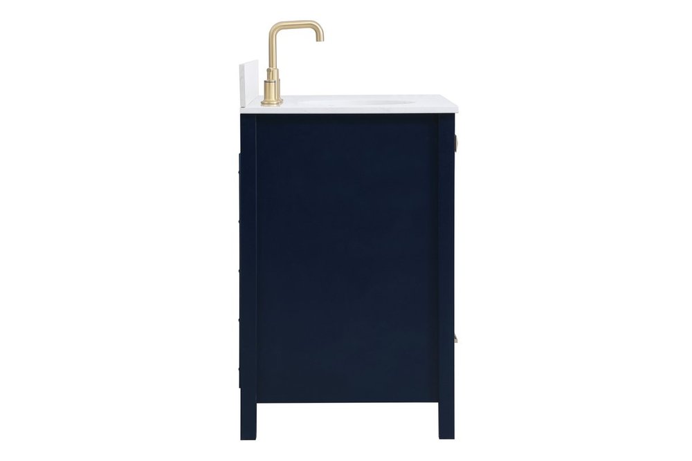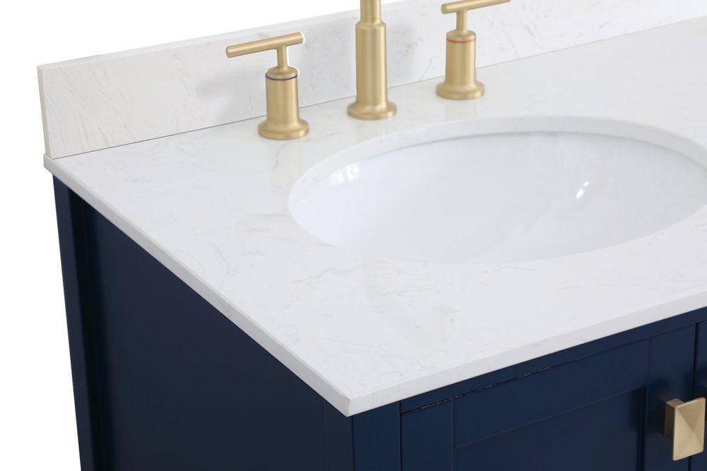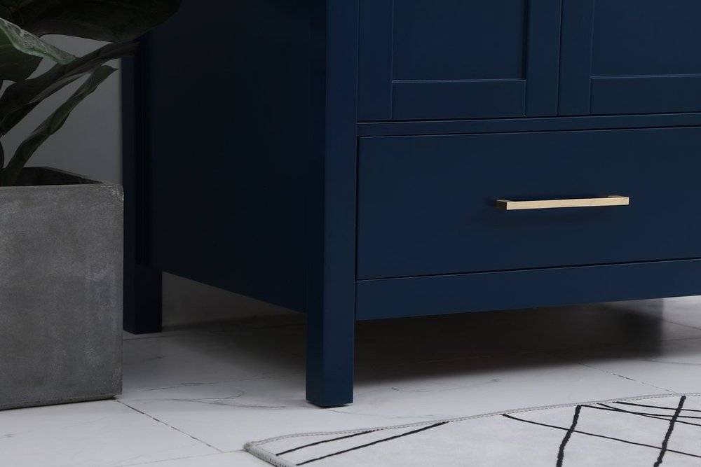 Never compromise beauty--the Irene collection stunning vanity in a blue finish will add lovely sophistication and complement any bathroom or powder room, while utilizing its charm and function to provide you with ample storage spaces. Satin gold pulls gently adorn the minimalist cabinet doors and drawers at the base, allowing for you to store away your bathroom essentials. The calacatta engineered marble countertop, porcelain undermount sink, dignified subtle engravings on the side edges, and squared legs all come together to create contemporary beauty. Work with your space, and design a beautiful room, no matter the size. Comes with a matching backsplash to complete the look and protects your wall.