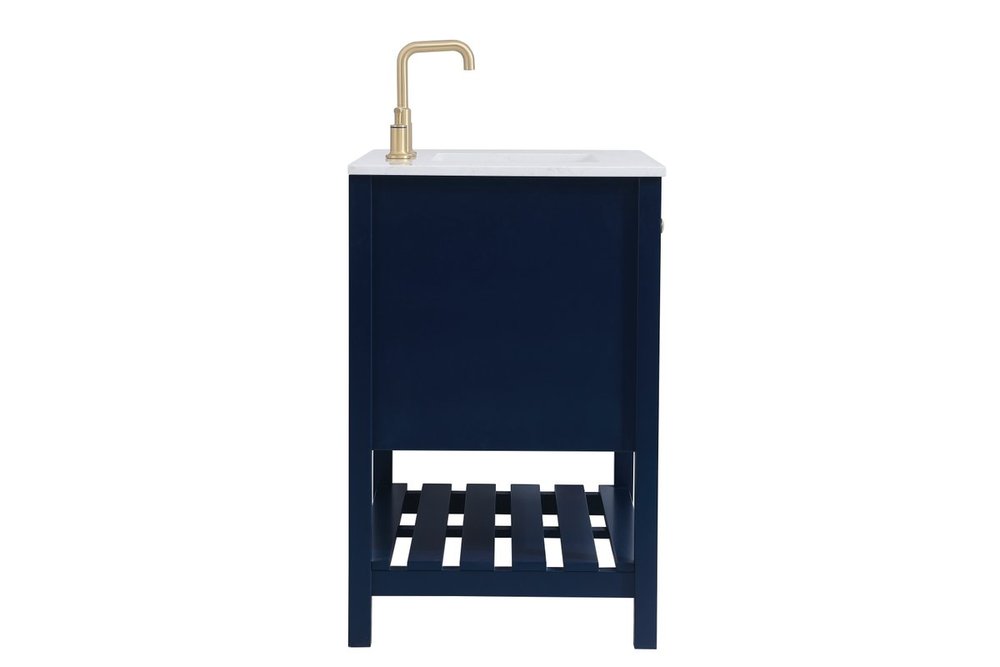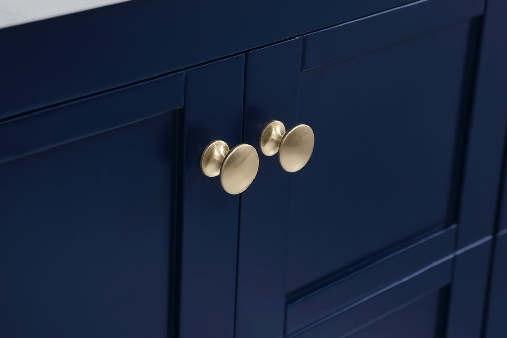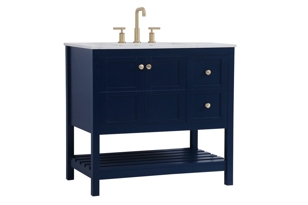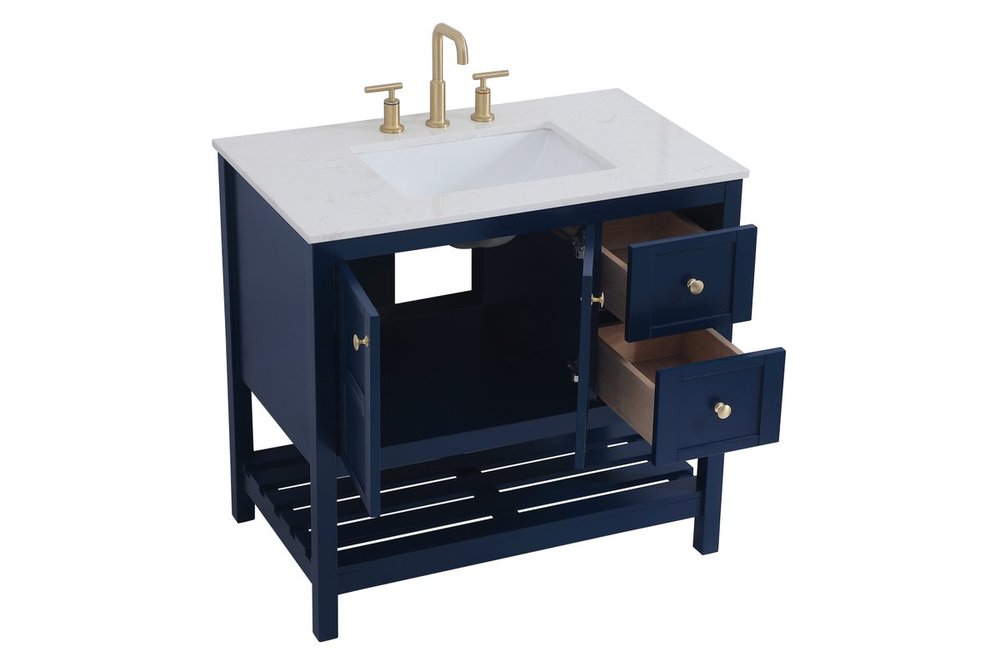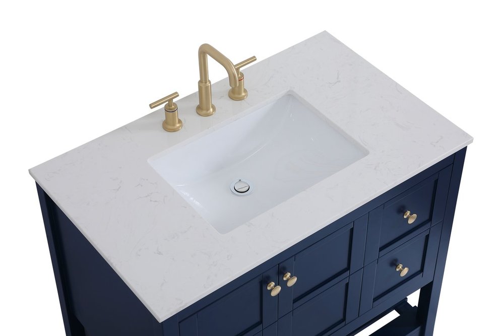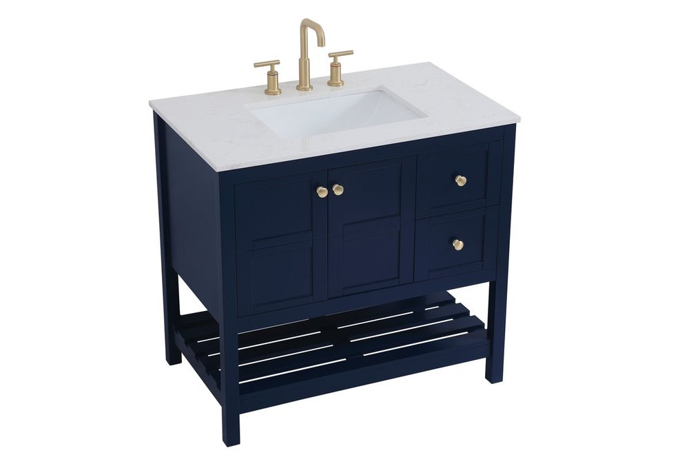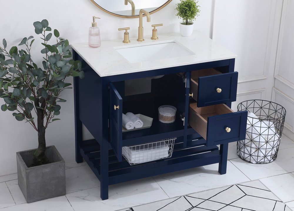 The subtle beauty of the Theo collection 36" vanity in a blue finish exudes comfortable luxury. Its modern, yet traditional beauty will surely dress up your bathroom or powder room without any fuss. The white stone countertop and porcelain undermount sink shows quiet opulence, and the legs support upright without fail. Gold hardware complements the trendy blue finish, with pulls adorning the two cabinet doors and two drawers, showcasing ample storage space within. Slated shelf allows for additional space to organize your towels. Whether this vanity is in your bathroom or for guests, its presence will surely elevate the aesthetics of your room.