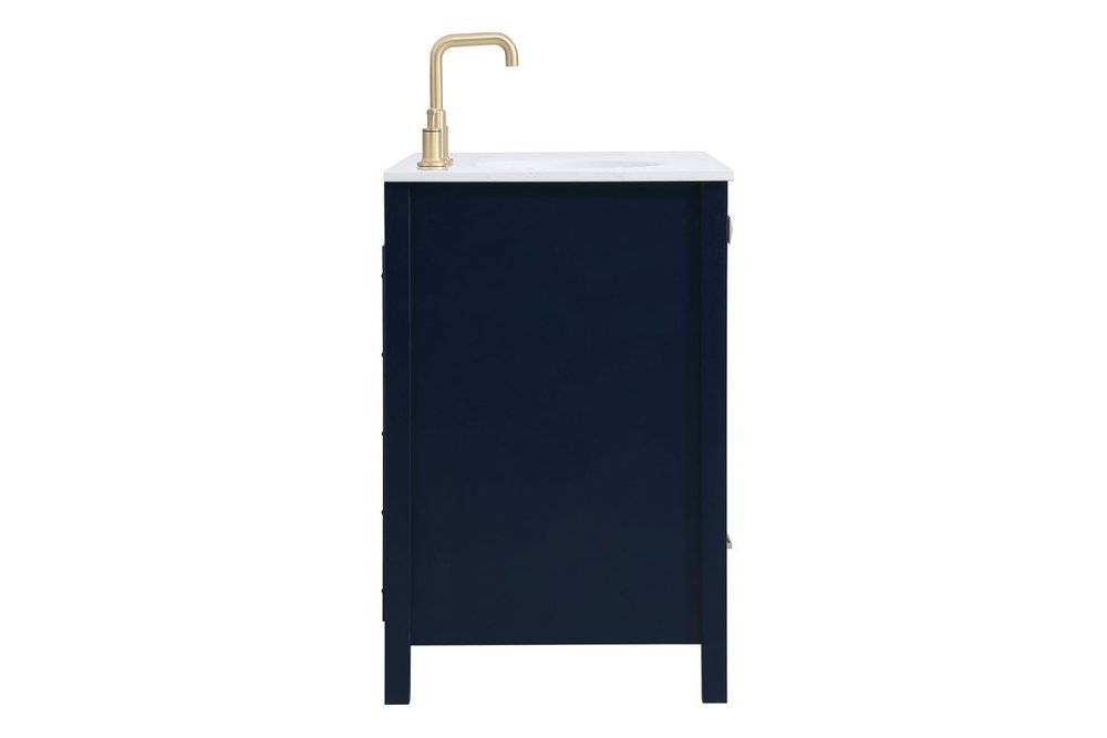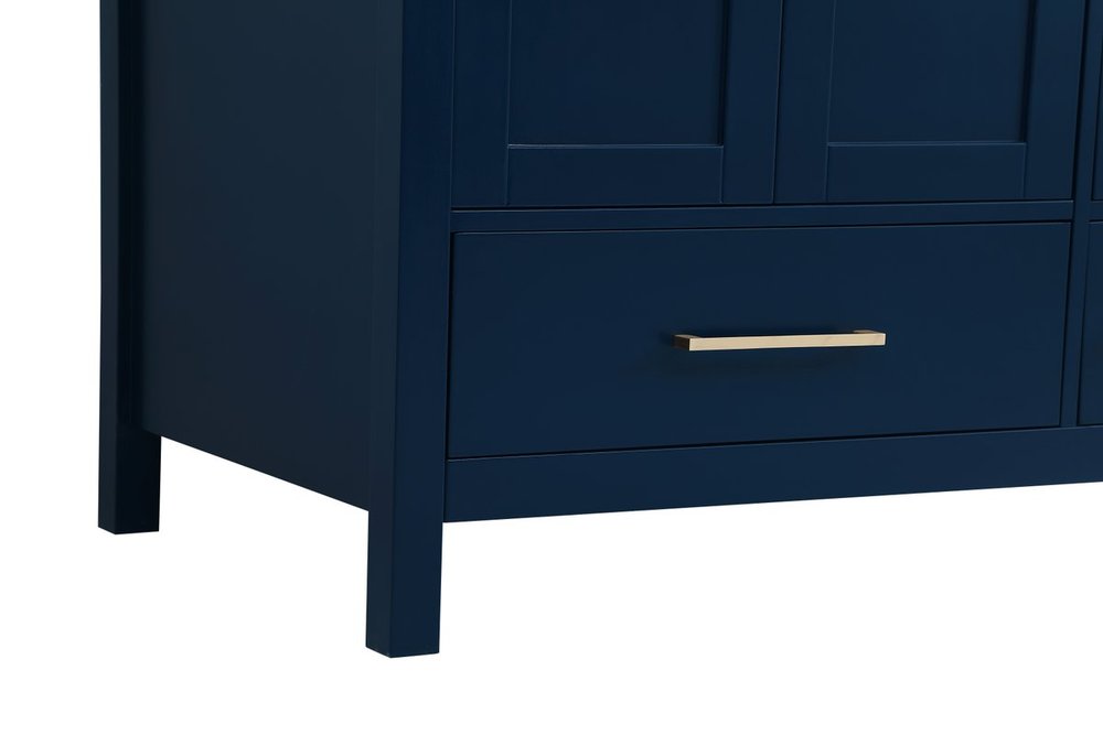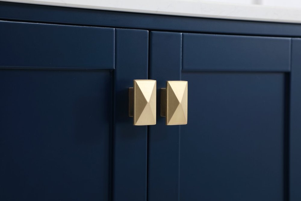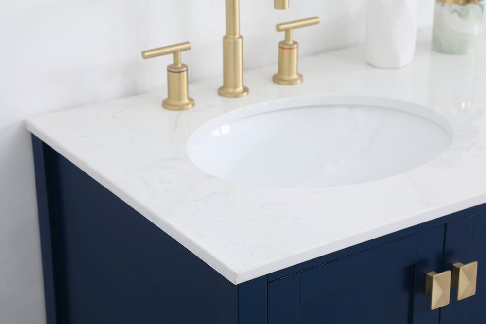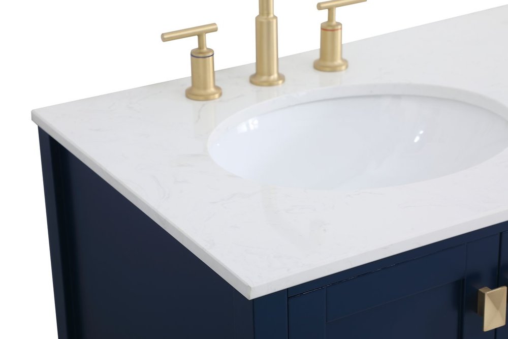 Never compromise beauty--the Irene collection stunning vanity in a blue finish will add lovely sophistication and complement any bathroom or powder room, while utilizing its charm and function to provide you with ample storage spaces. Satin gold pulls gently adorn the minimalist cabinet doors and drawers at the base, allowing for you to store away your bathroom essentials. The calacatta engineered marble countertop, porcelain undermount sink, dignified subtle engravings on the side edges, and squared legs all come together to create contemporary beauty. Work with your space, and design a beautiful room, no matter the size.