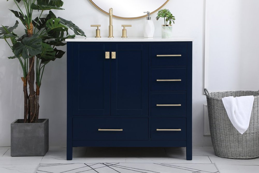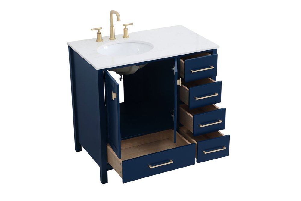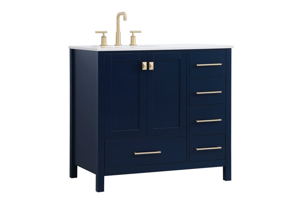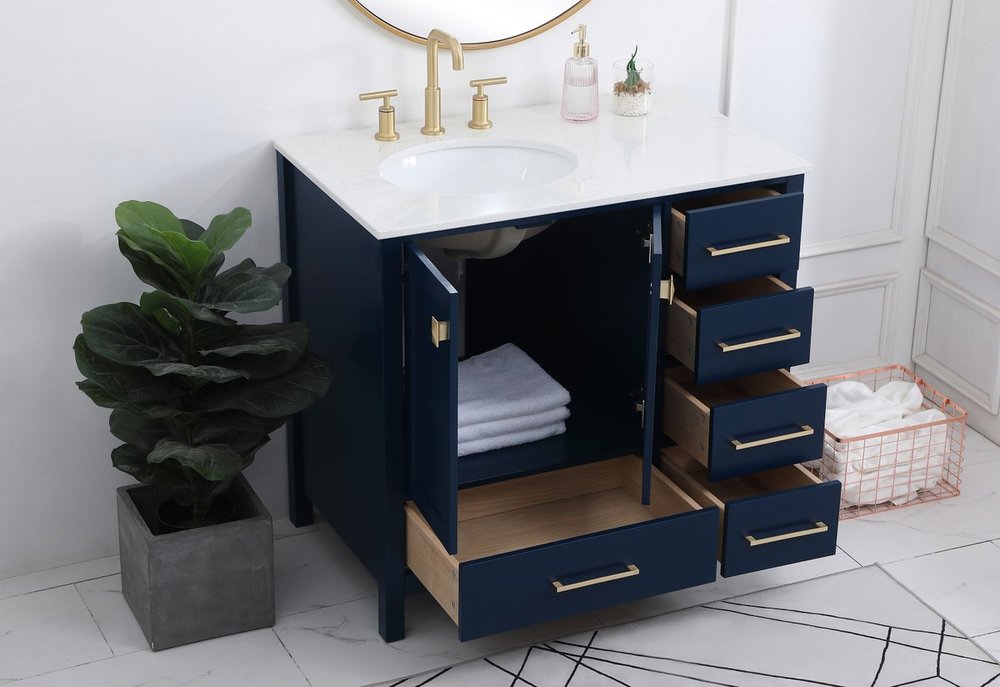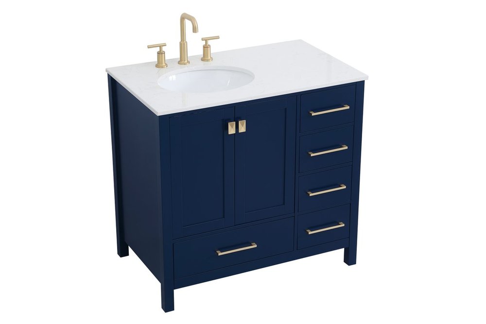 Never compromise beauty--the Irene collection stunning vanity in a blue finish will add lovely sophistication and complement any bathroom or powder room, while utilizing its charm and function to provide you with ample storage spaces. Satin gold pulls gently adorn the minimalist cabinet doors and drawers at the base, allowing for you to store away your bathroom essentials. The calacatta engineered marble countertop, porcelain undermount sink, dignified subtle engravings on the side edges, and squared legs all come together to create contemporary beauty. Work with your space, and design a beautiful room, no matter the size.