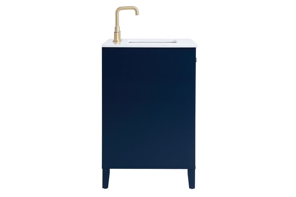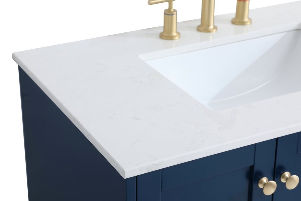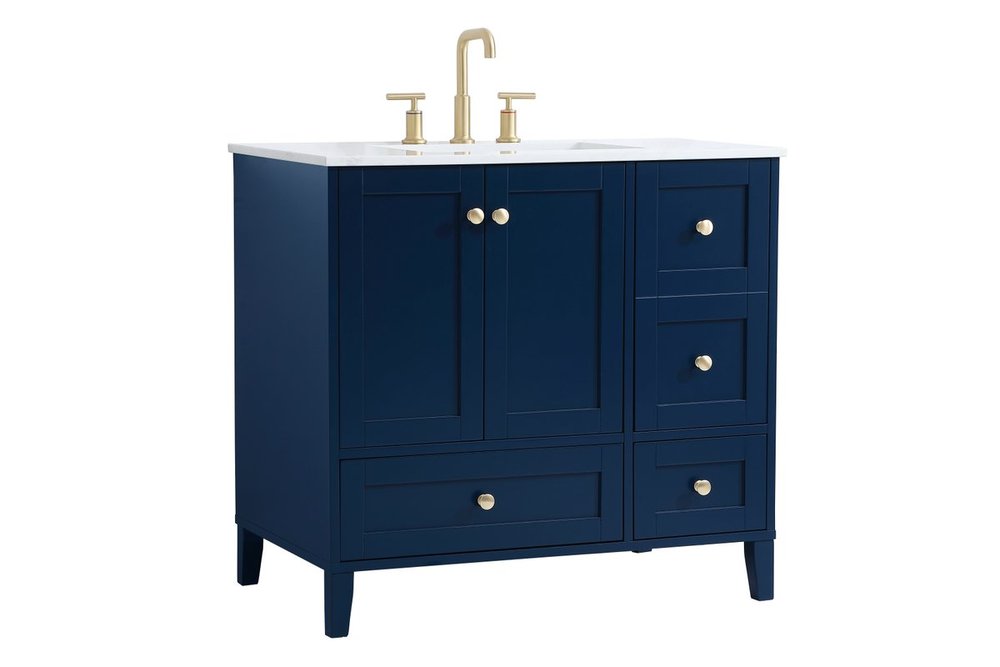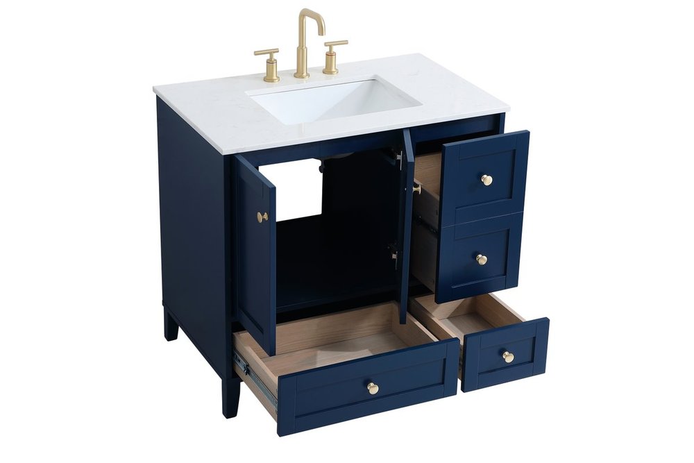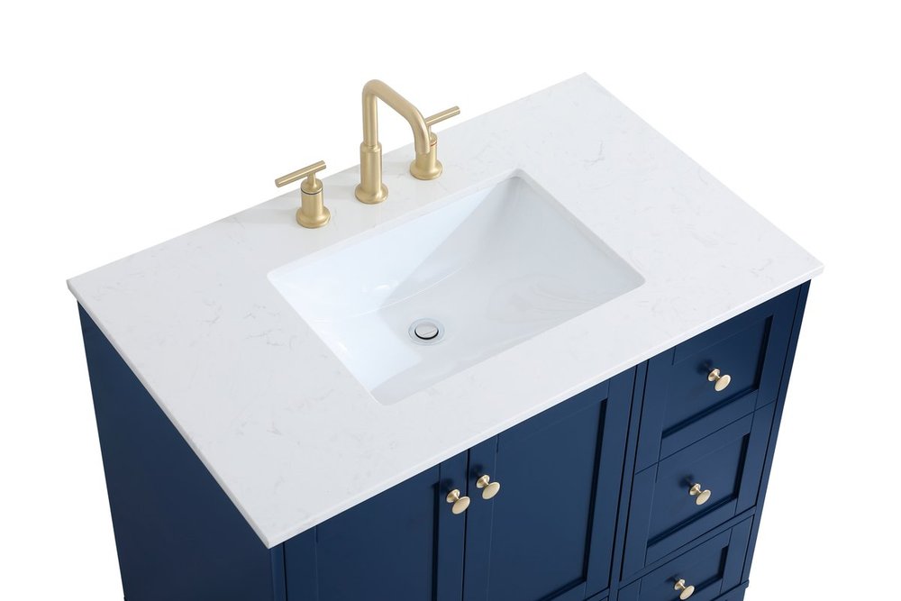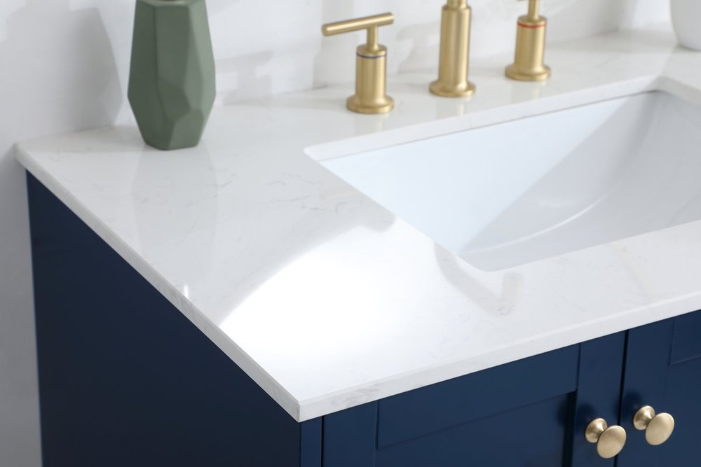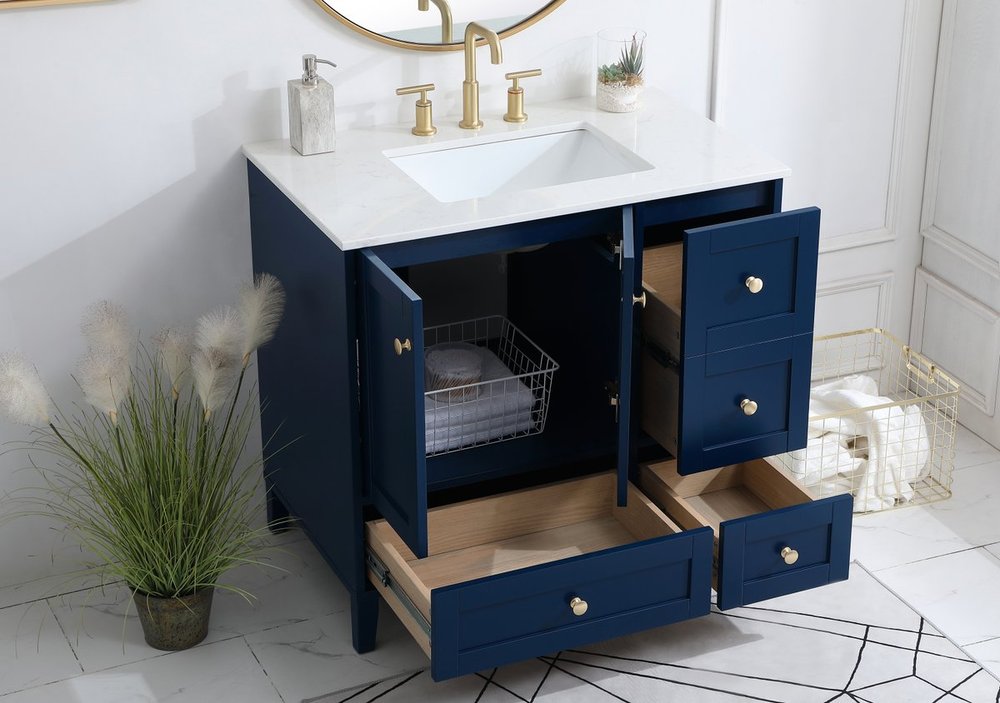 While unassuming, this 36" vanity in a Blue finish sure knows how to redefine luxury. The sleek gold knobs adorn the double cabinet doors and 3 drawers which allow you to store your bathroom toiletries and necessities. Standing strong on oblique legs and dressed with a Calacatta engineered marble countertop, this vanity will surely create beauty and casual elegance in your bathroom or powder room.