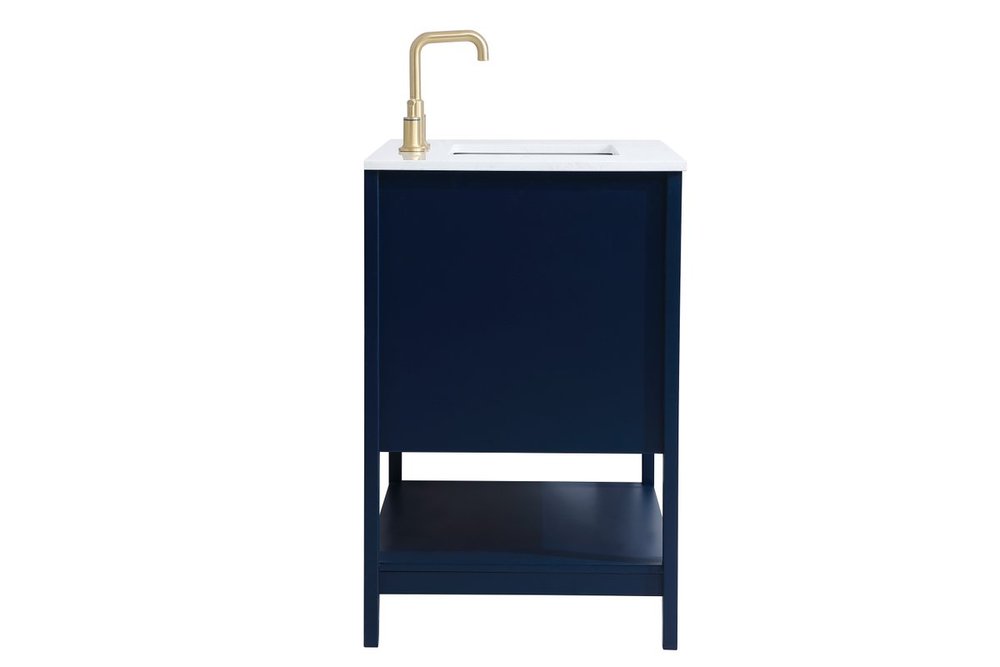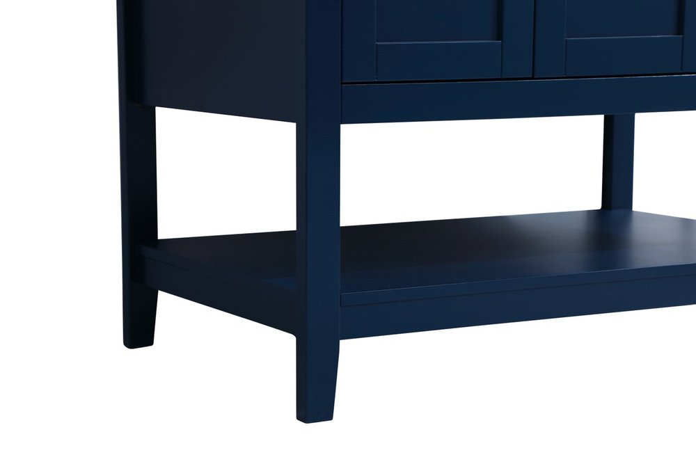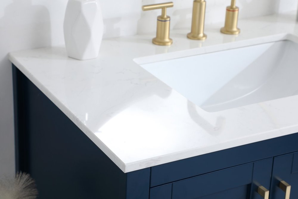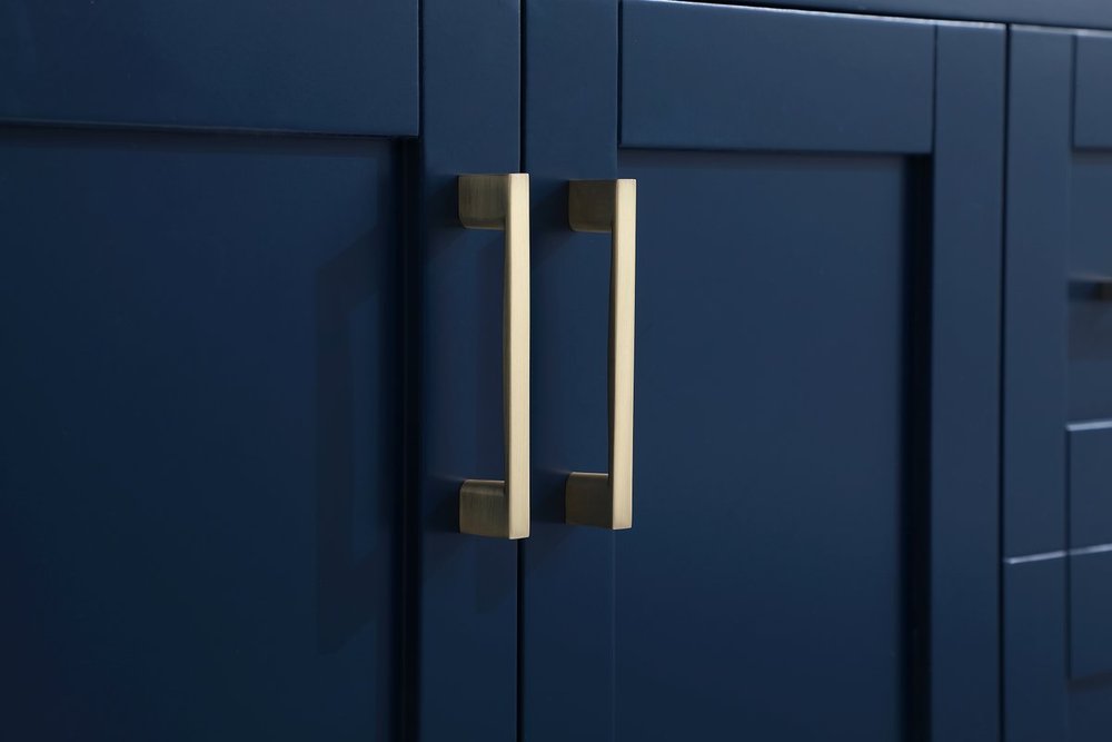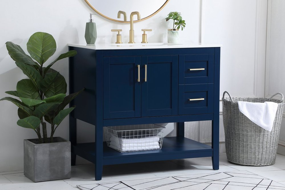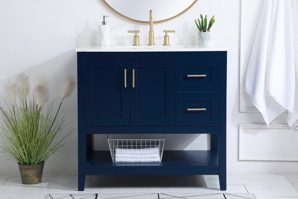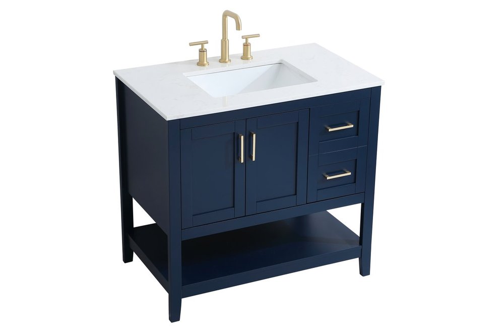 The nonchalant attitude of this 36" traditional Blue finish vanity will have you wanting more. The slender gold handle bars open the 3 cabinet doors to reveal ample storage space to put away and store bathroom essentials, and the open space below allows for you to place clean towels on the rack. Topped with a Calacatta engineered marble countertop, you and your guests will enjoy this easy going vanity.