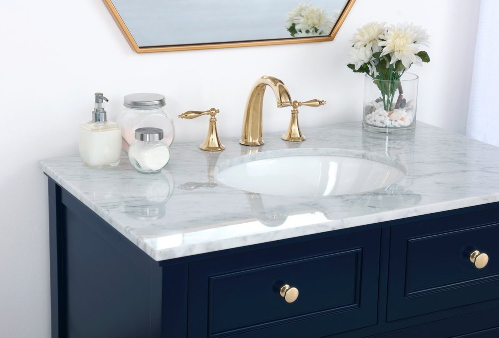 Create a refined and relaxing bath space with this contemporary design vanity, presenting its simplicity and clean straight lines in a minimalist appeal. The 36" vanity, crafted of solid poplar wood, provides ample storage within its soft-close drawer and open shelf base, accentuated with gold hardware. Rounding out the design is a luxurious Itallian Carrara white marble with a white porcelain under-mount oval sink.