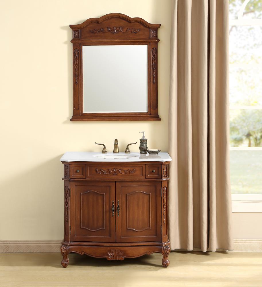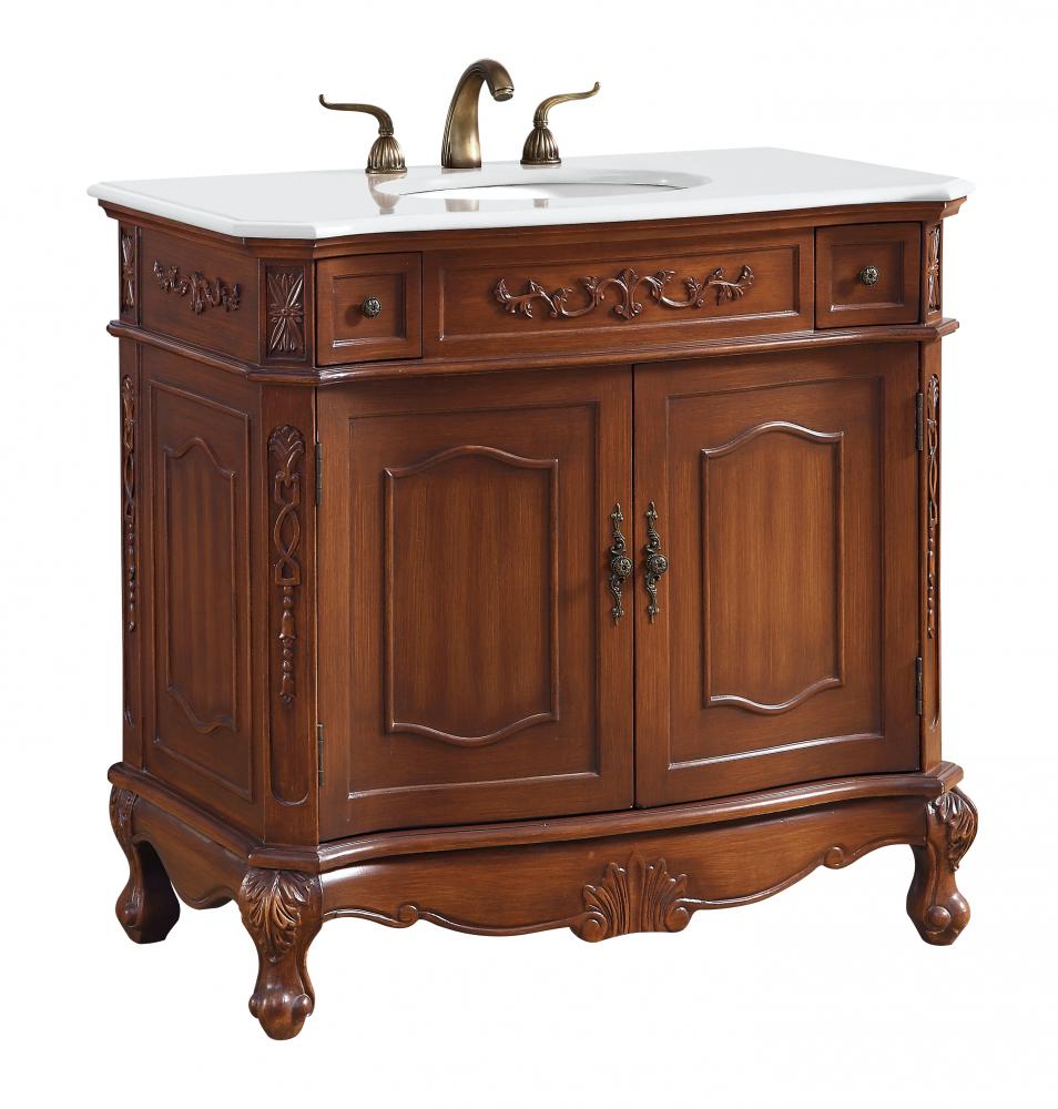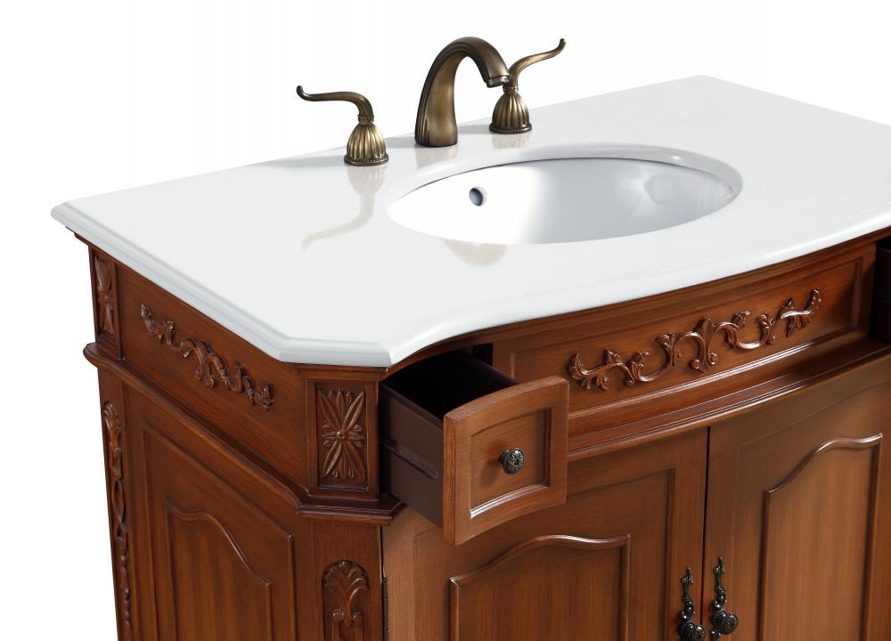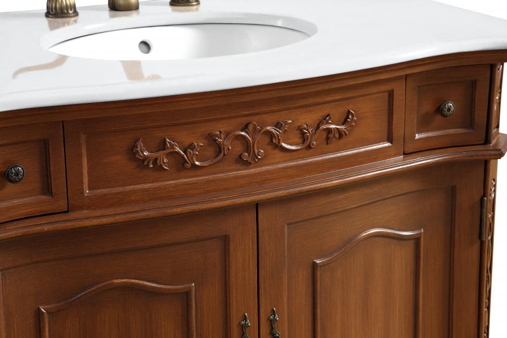 This superb balance of timeless tradition and opulent beauty in a engineered marble-topped vanity will certainly enhance the aesthetics of any home or office bathroom! Featuring an ivory white durable engineered marble countertop complimenting the hand painted cabinet with a delicate carved floral design, stands on stylishly carved solid wood French scroll feet. Don't let the design fool you, the engineered marble countertop and porcelain undermount sink allows for space to get ready, while the antique bronze hardware allows you to discover storage spaces with ease. You and your guests will marvel at this vanity that will both store away your bathroom essentials and enhance the aesthetics of your room.