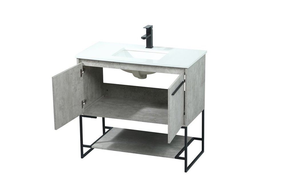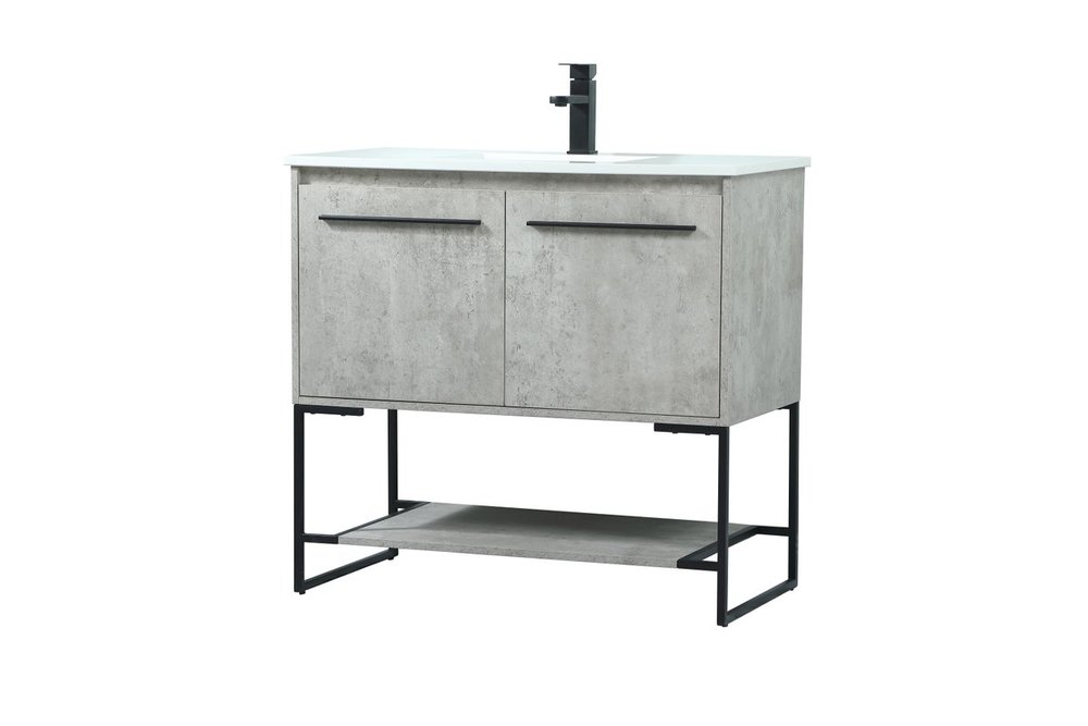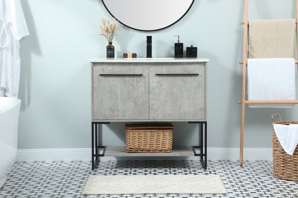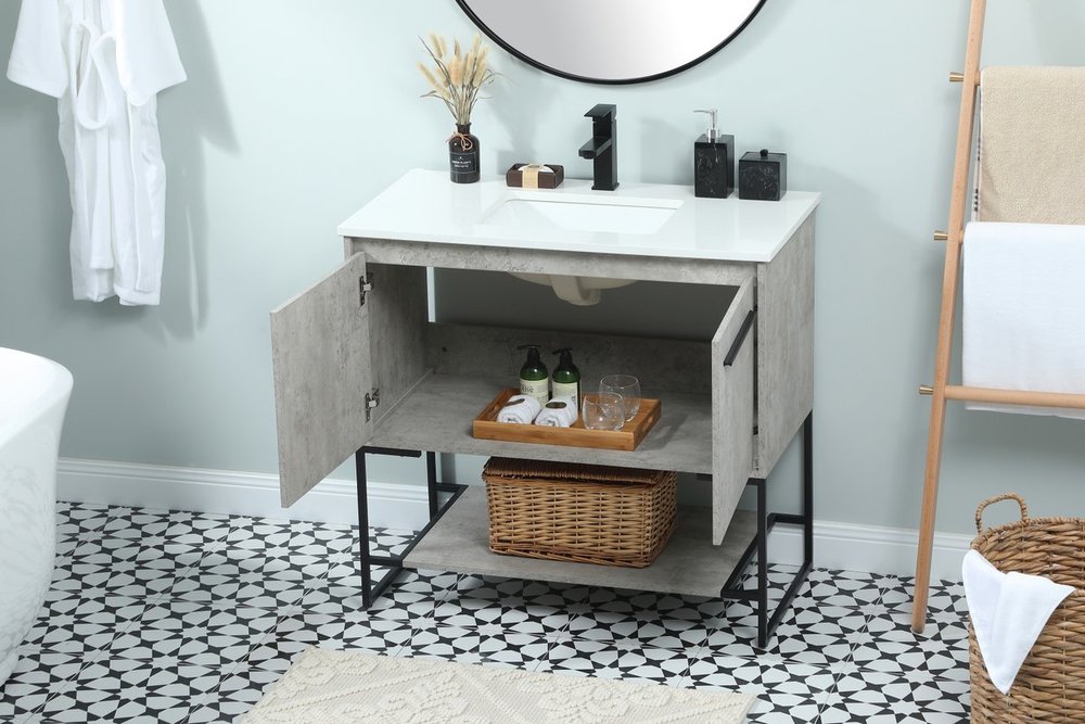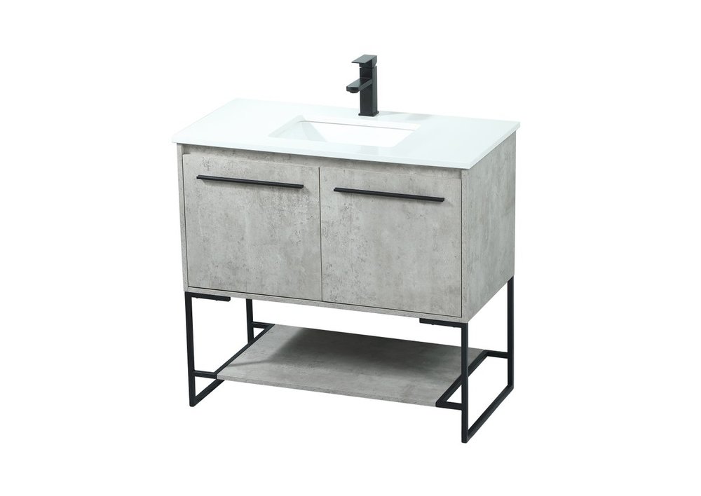 Live in modern comfort with this 36" concrete grey finish vanity. Dressed in a concrete grey and sleek black metal hardware, its contemporary style will have your bathroom or powder room elevated in industrial sophistication. The open shelf at the base and two doors reveal ample storage space for your bathroom essentials and miscellany. Clean lines create its own visual interest, adding trendy looks to your already chic room.