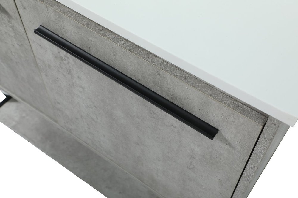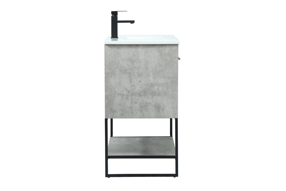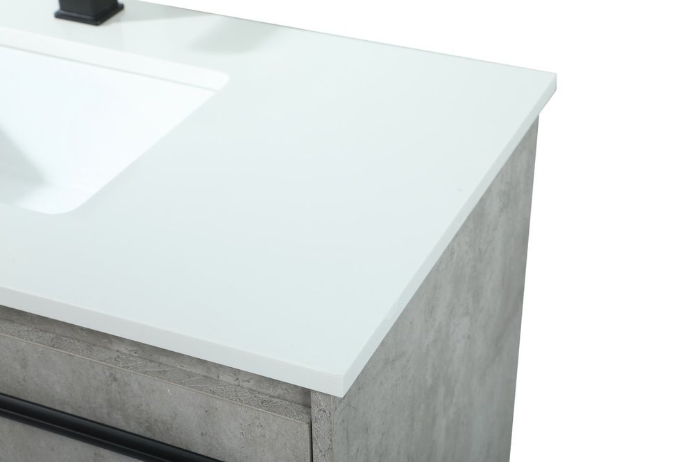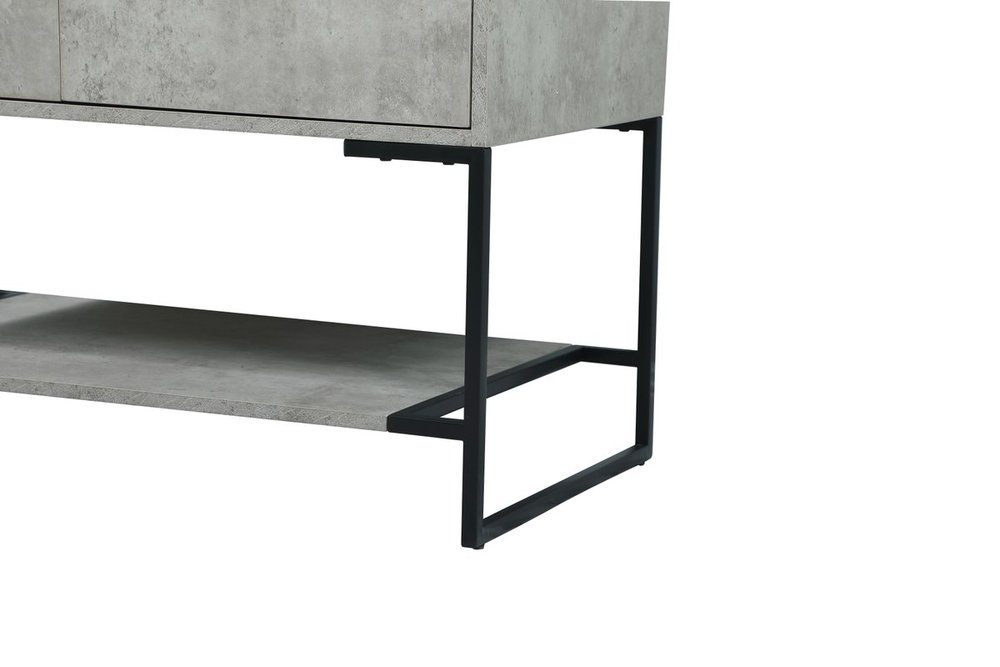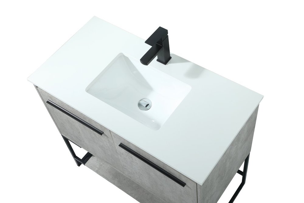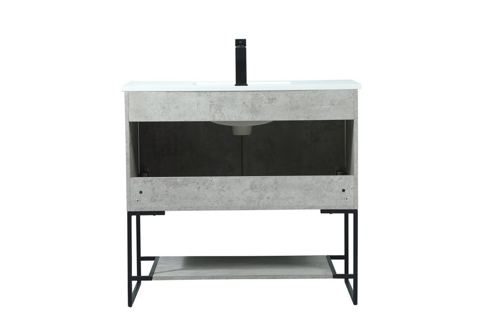 Live in modern comfort with this 36" concrete grey finish vanity. Dressed in a concrete grey and sleek black metal hardware, its contemporary style will have your bathroom or powder room elevated in industrial sophistication. The open shelf at the base and two doors reveal ample storage space for your bathroom essentials and miscellany. Clean lines create its own visual interest, adding trendy looks to your already chic room.