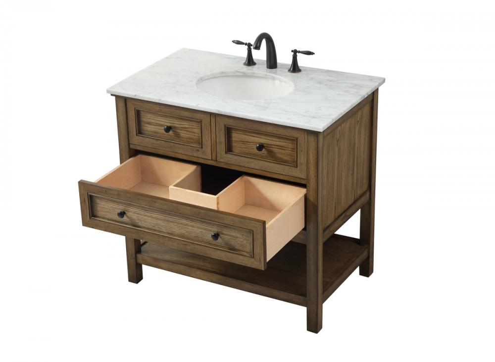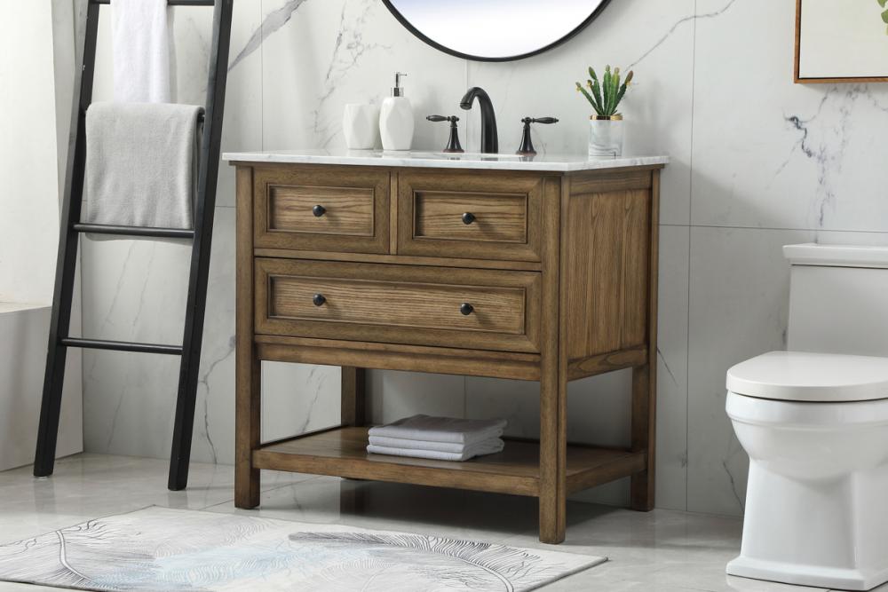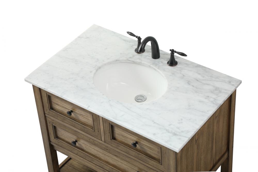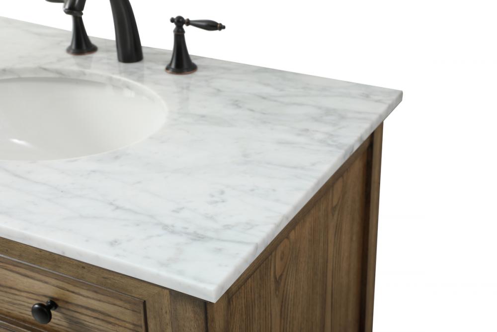 Comes with an undermount porcelain sink and a carrara white marble countertop