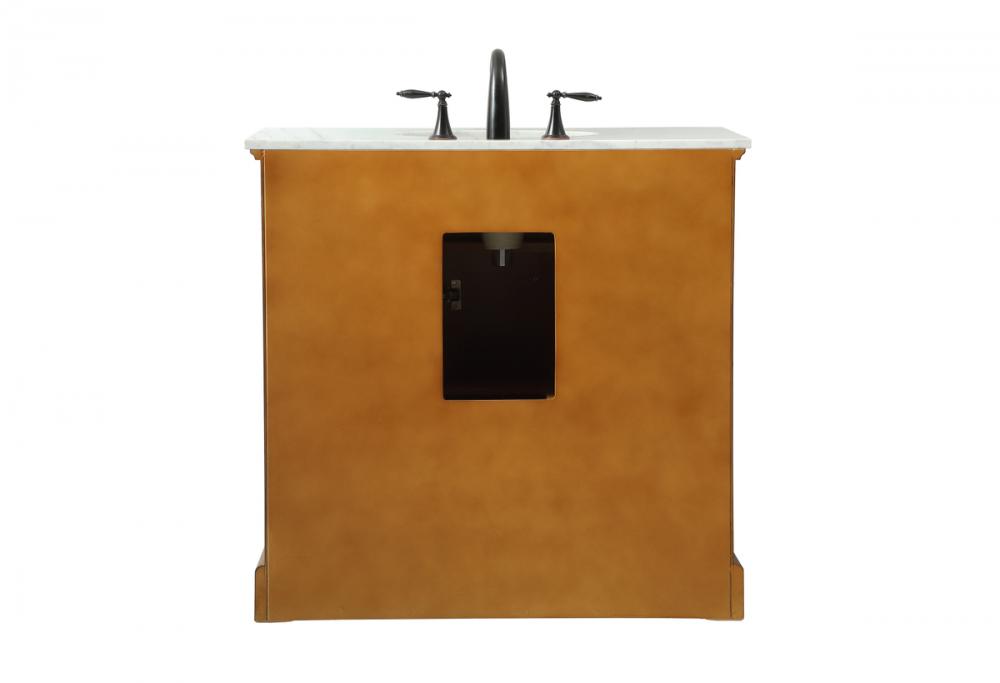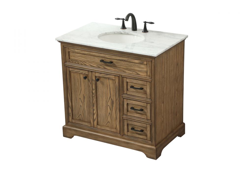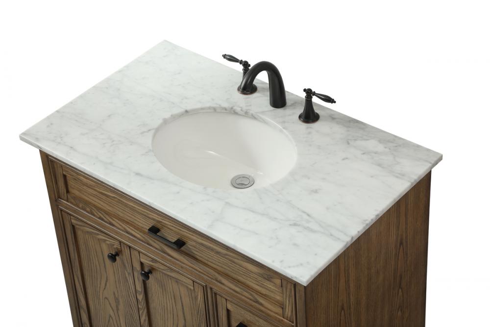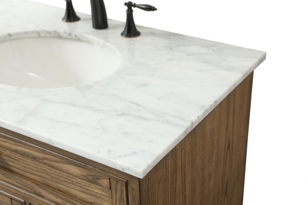 Comes with an undermount porcelain sink and a carrara white marble countertop