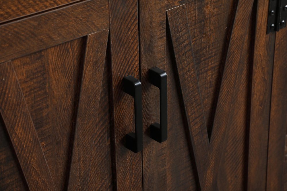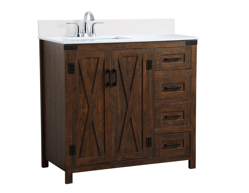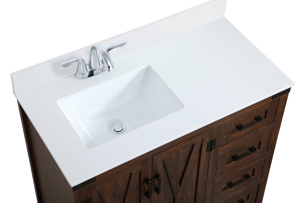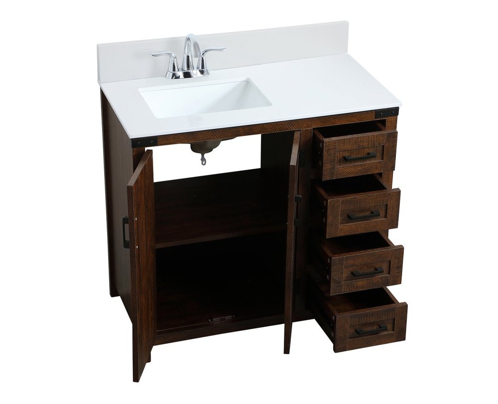 The 36" espresso finish vanity recalls a time of rustic nature. Reminiscent of barn doors, the 2 door cabinet and 4 drawers add both stylistic charm and function with its plethora of storage options for all your bathroom miscellany. Whether for your bathroom or the guests', everyone will marvel at its lively personality. Comes with a matching backsplash to complete the look and protects your wall.