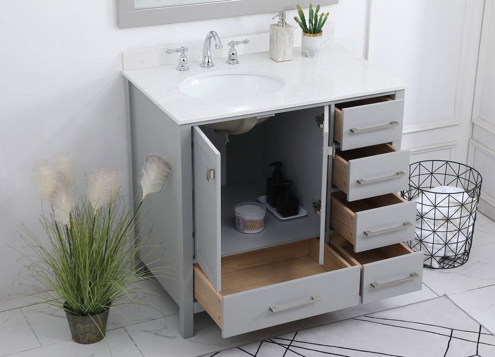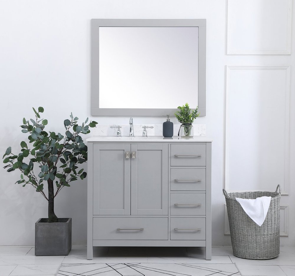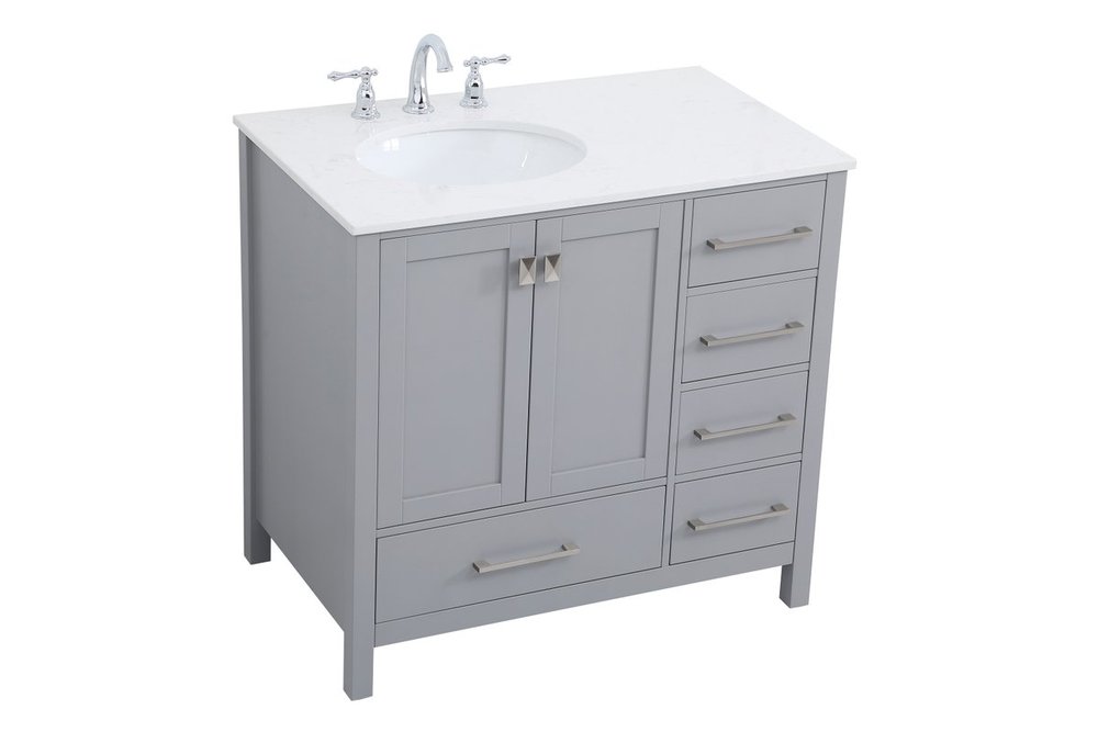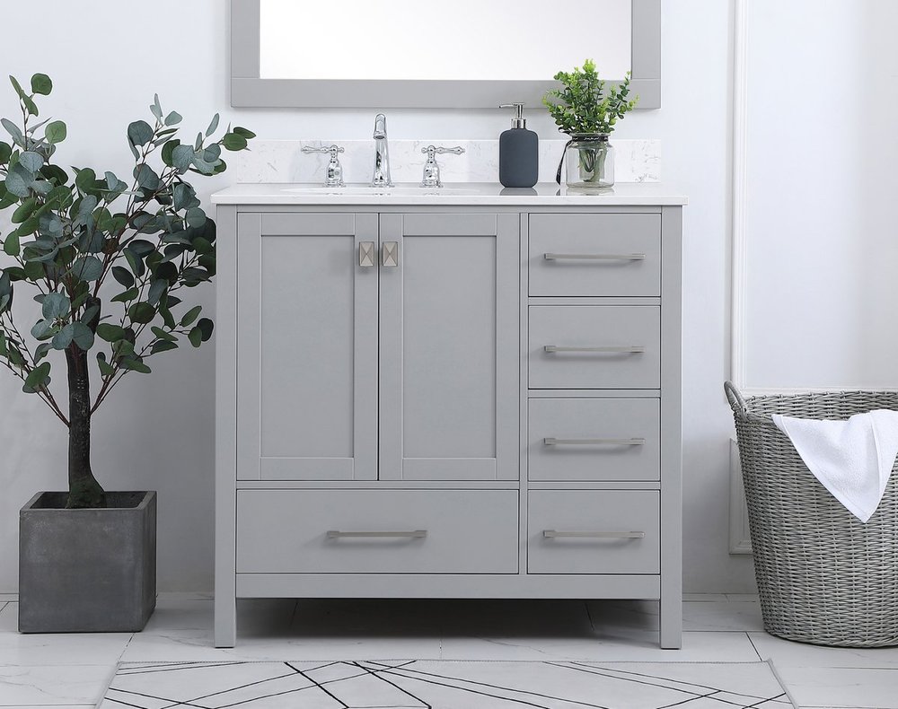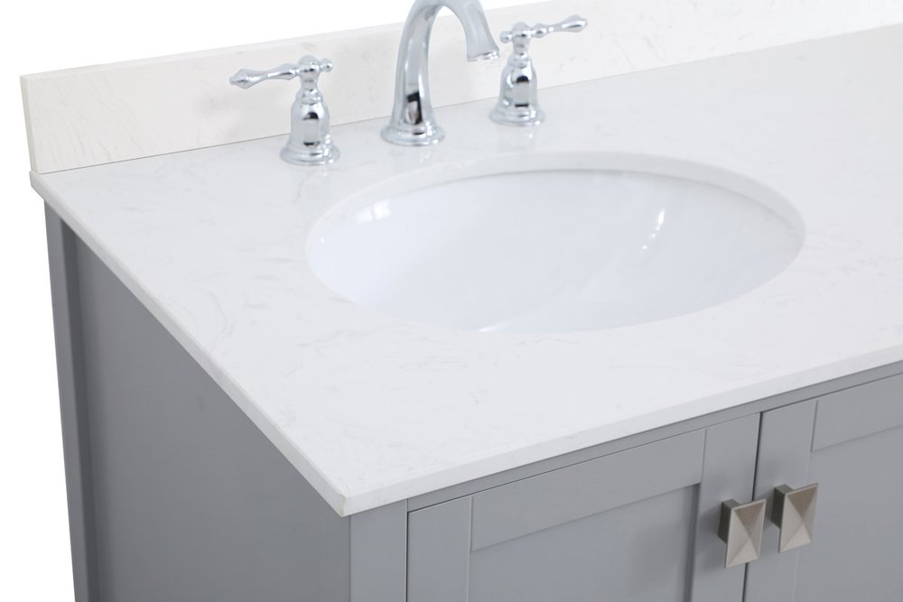 Never compromise beauty--the Irene collection stunning vanity in a gray finish will add lovely sophistication and complement any bathroom or powder room, while utilizing its charm and function to provide you with ample storage spaces. Brushed nickel pulls gently adorn the minimalist cabinet doors and drawers at the base, allowing for you to store away your bathroom essentials. The calacatta engineered marble countertop, porcelain undermount sink, dignified subtle engravings on the side edges, and squared legs all come together to create contemporary beauty. Work with your space, and design a beautiful room, no matter the size. Comes with a matching backsplash to complete the look and protects your wall.