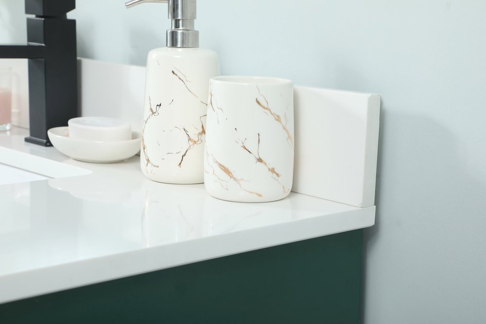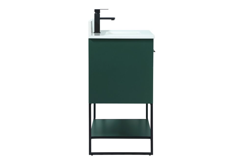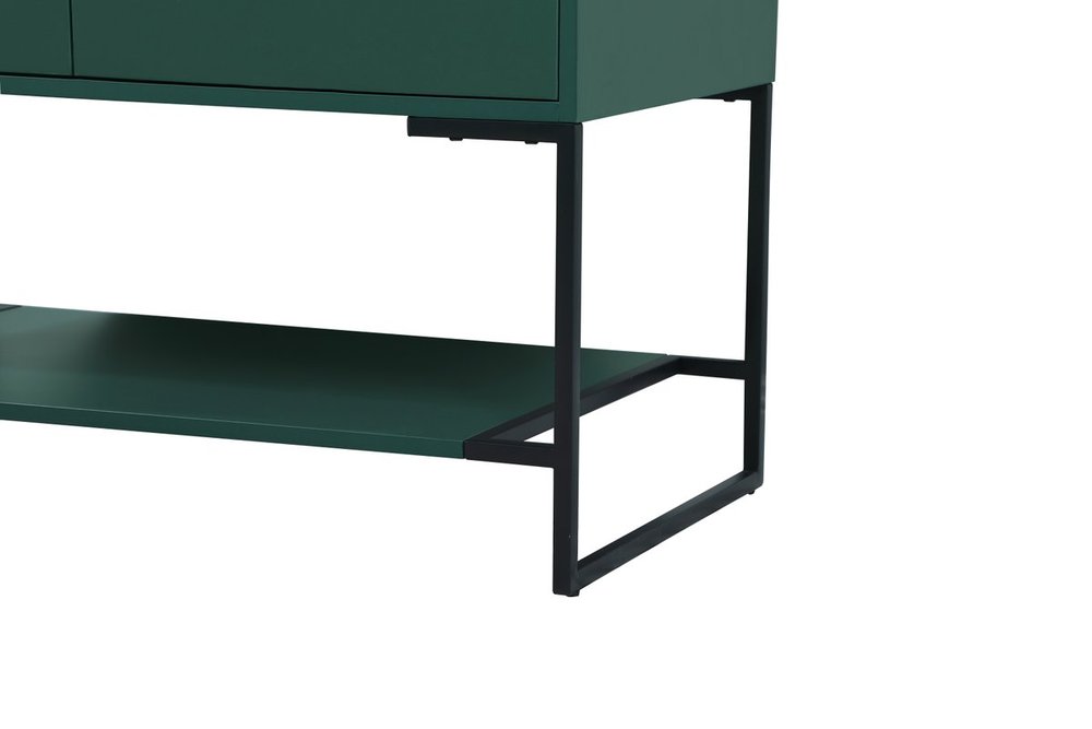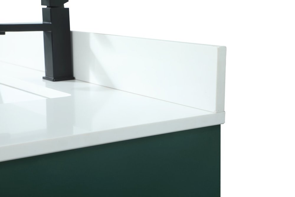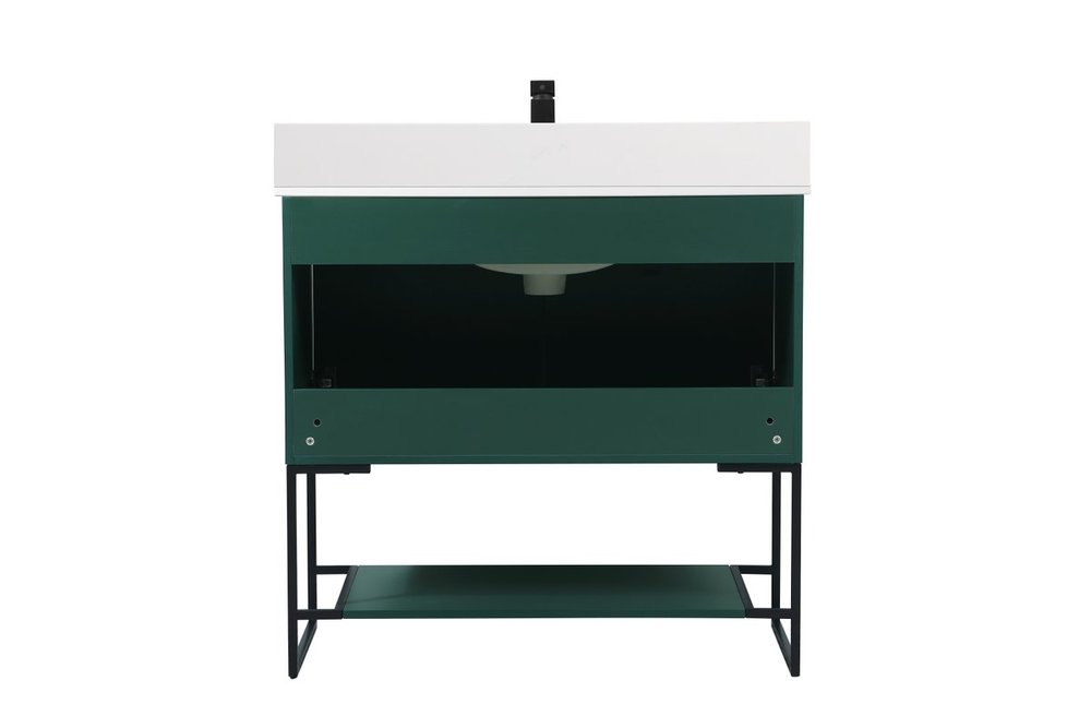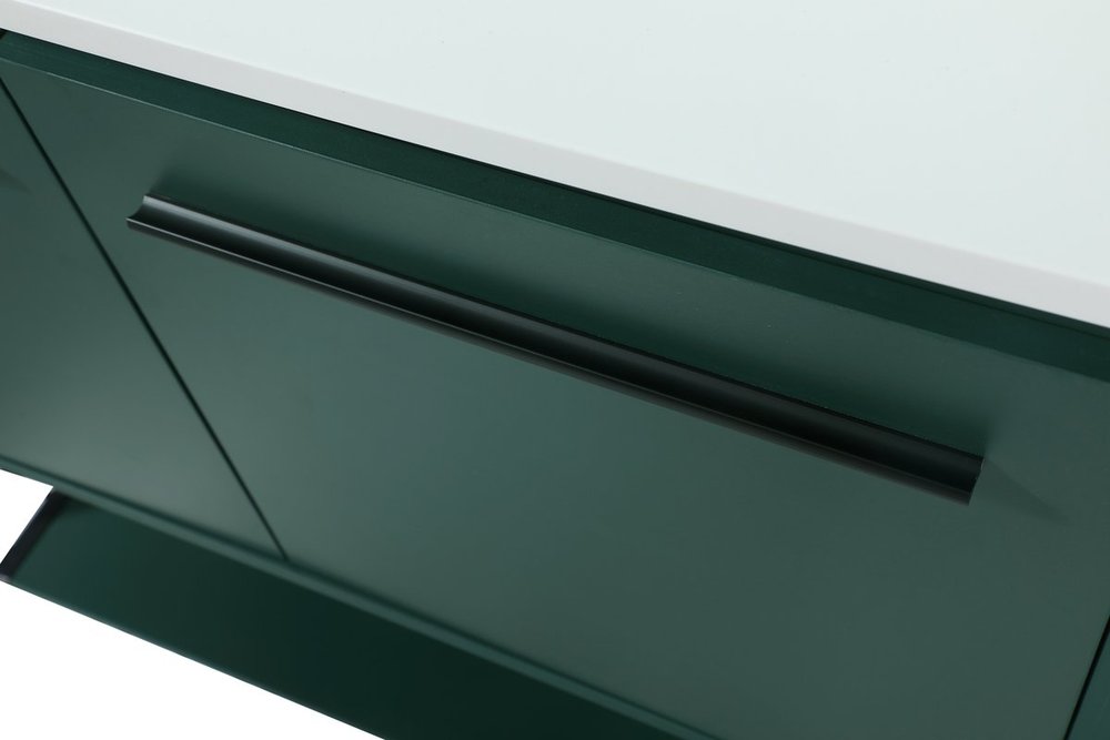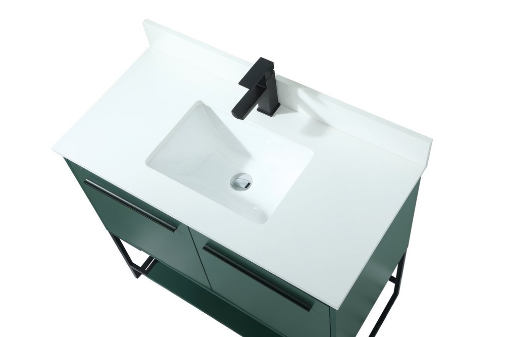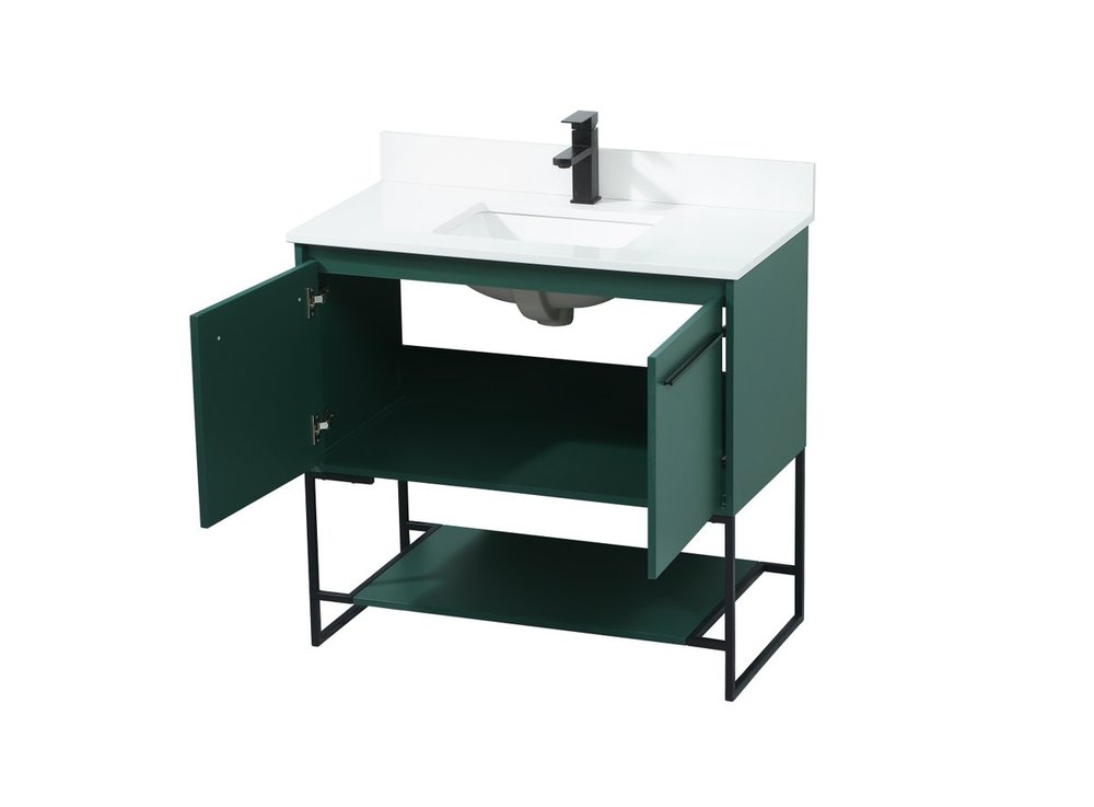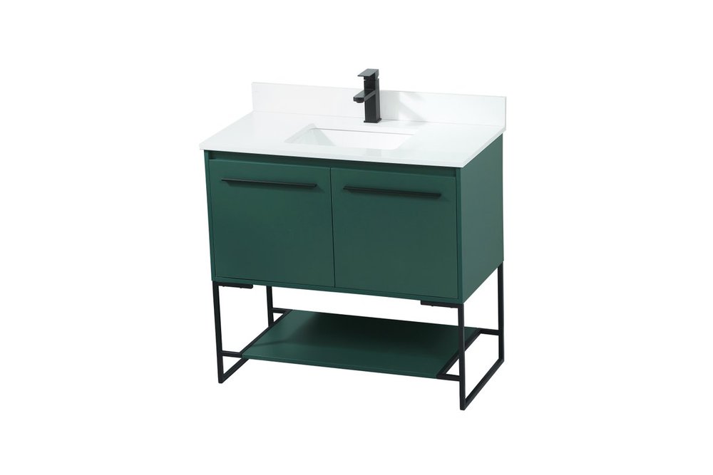 Live in modern comfort with this 36" green finish vanity. Dressed in a green and sleek black metal hardware, its contemporary style will have your bathroom or powder room elevated in industrial sophistication. The open shelf at the base and two doors reveal ample storage space for your bathroom essentials and miscellany. Clean lines create its own visual interest, adding trendy looks to your already chic room. Comes with a matching backsplash to complete the look and protects your wall.
