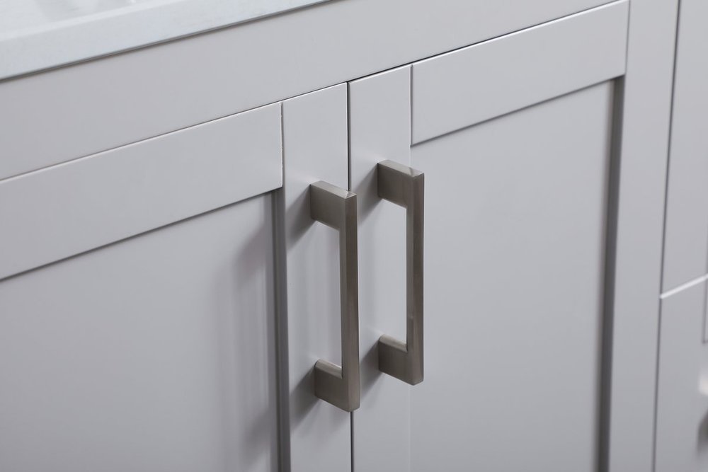 The nonchalant attitude of this 36" traditional grey finish vanity will have you wanting more. The slender brushed nickel handle bars open the 3 cabinet doors to reveal ample storage space to put away and store bathroom essentials, and the open space below allows for you to place clean towels on the rack. Topped with a Calacatta engineered marble countertop, you and your guests will enjoy this easy going vanity.