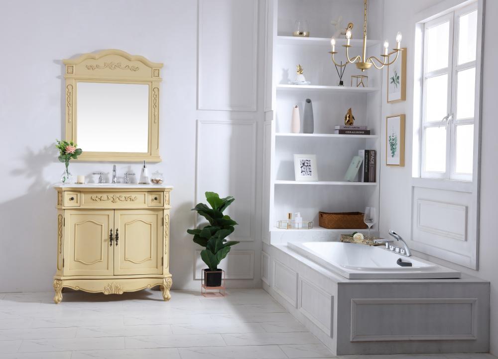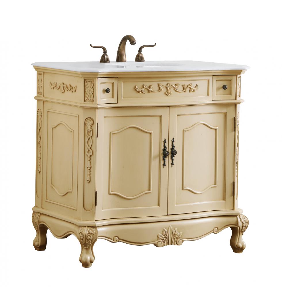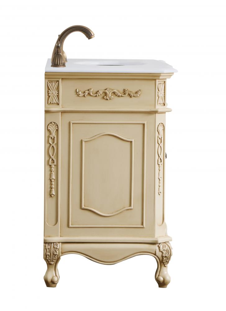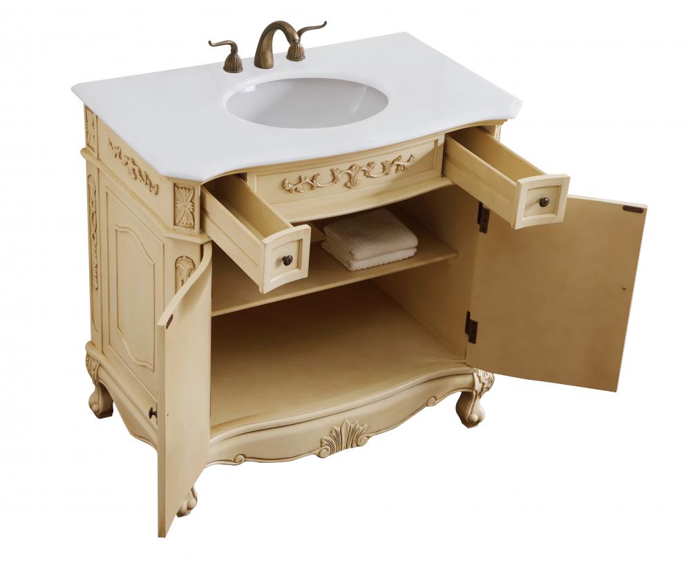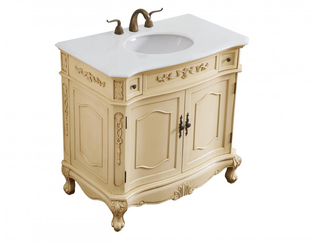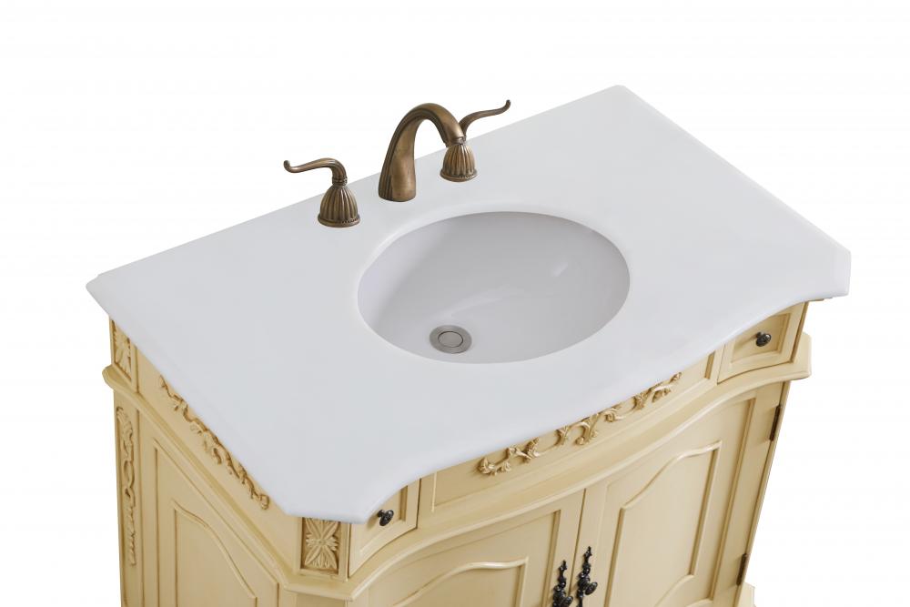 This superb balance of timeless tradition and opulent beauty in a engineered marble-topped vanity will certainly enhance the aesthetics of any home or office bathroom! Featuring an ivory white durable engineered marble countertop complimenting the hand painted cabinet with a delicate carved floral design, stands on stylishly carved solid wood French scroll feet. Don't let the design fool you, the engineered marble countertop and porcelain undermount sink allows for space to get ready, while the antique bronze hardware allows you to discover storage spaces with ease. You and your guests will marvel at this vanity that will both store away your bathroom essentials and enhance the aesthetics of your room.
