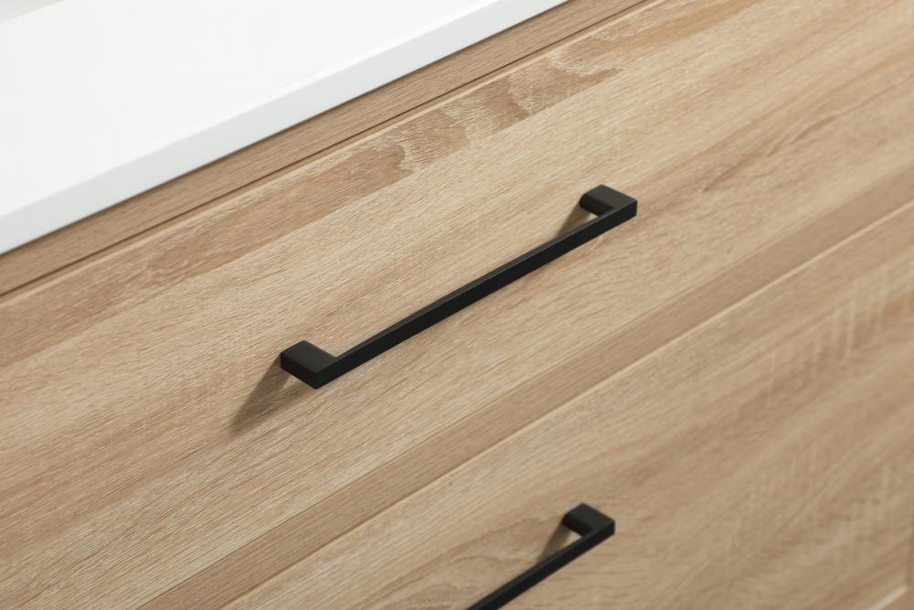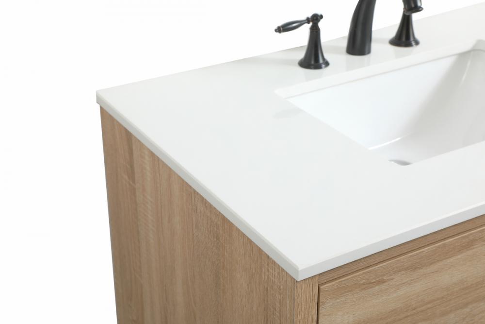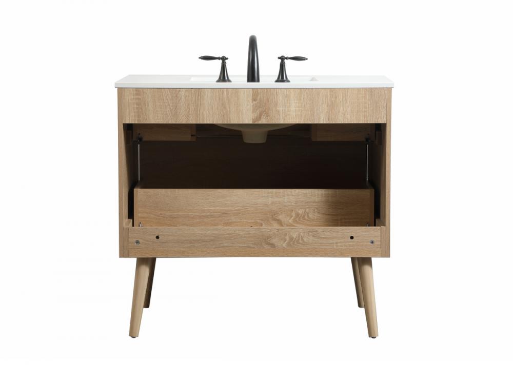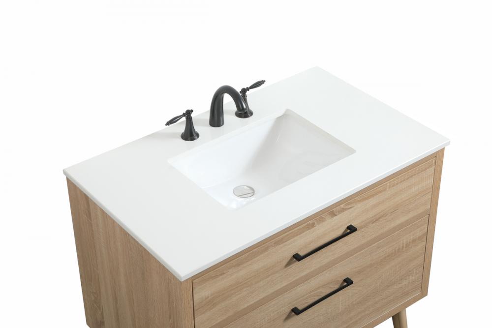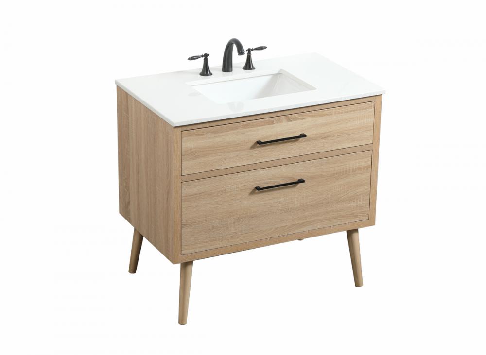 This bathroom vanity is a perfect way to outfit your home in authetic midcentury modern style. The clean lines anchors the design, while the oblique tapered cylinder legs add subtle interest. A black handle adorns the top drawer hiding the base of the undermount porcelain sink while another one allows you to pull the bottom drawer out, letting you store your bathroom necessities and toiletries. The storage drawers provide much needed function and can be used for stowing items like extra toothbrushes, hairbrushes, and other bathroom essentials to help you get ready to face the day. This vanity is a quick update for your bathroom with trendy style.