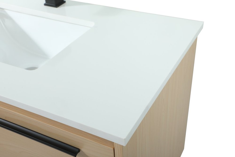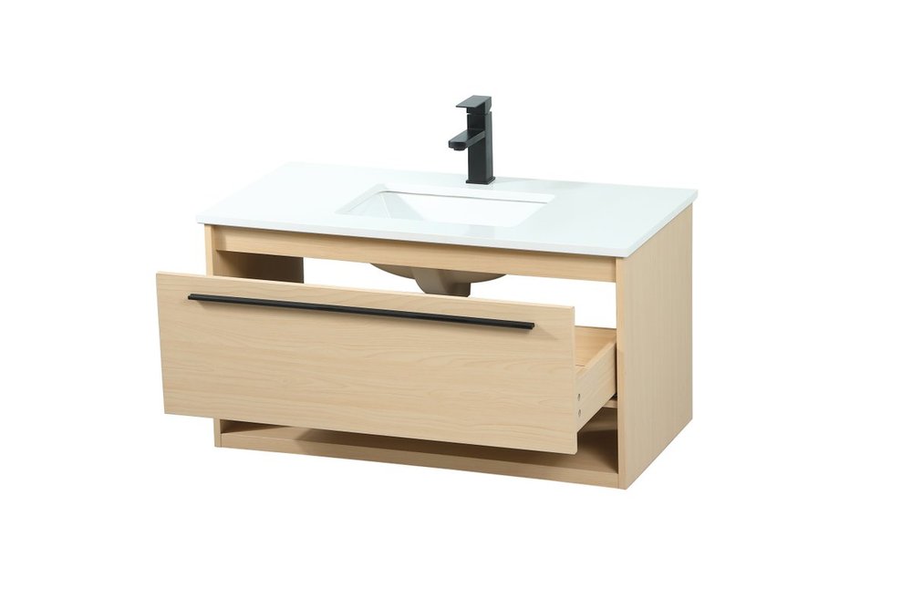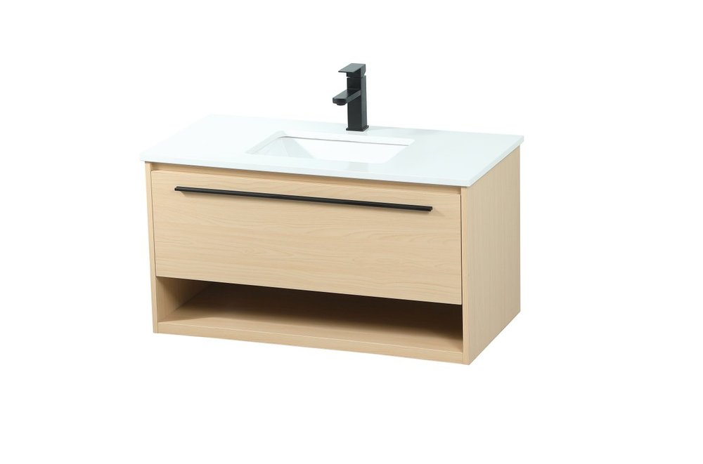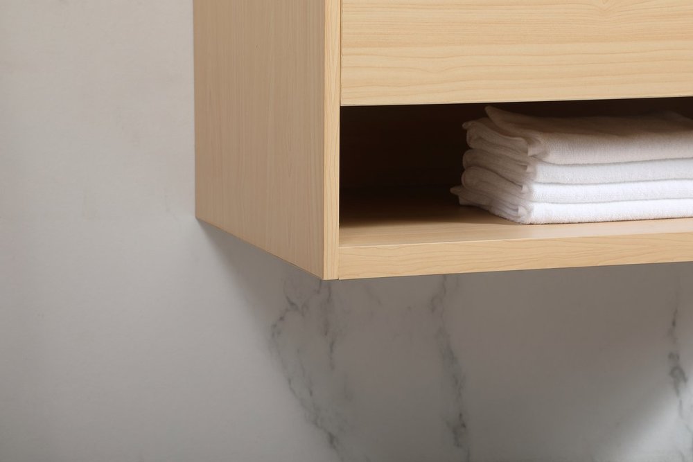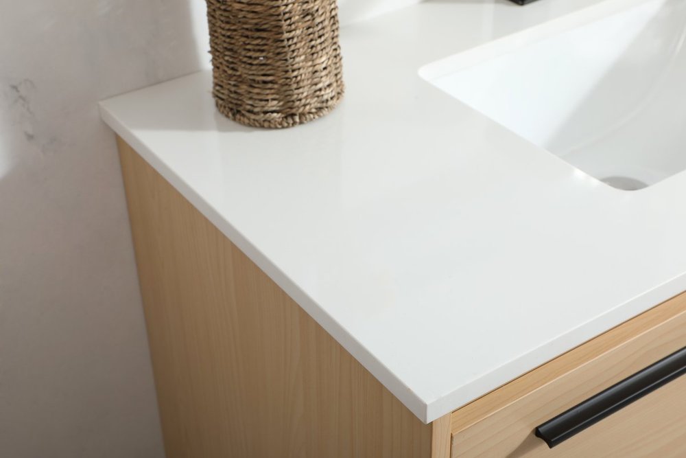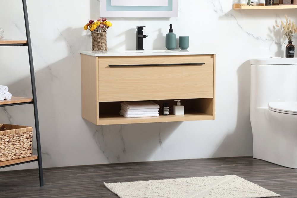 Save space and make your bathroom appear bigger with this floating vanity. Its minimal design will have you in awe, while its clean lines will leave your room feeling fresh and uncluttered. The Single u-drawer pulls out for storage while the open space below allows you to place extra towels or various other essentials. The ivory white engineered marble counter top with porcelain sink adds refined luxe while the aluminum barpull style handle adorn the vanity face.