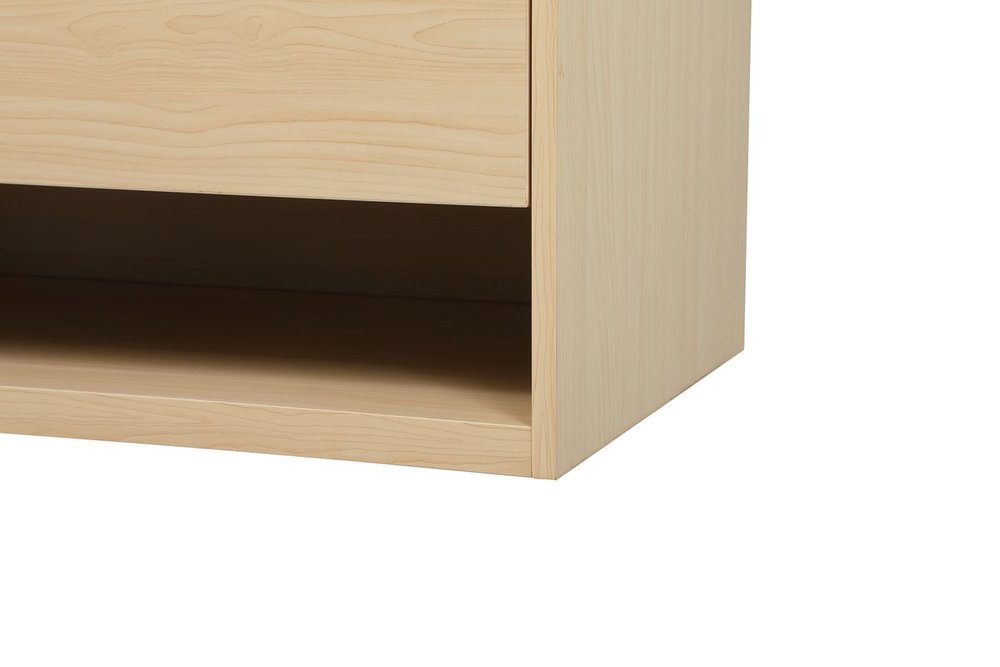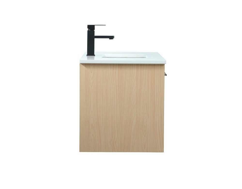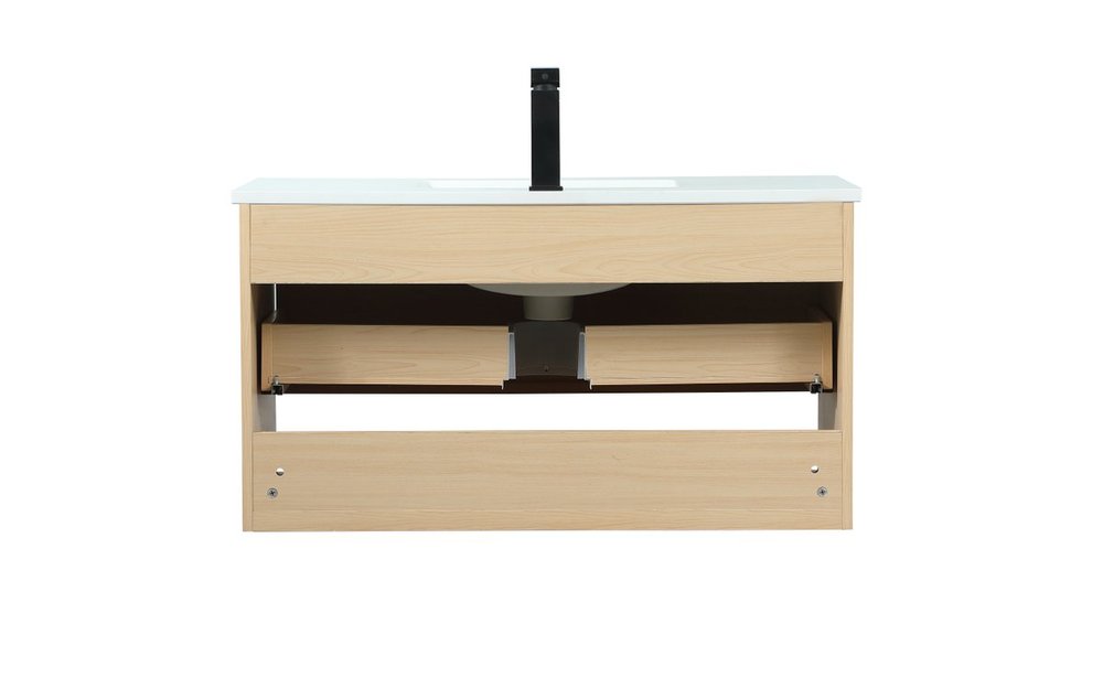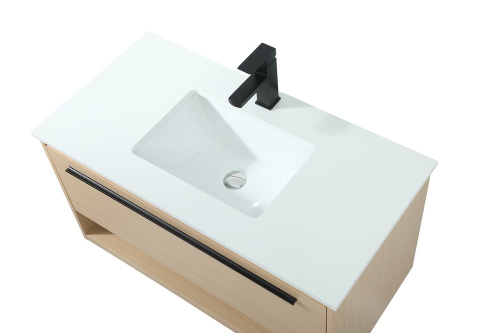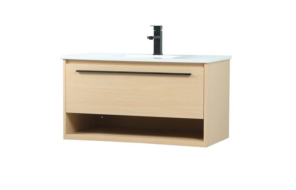 Save space and make your bathroom appear bigger with this floating vanity. Its minimal design will have you in awe, while its clean lines will leave your room feeling fresh and uncluttered. The Single u-drawer pulls out for storage while the open space below allows you to place extra towels or various other essentials. The ivory white engineered marble counter top with porcelain sink adds refined luxe while the aluminum barpull style handle adorn the vanity face.