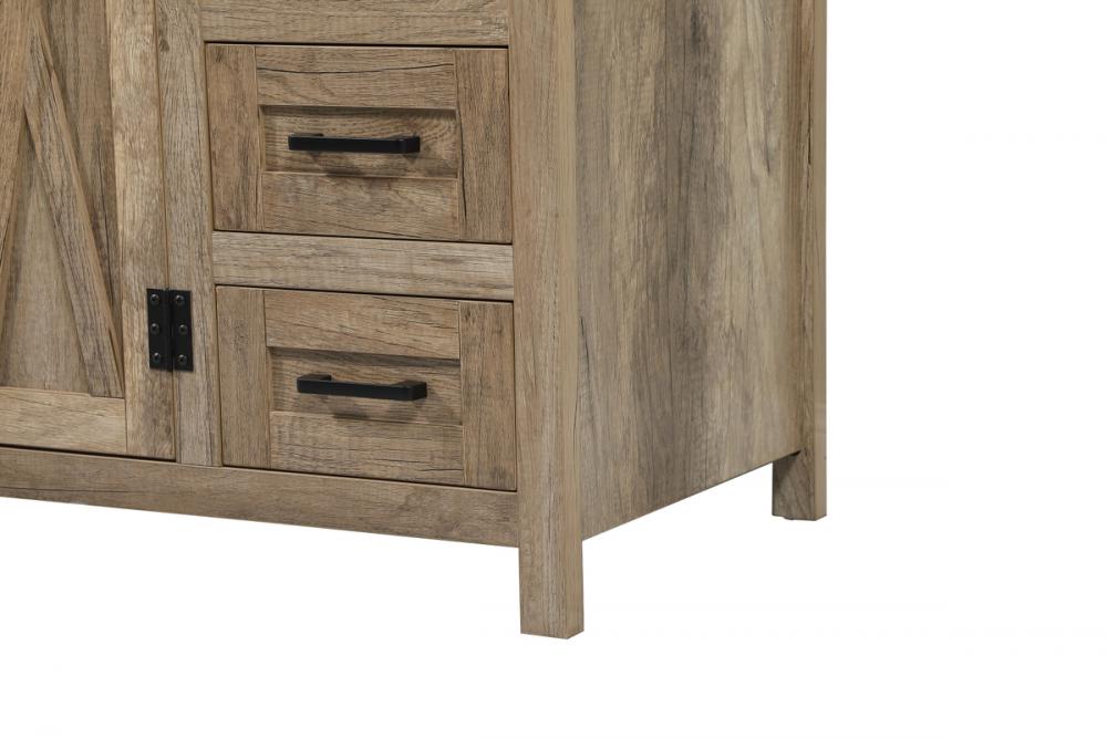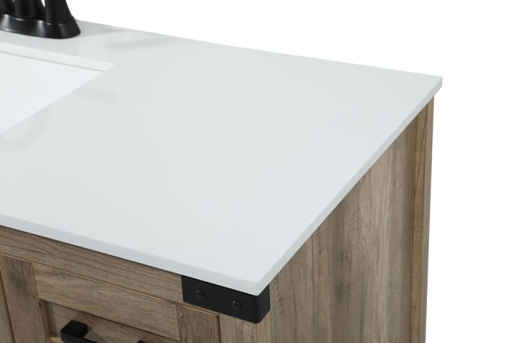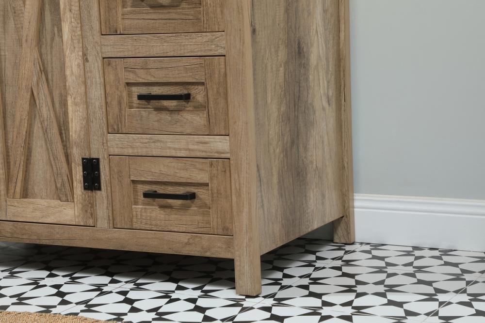 Reminiscent of barn doors, the two door cabinet and four drawers adds both stylistic charm and function with its plethora of storage options for all your bathroom essentials. Whether for your bathroom or the guests', everyone will marvel at its classic look for traditional and farmhouse aesthetics. A slab of engineered marble rounds out the piece up top, as well as the porcelain under mount sink and predrilled faucet holes. This vanity arrives fully assembled.
