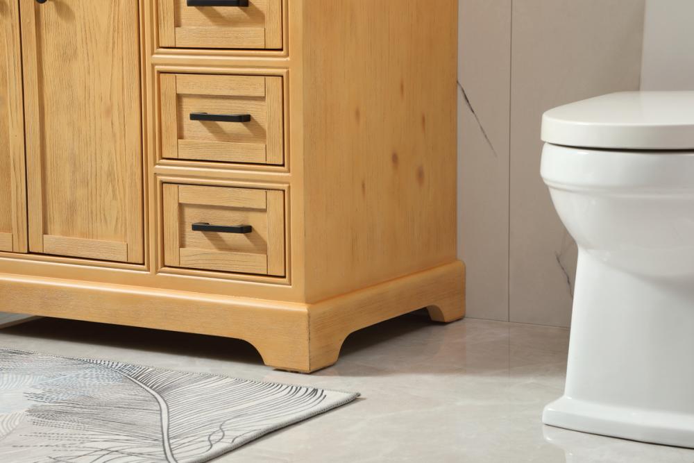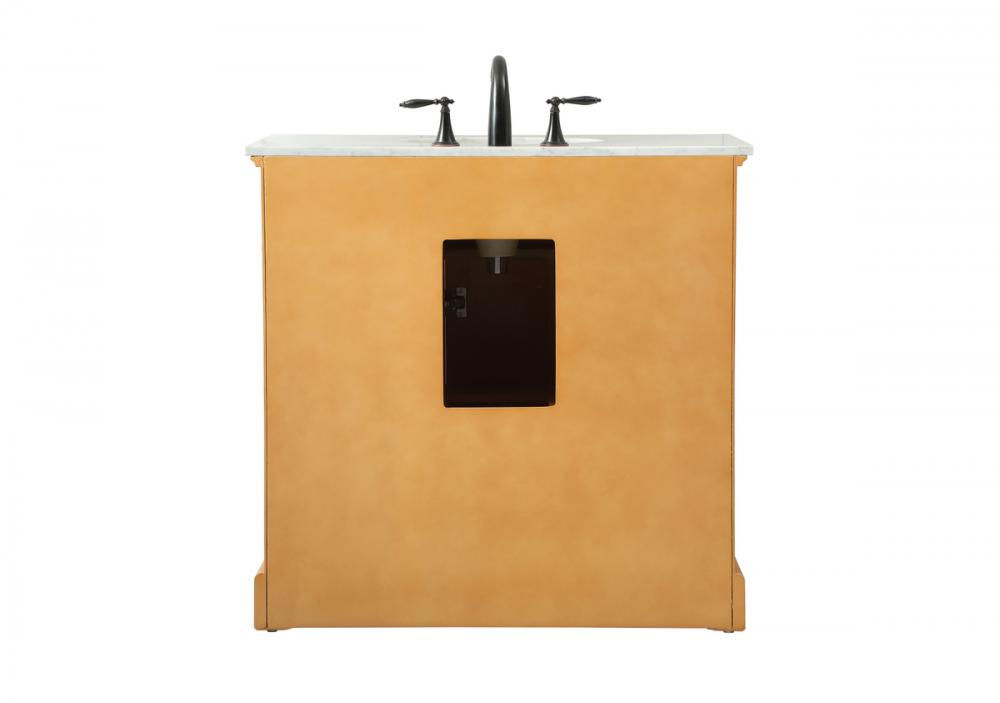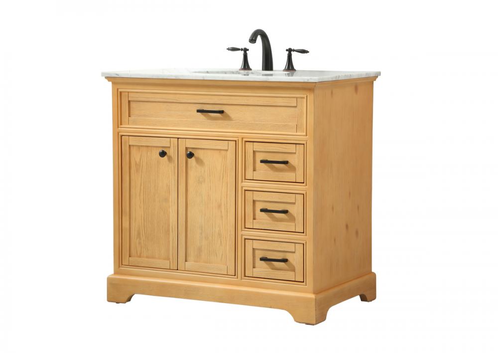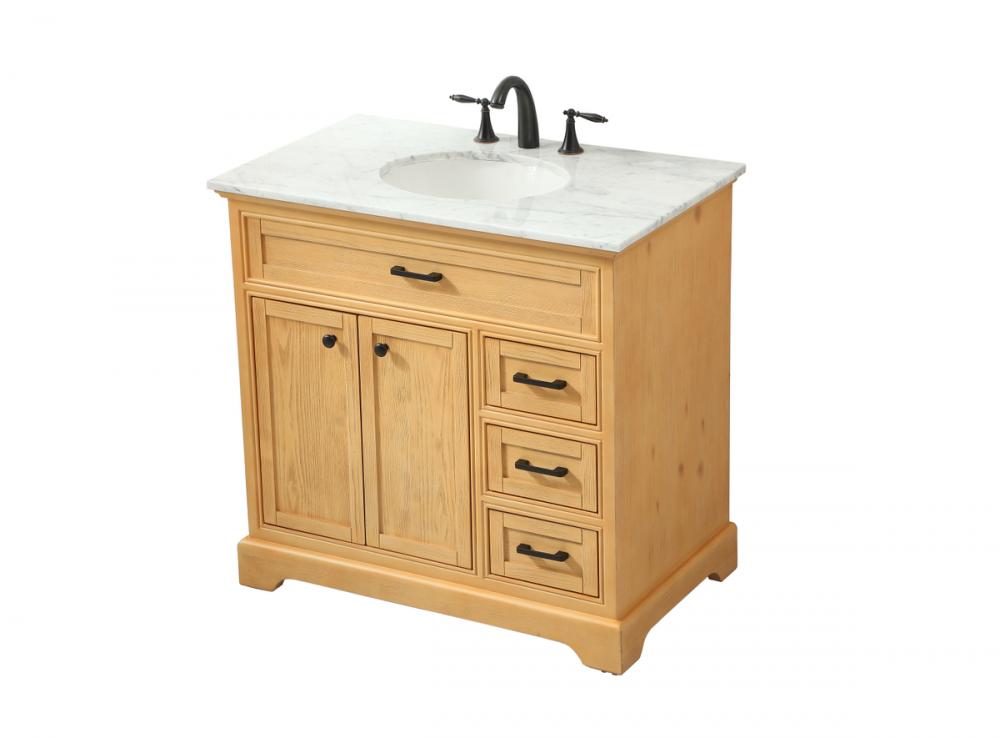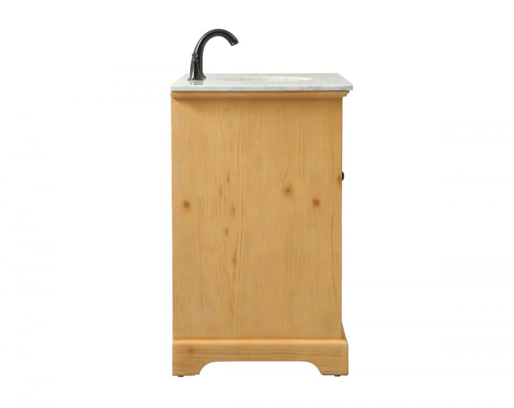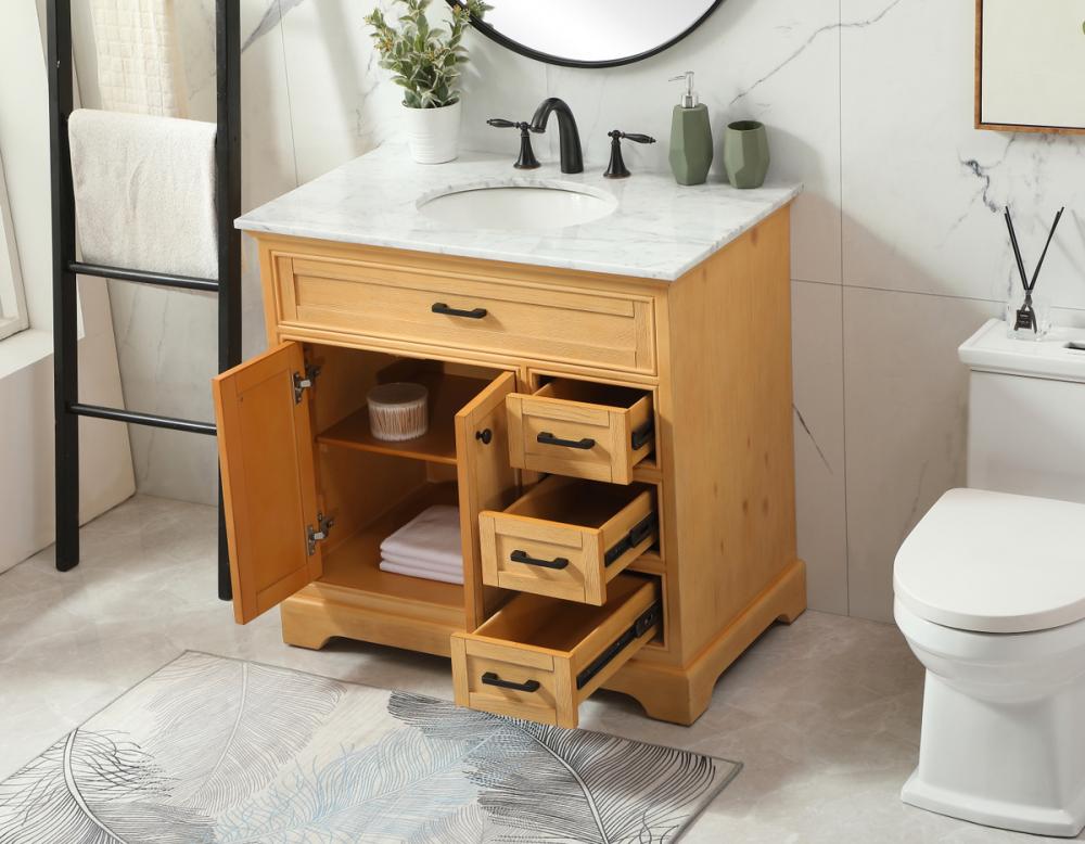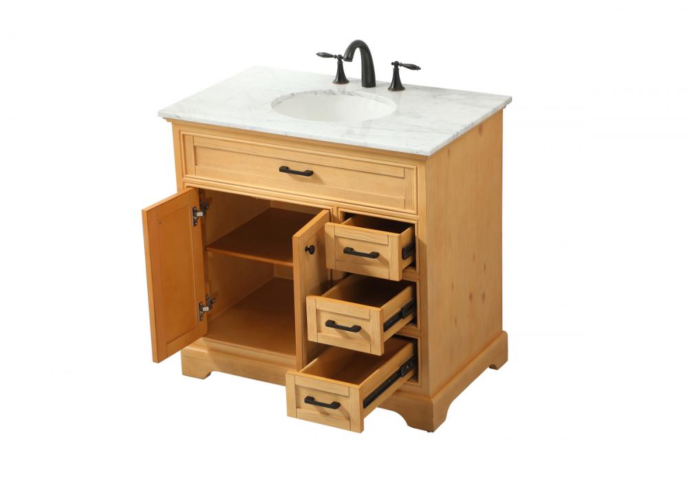 Clean lines and classic form can truly add a fresh look to your bathroom or powder room. This vanity, complemented by round hardware, will surely charm you with its confident style and subtle charisma. This vanity can store all of your bathroom toiletries, from extra towels to make up essentials. The vanity is crowned with carrara white marble and includes a porcelain undermount sink--adding both function and form that will truly amaze.