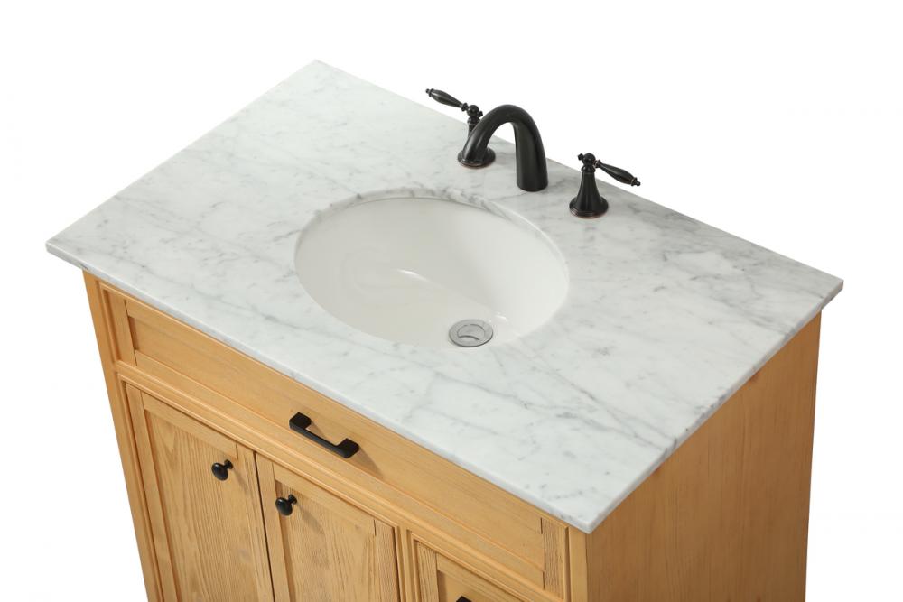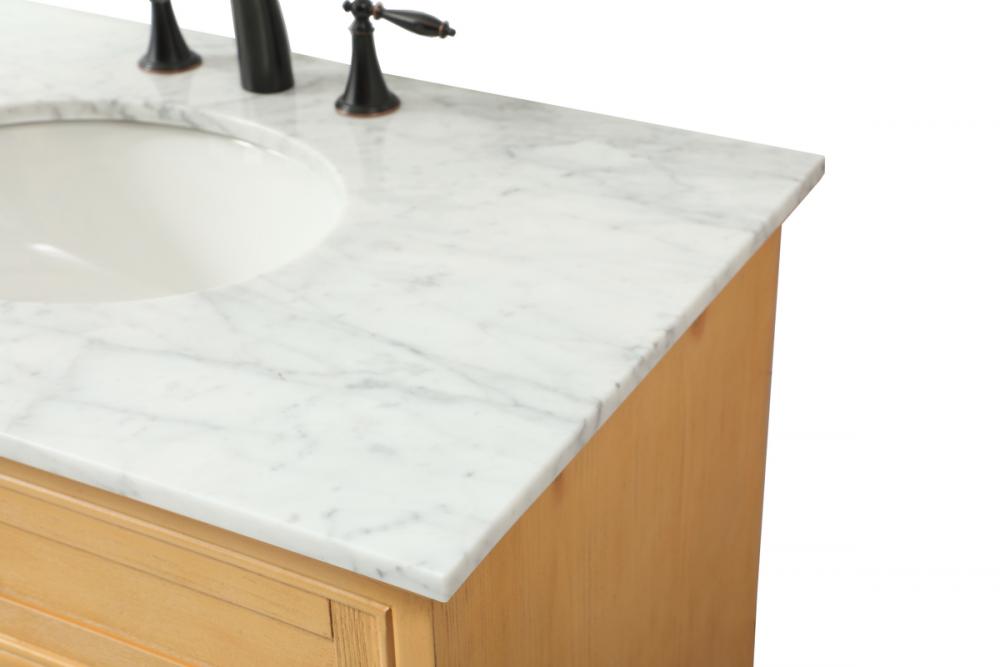 Comes with an undermount porcelain sink and a carrara white marble countertop