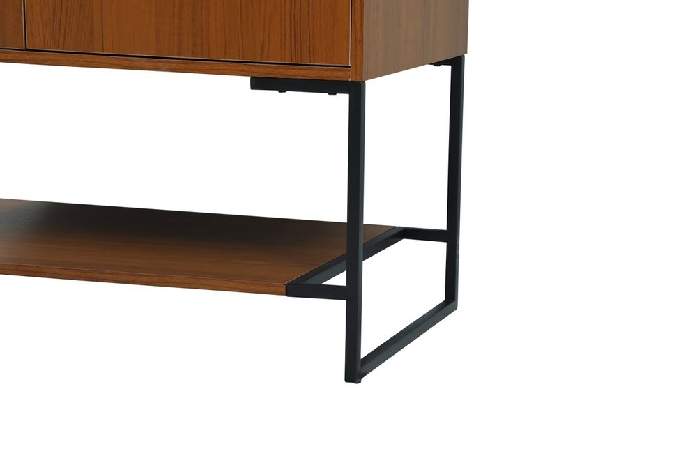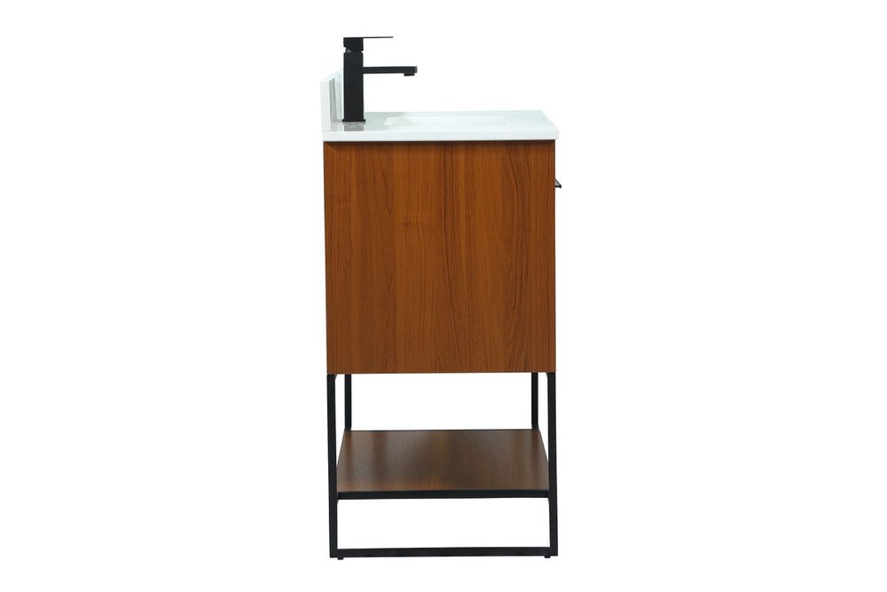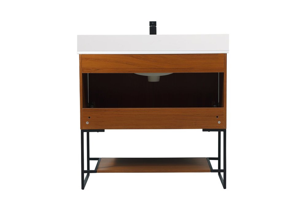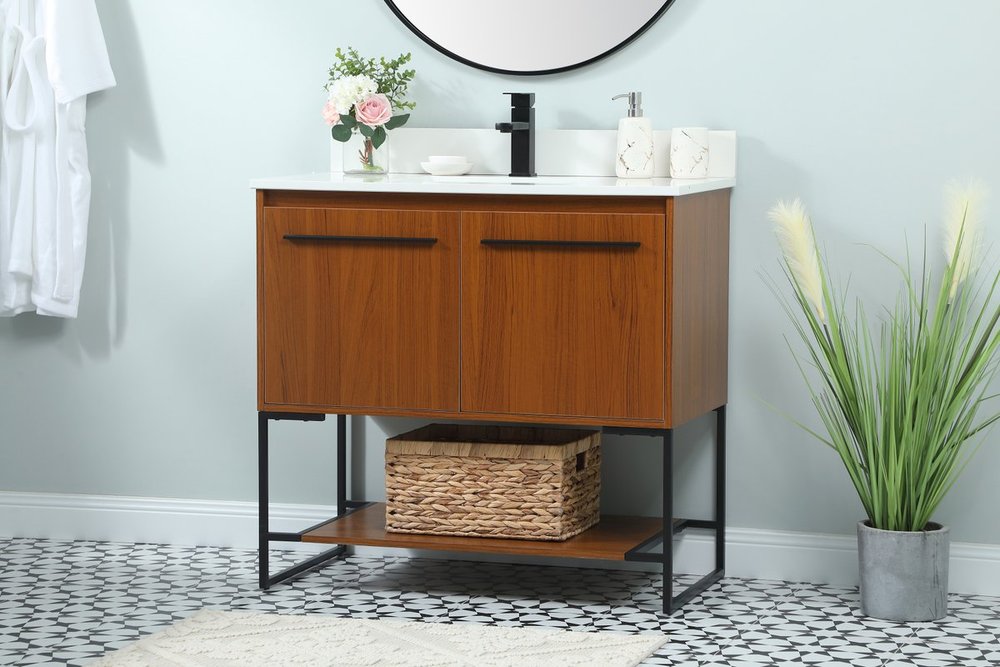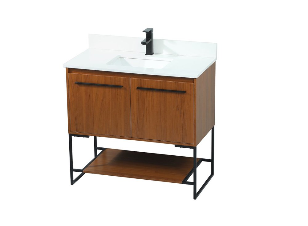 Live in modern comfort with this 36" teak finish vanity. Dressed in a teak and sleek black metal hardware, its contemporary style will have your bathroom or powder room elevated in industrial sophistication. The open shelf at the base and two doors reveal ample storage space for your bathroom essentials and miscellany. Clean lines create its own visual interest, adding trendy looks to your already chic room. Comes with a matching backsplash to complete the look and protects your wall.