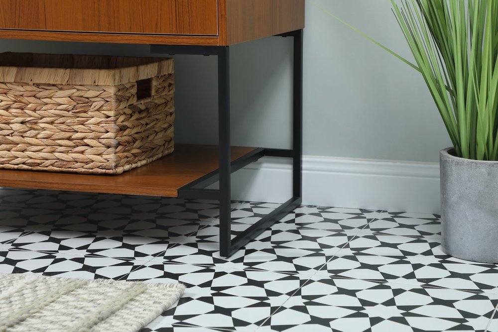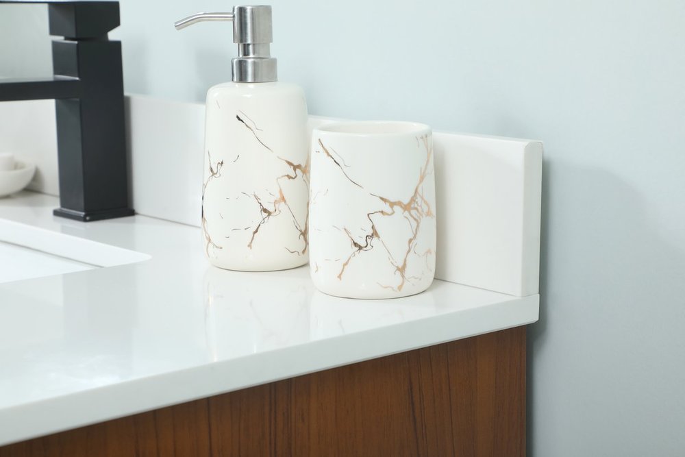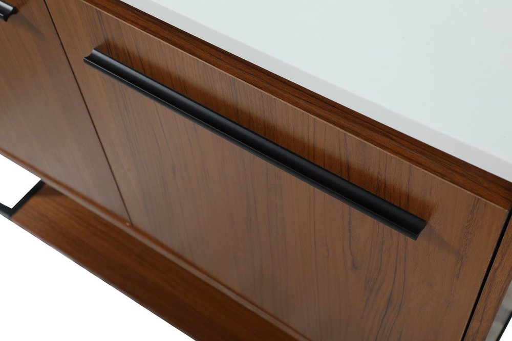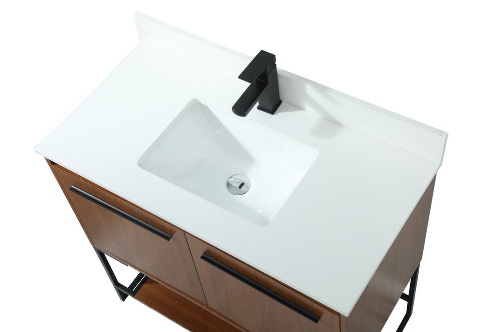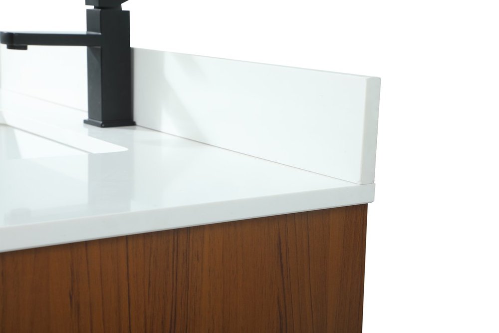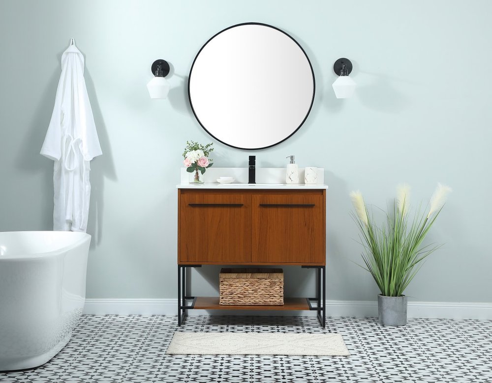 Live in modern comfort with this 36" teak finish vanity. Dressed in a teak and sleek black metal hardware, its contemporary style will have your bathroom or powder room elevated in industrial sophistication. The open shelf at the base and two doors reveal ample storage space for your bathroom essentials and miscellany. Clean lines create its own visual interest, adding trendy looks to your already chic room. Comes with a matching backsplash to complete the look and protects your wall.