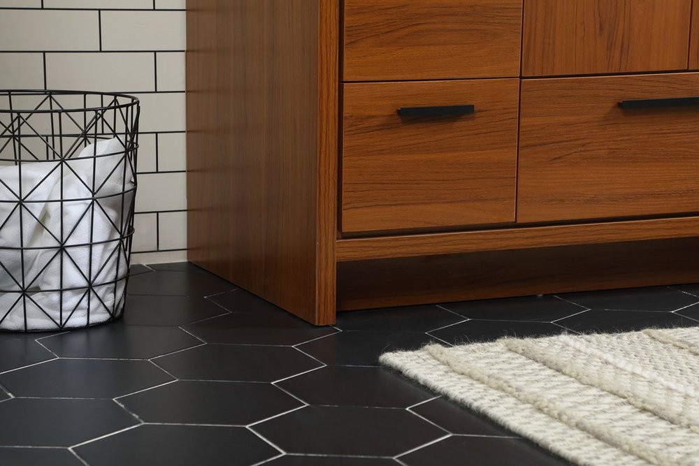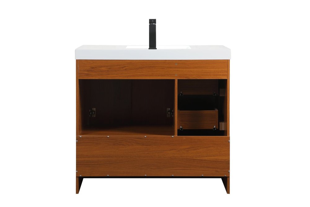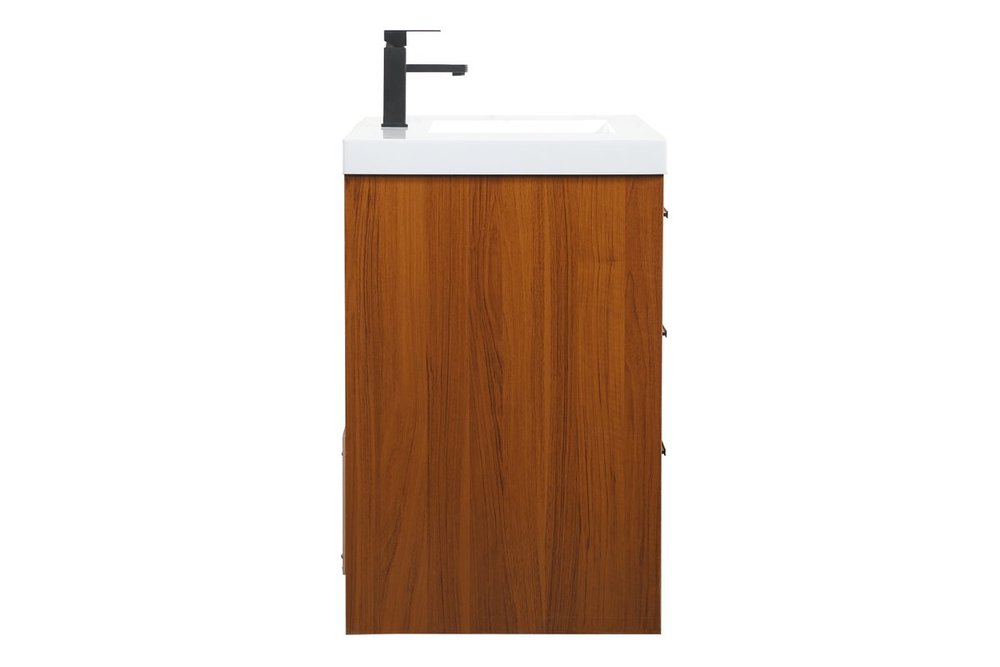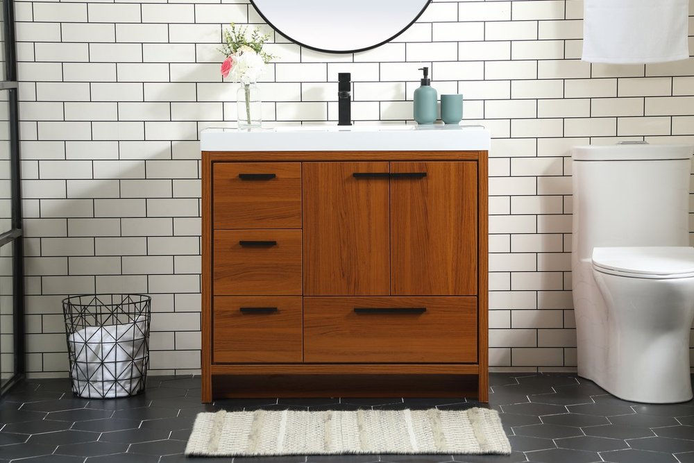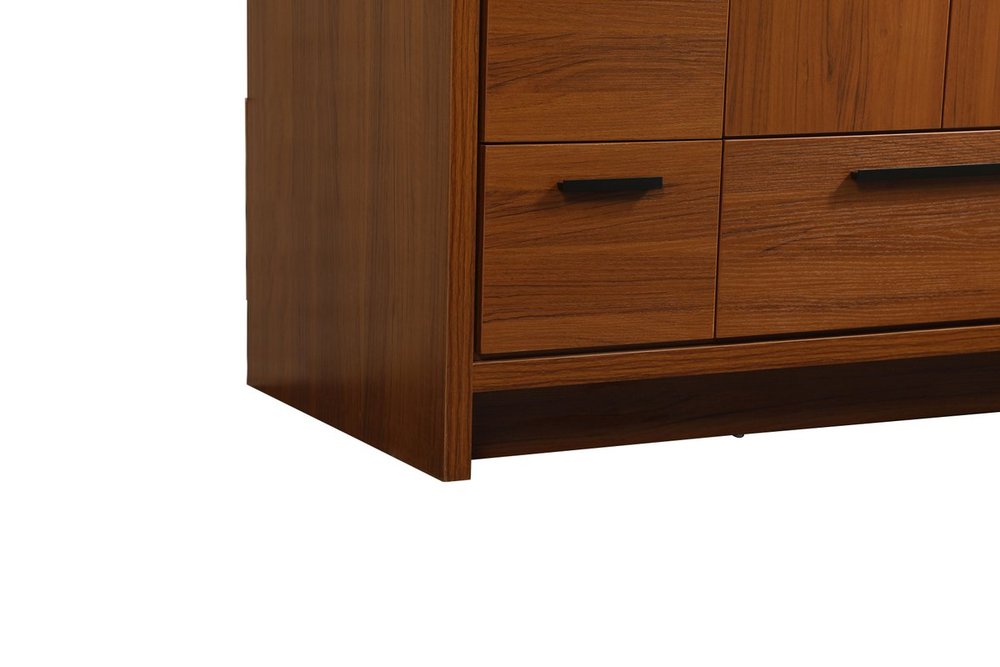 Modern sophistication is defined within the teak finish and black barpulls of this vanity. Its length makes it the perfect addition to any sized home, and saves space with its storage area hidden behind the double cabinet doors and one bottom drawers. Topped with a highly durable resin white counter top and an integrated sink, this modern design will add everlasting class to your bathroom and powder room.