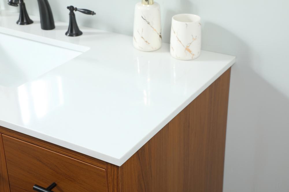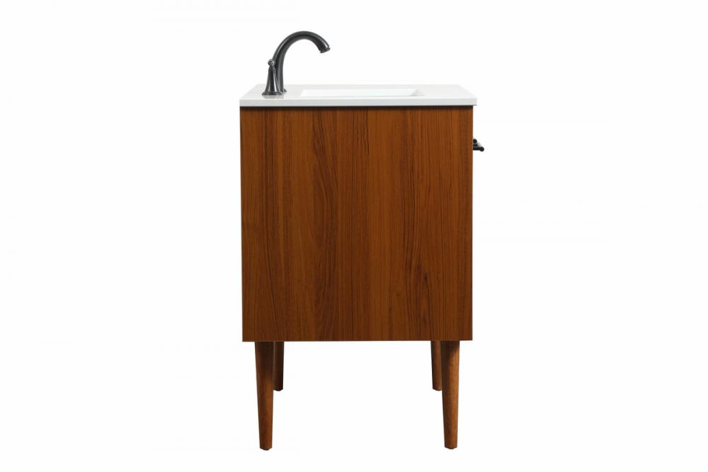 Delve into a world of minimalistic fashion and contemporary styling with this midcentury modern vanity. The clean lines anchors the design, while the straight tapered cylinder legs add subtle interest. Bar pull handle adorns the soft closing door hiding the base of the rectangular porcelain sink and letting you store your bathroom necessities and toiletries. Three soft closing drawers add plenty of storage option. Whether you want to use this as a floating vanity or a freestanding vanity, the choice is yours. The durable ivory white engineered marble countertop complements the manufactured wood base vanity and is built to last.