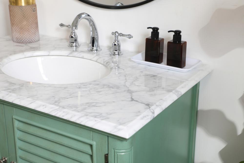 Distressed vintage mint finish with a luxurious carrara white marble countertop